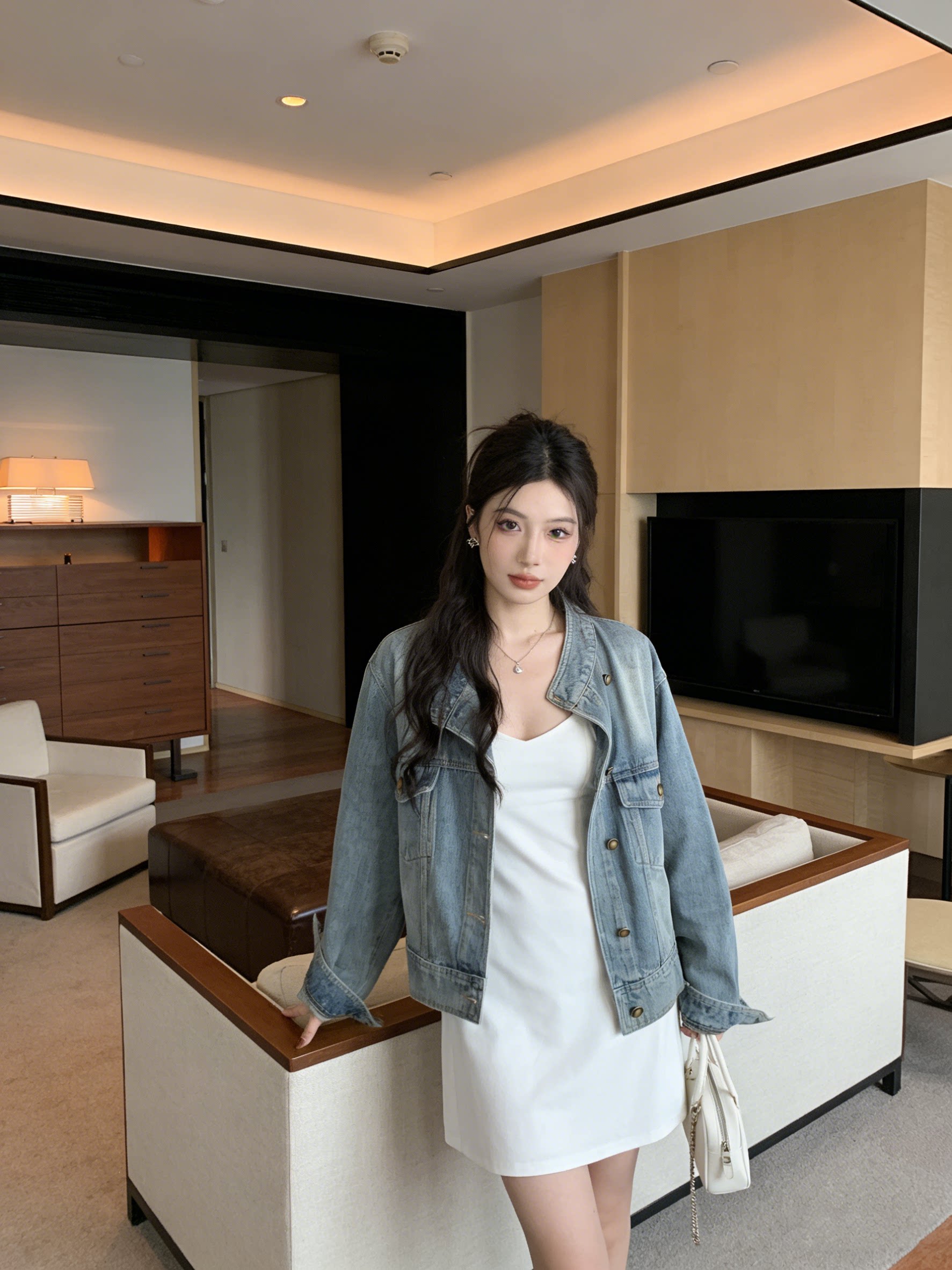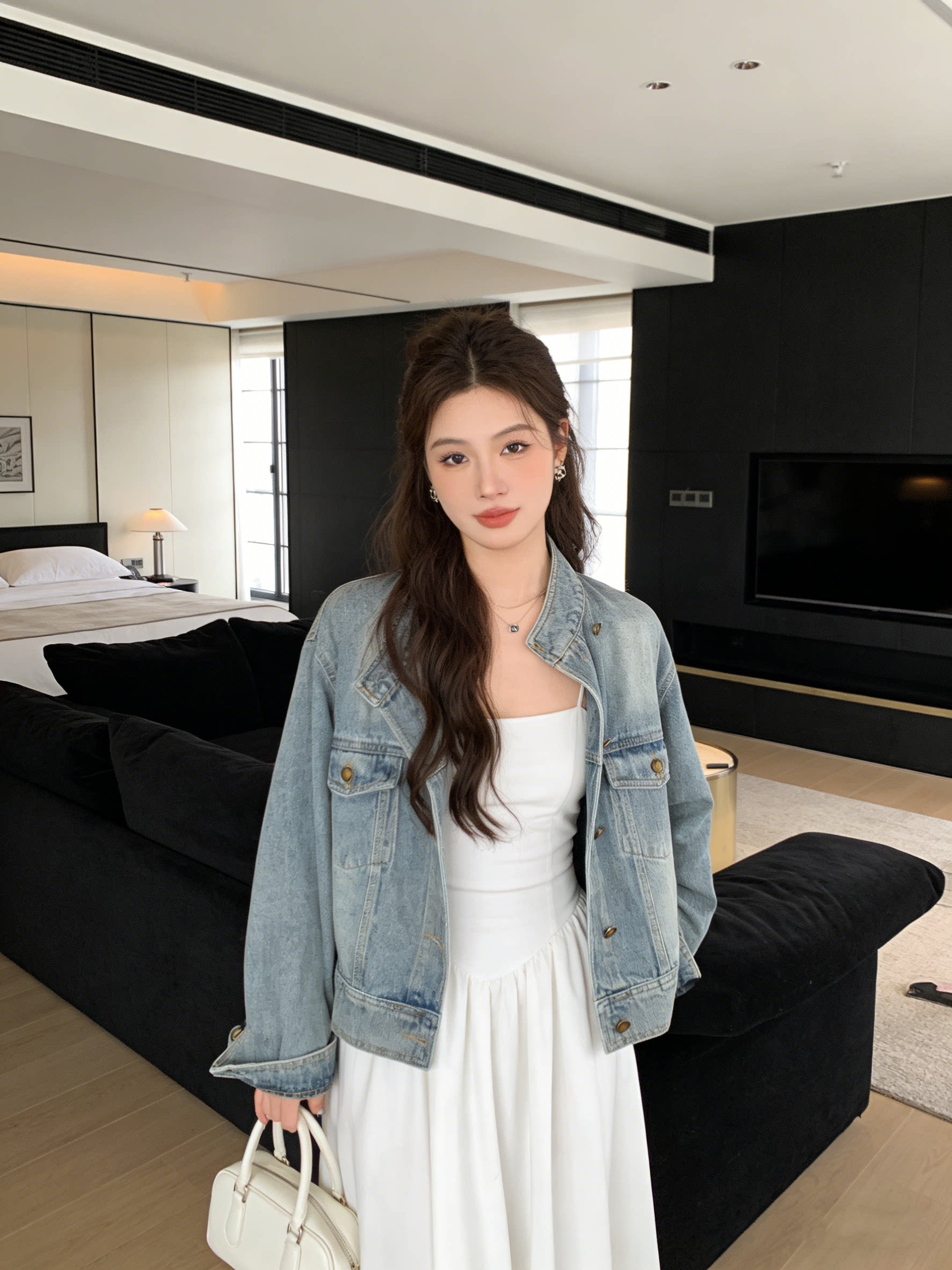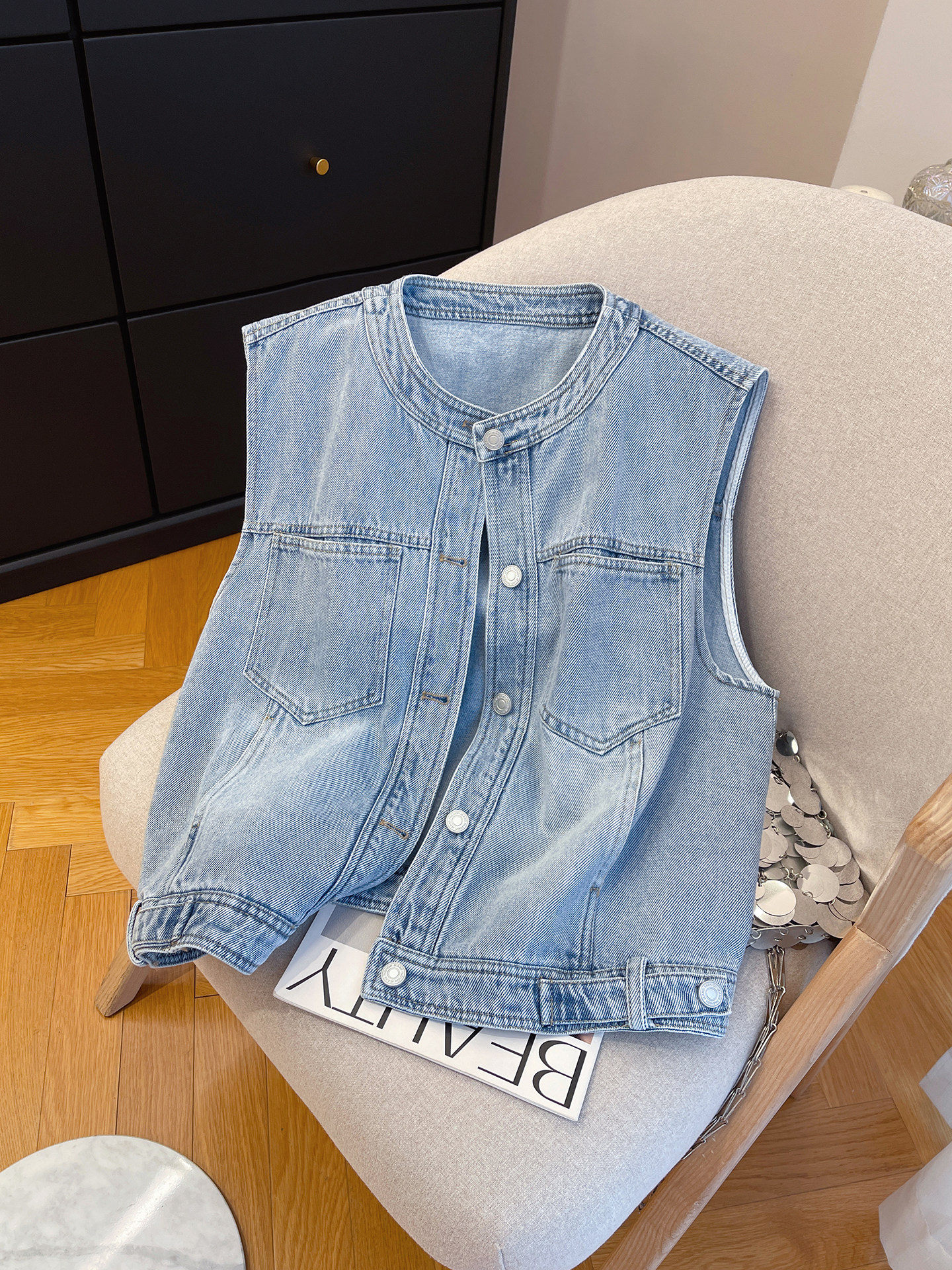 2026 새로운 레트로 캐주얼 세련된 외국 가스 스택 착용 외출용 작은 스탠드 칼라 데님 베스트 조끼 여성 코트 봄 드레스