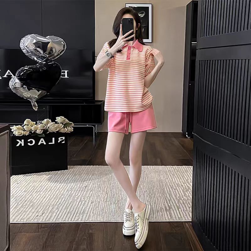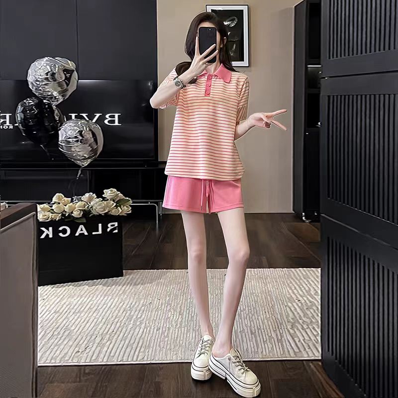 인터넷 유명인 튀김 거리 패션 캐주얼 스포츠 슈트 여성 여름 루즈핏 POLO 칼라 반팔 맨위 반바지 투피스 세트 트렌디