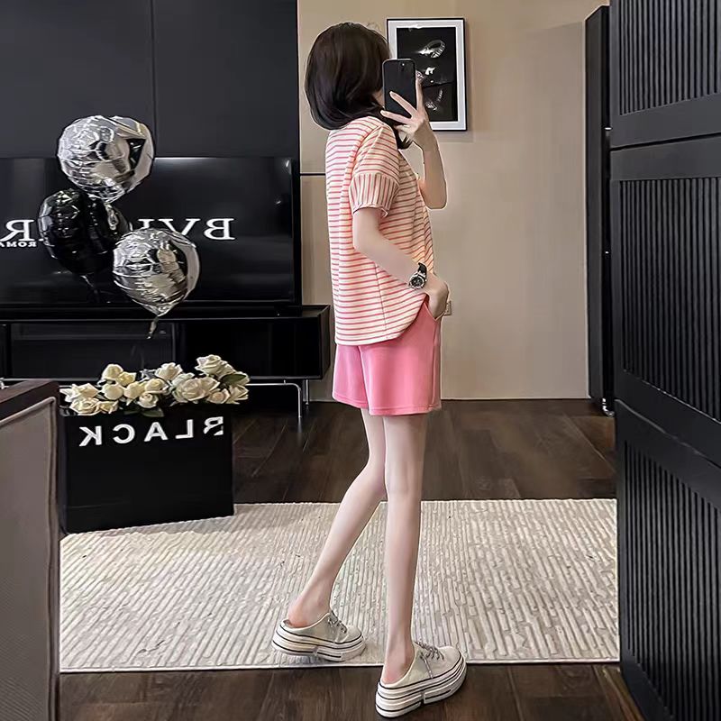 2026 여름 폭발 캐주얼 스포츠 슈트 여성 외국 가스 연령 감소 빨간색 스트라이프 반팔 티셔츠 반바지 투피스 세트