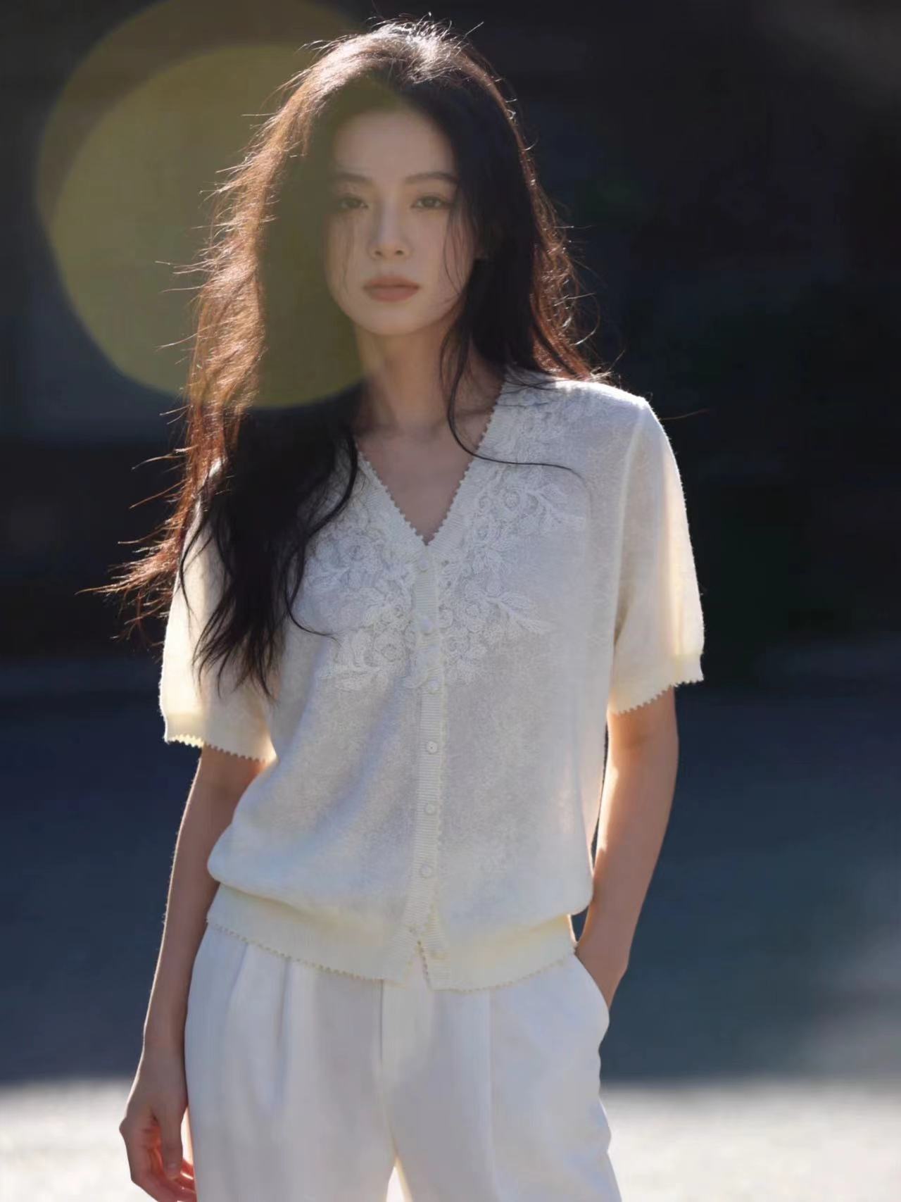 고급 얇은 스타일 프랑스식 V넥 레이스 봄 여름 새로운 패치워크 반팔 니트 오픈 가디건 여성 루즈핏 다용도 맨위 여성