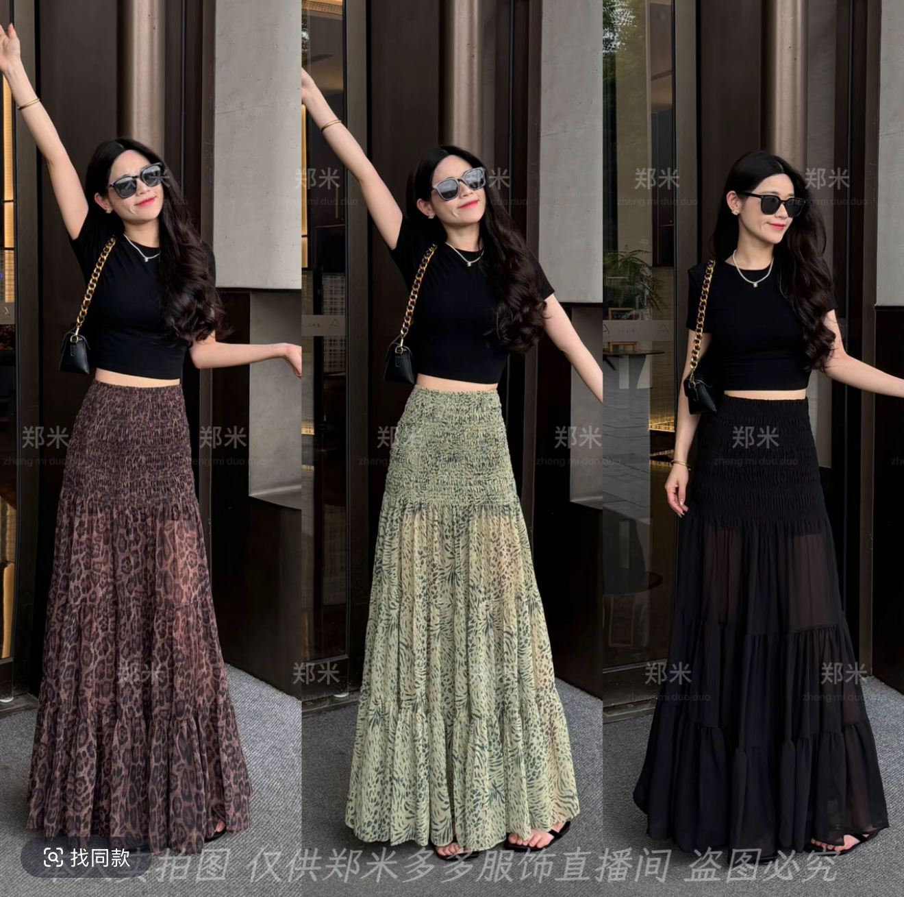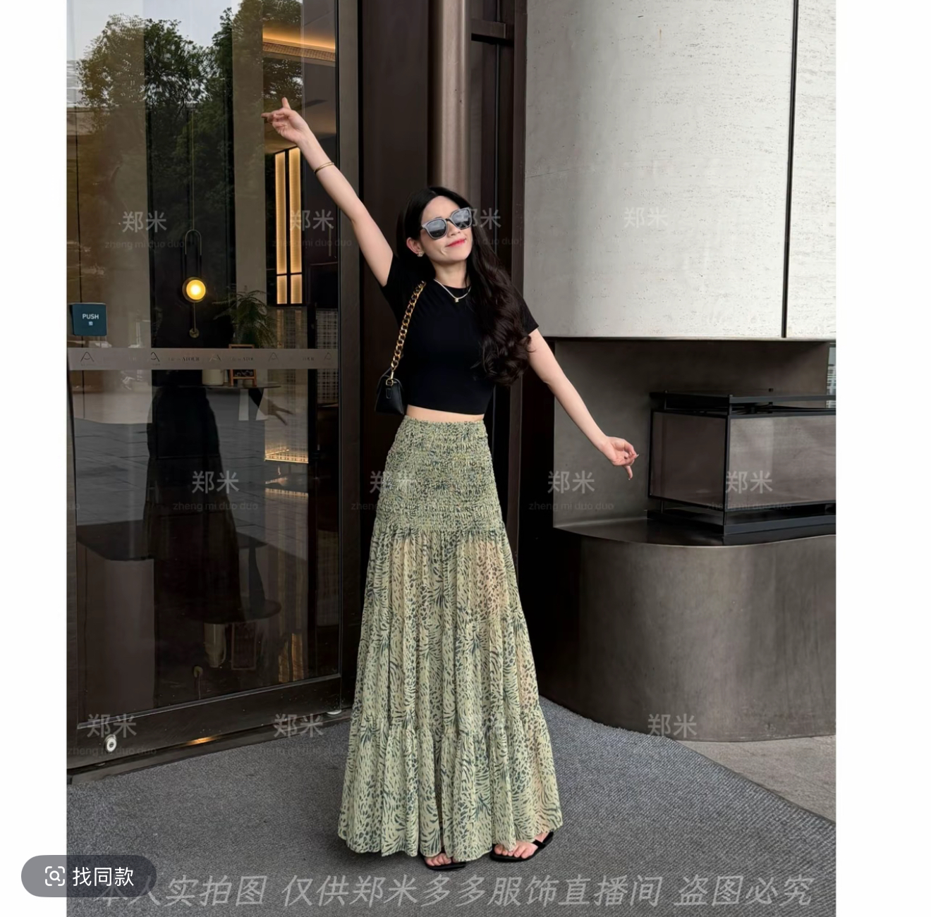 레트로 프린트 하이웨이스트 한 마디 반신 스커트 여름 새로운 고급 센스 자이언트 잘 생긴 슬림해 보이는 품격 길다 치마 세트