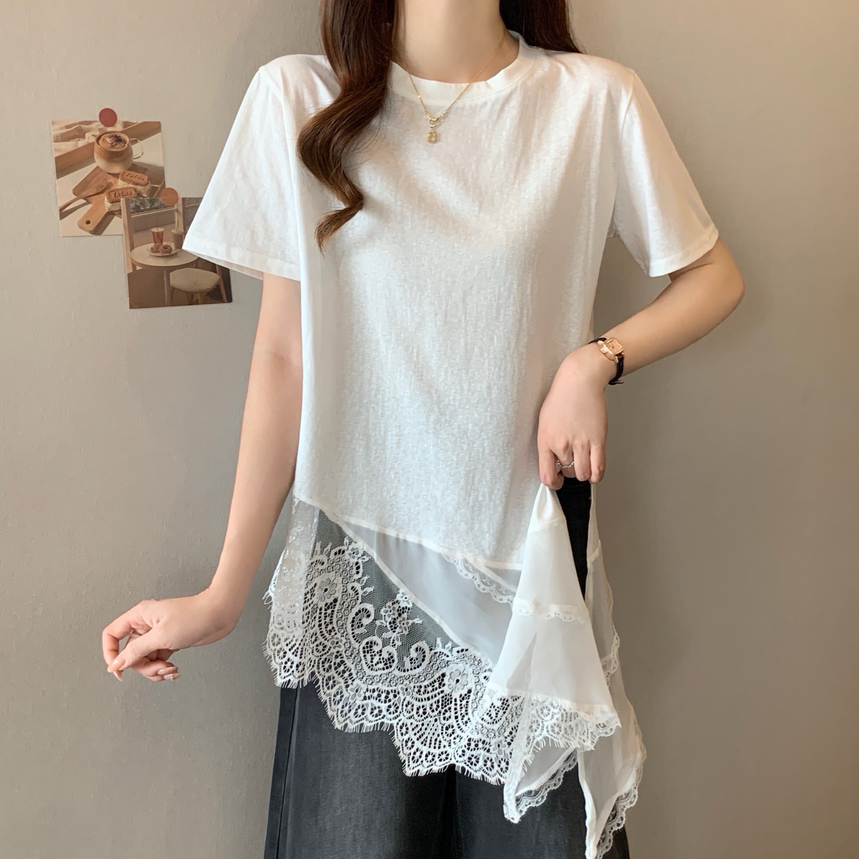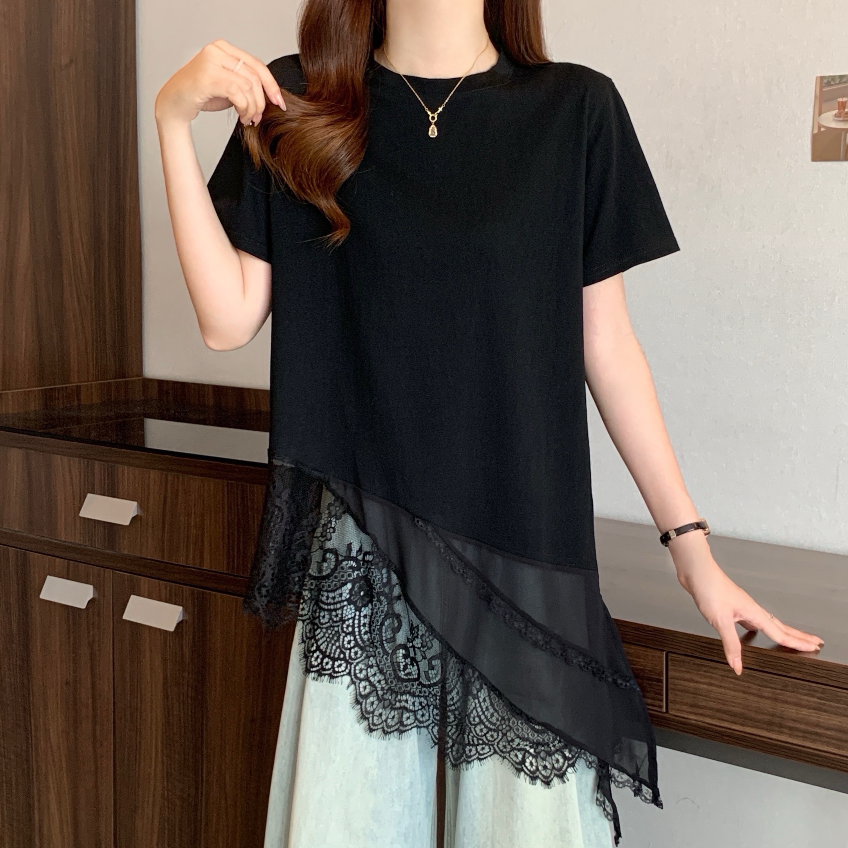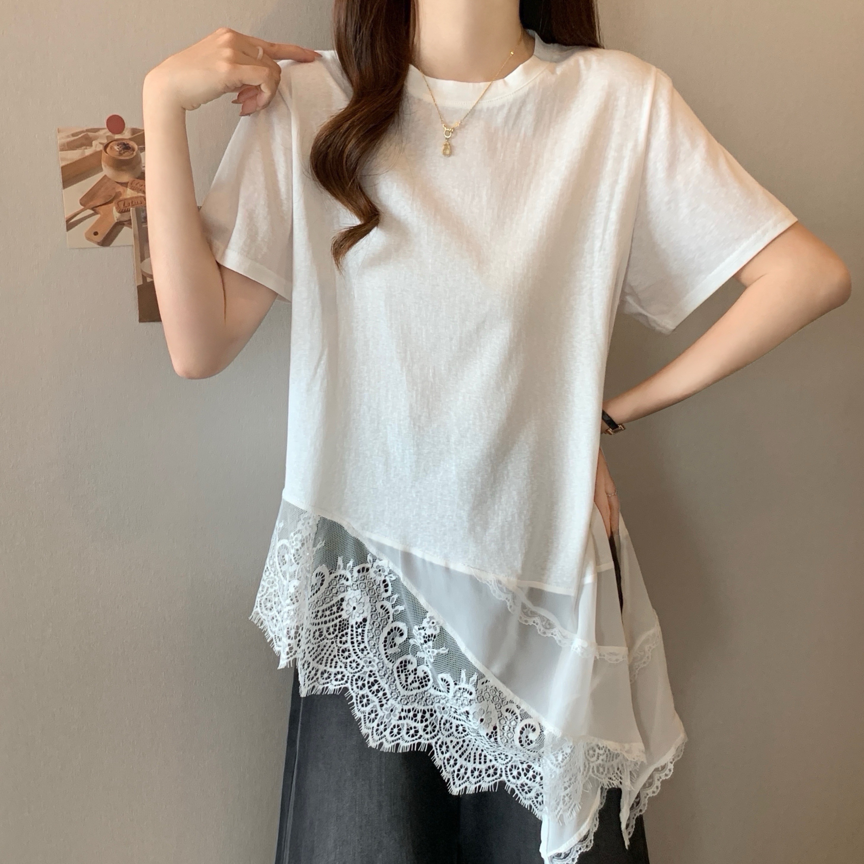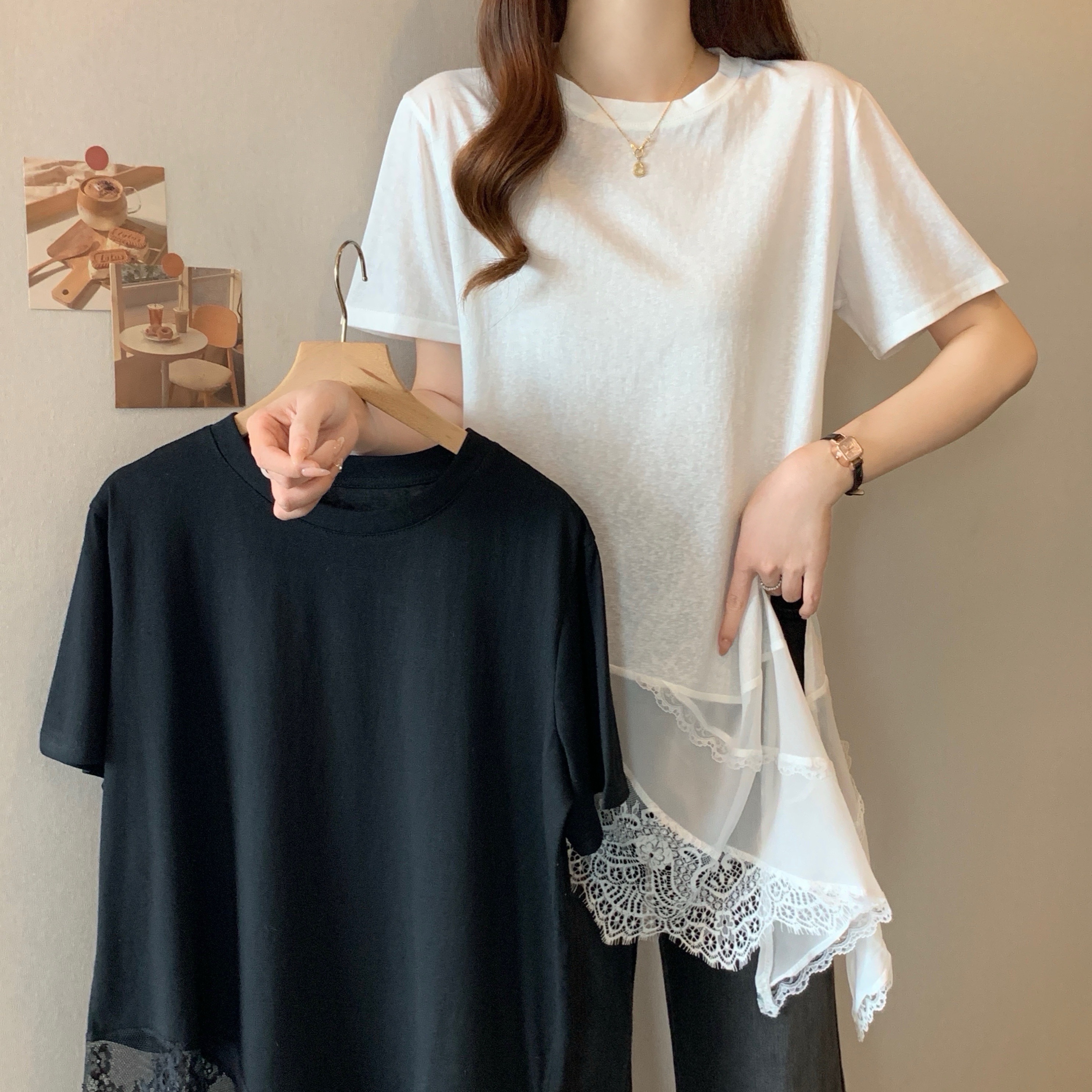 실사 빅 사이즈 여성 의류 지방 mm 봄 여름 디자인 센스 패치워크 레이스 불규칙 루즈핏 티셔츠 맨위 기본 셔츠