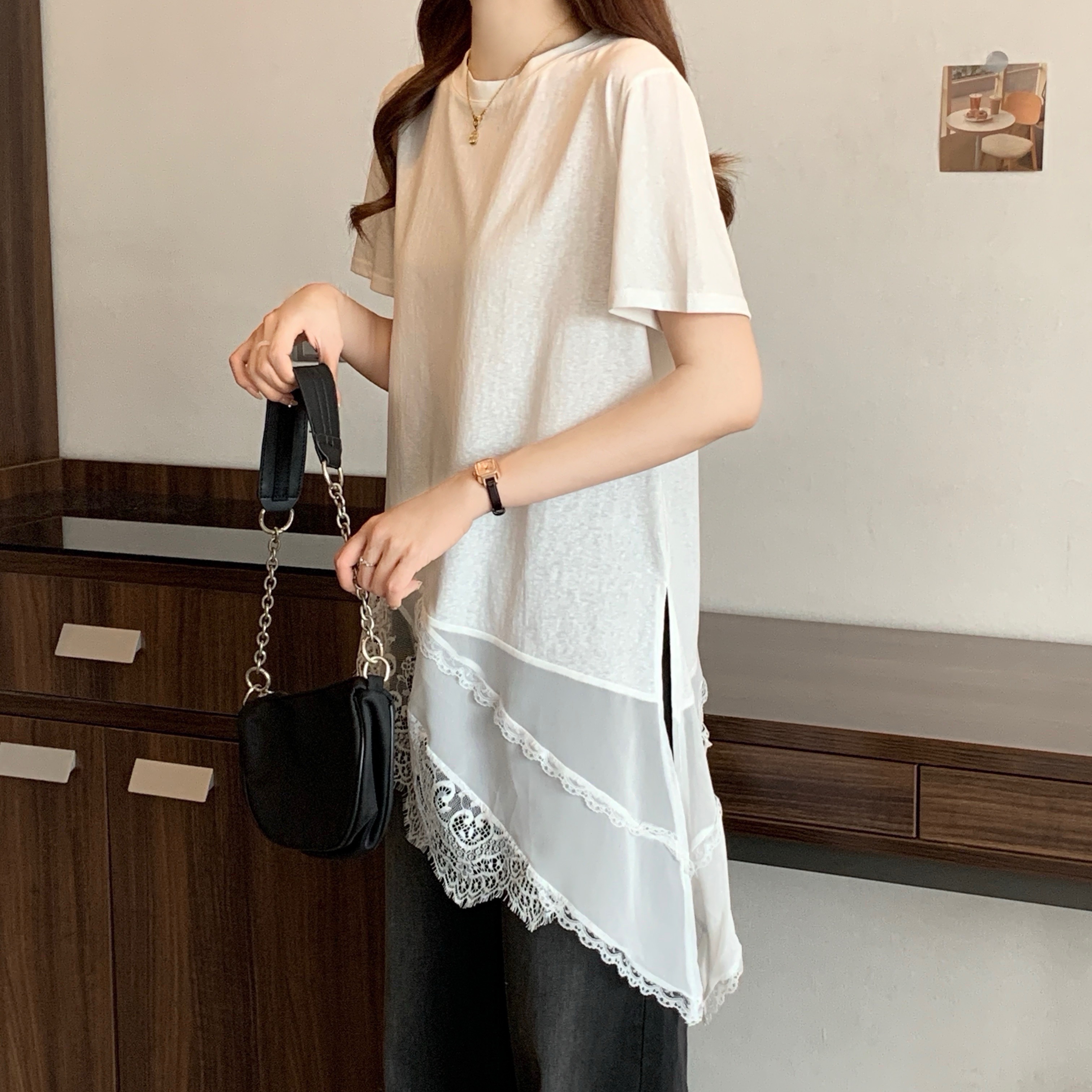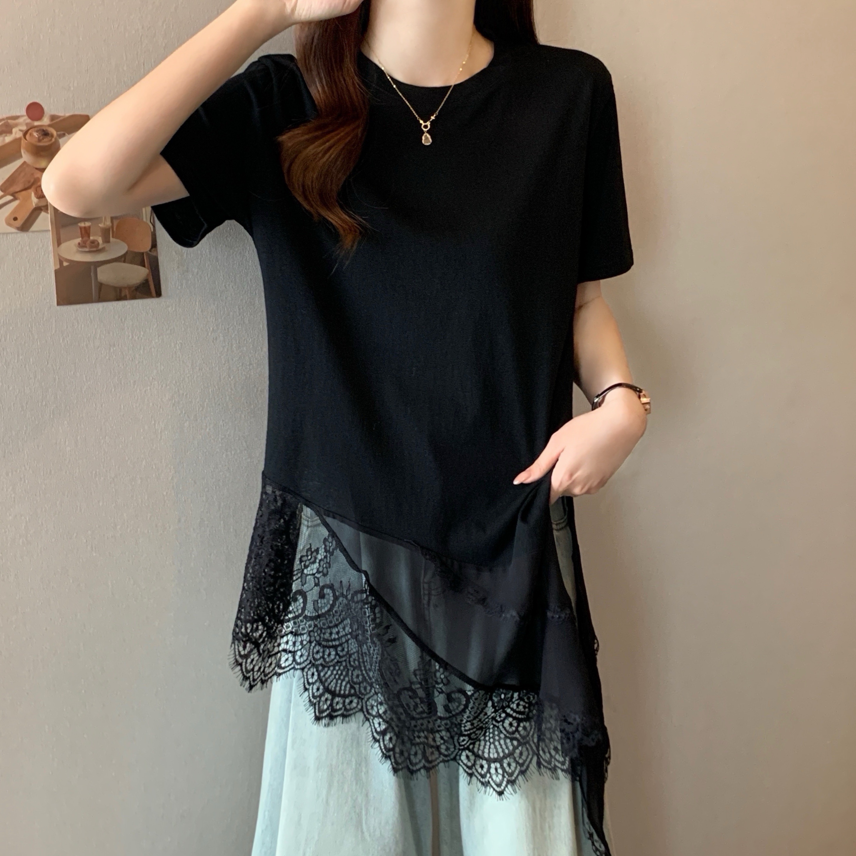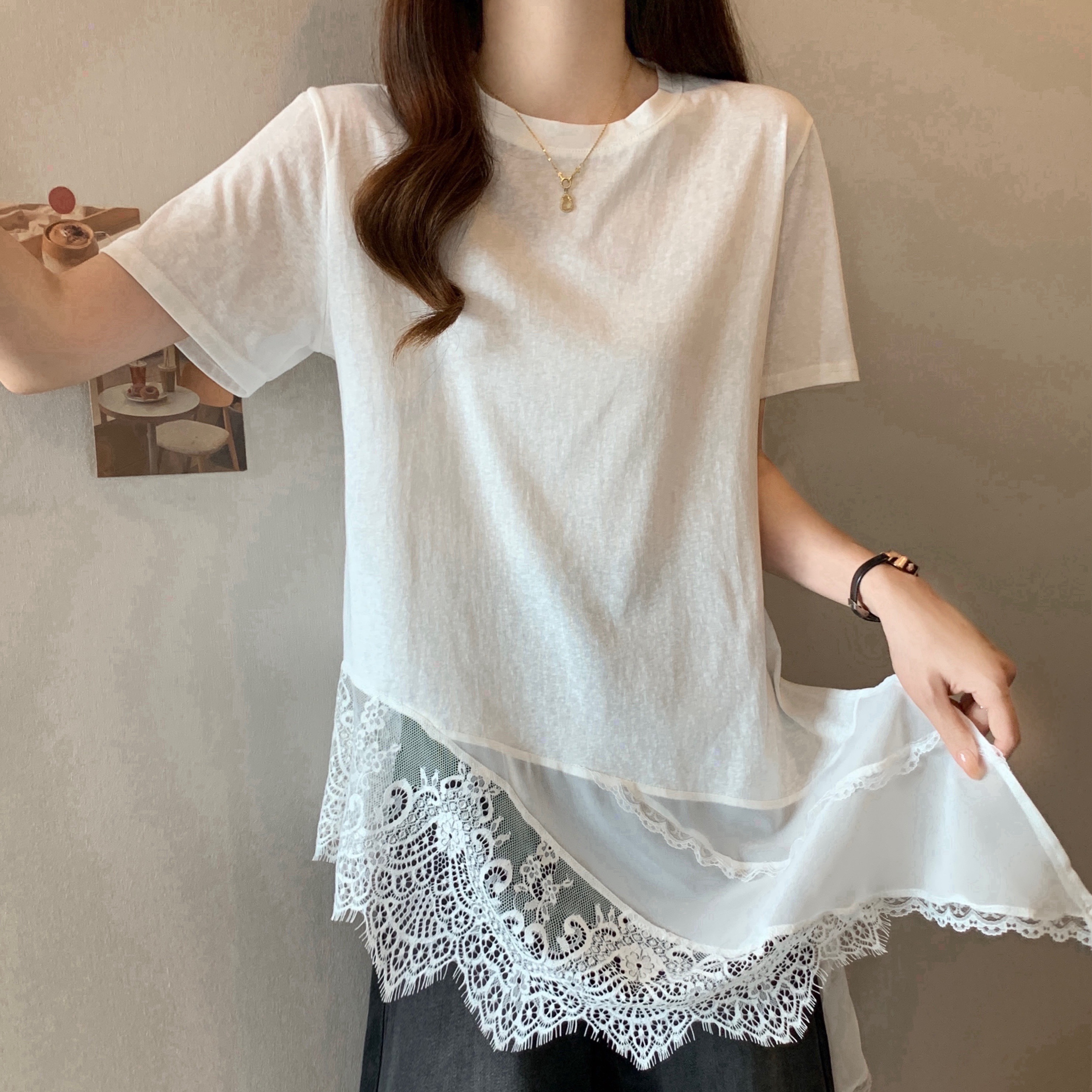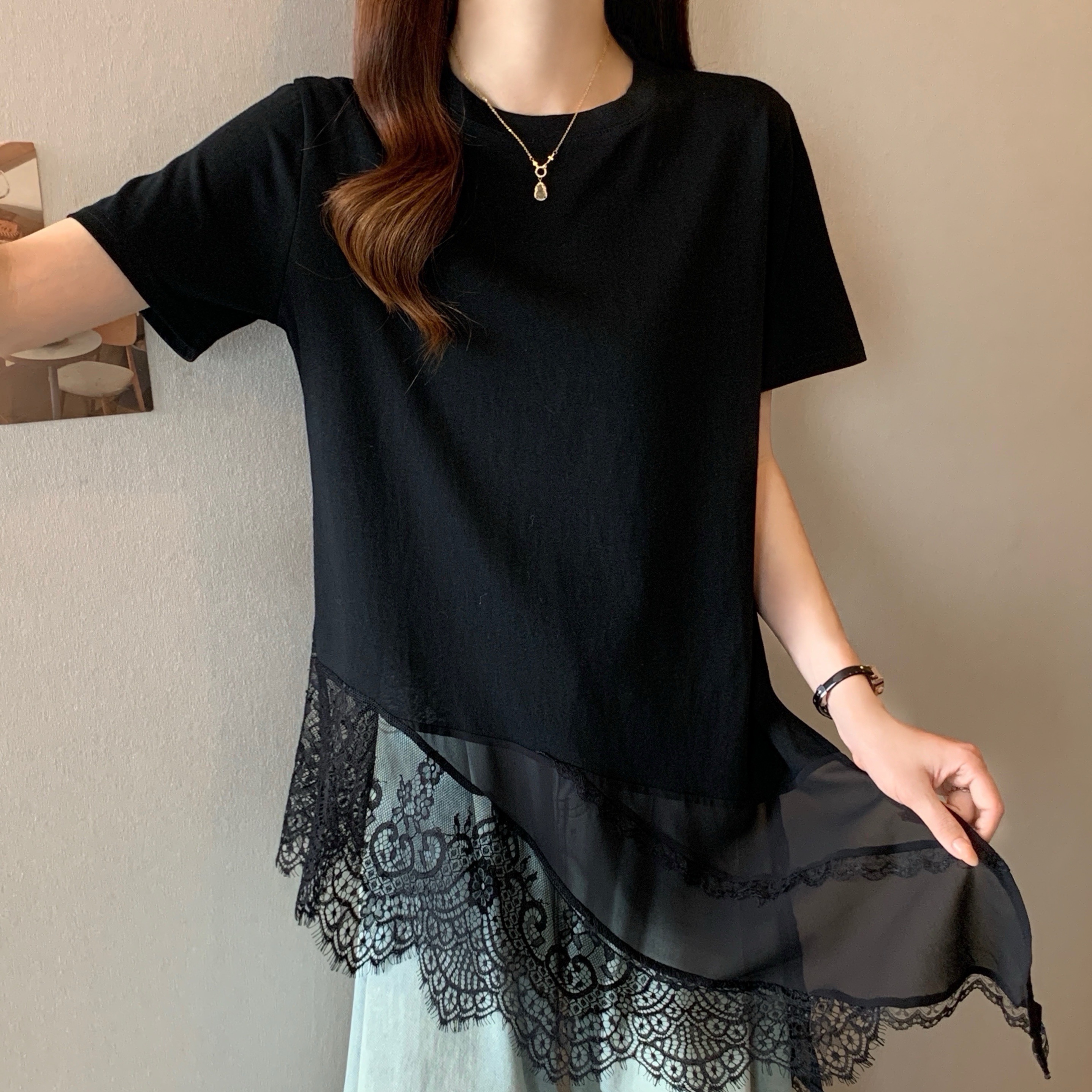 실사 빅 사이즈 여성 의류 지방 mm 봄 여름 디자인 센스 패치워크 레이스 불규칙 루즈핏 티셔츠 맨위 기본 셔츠