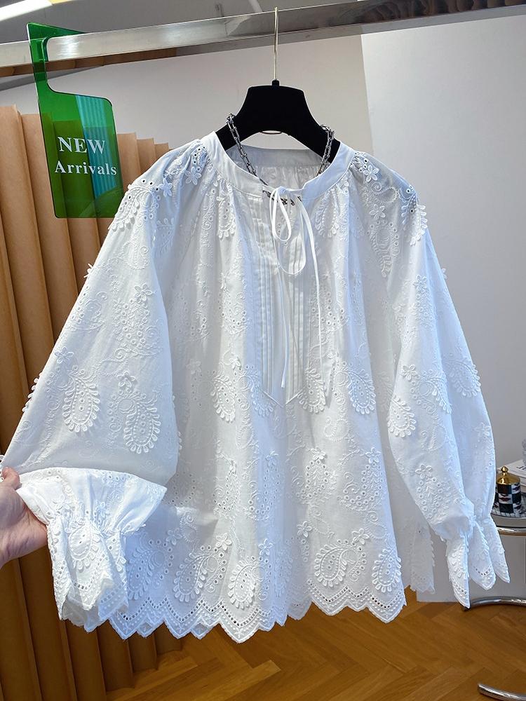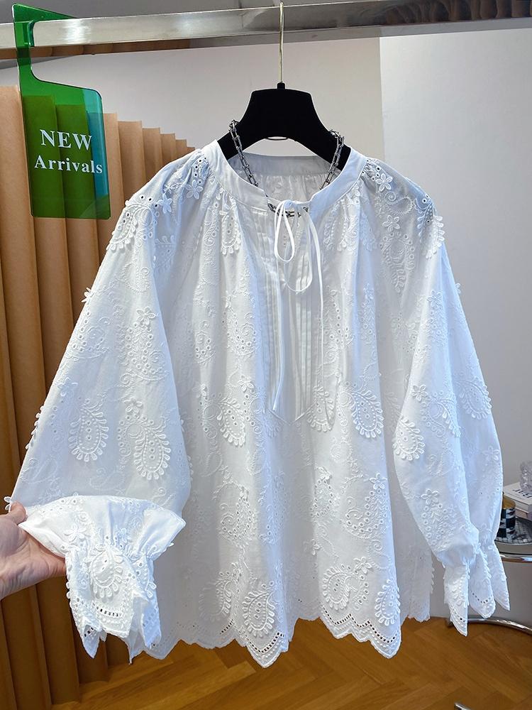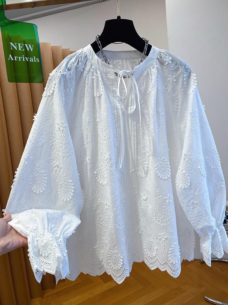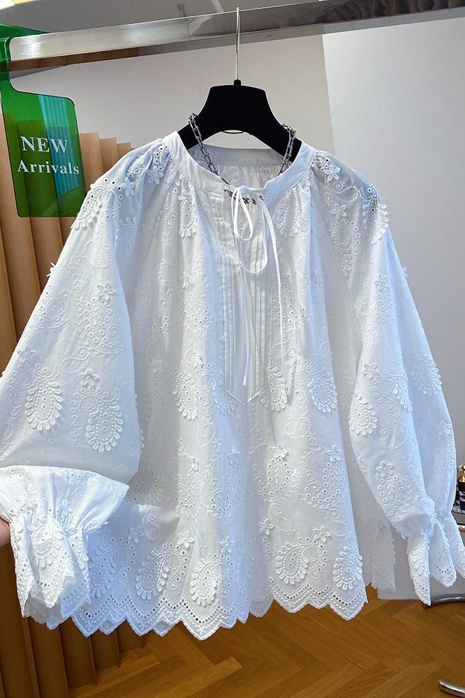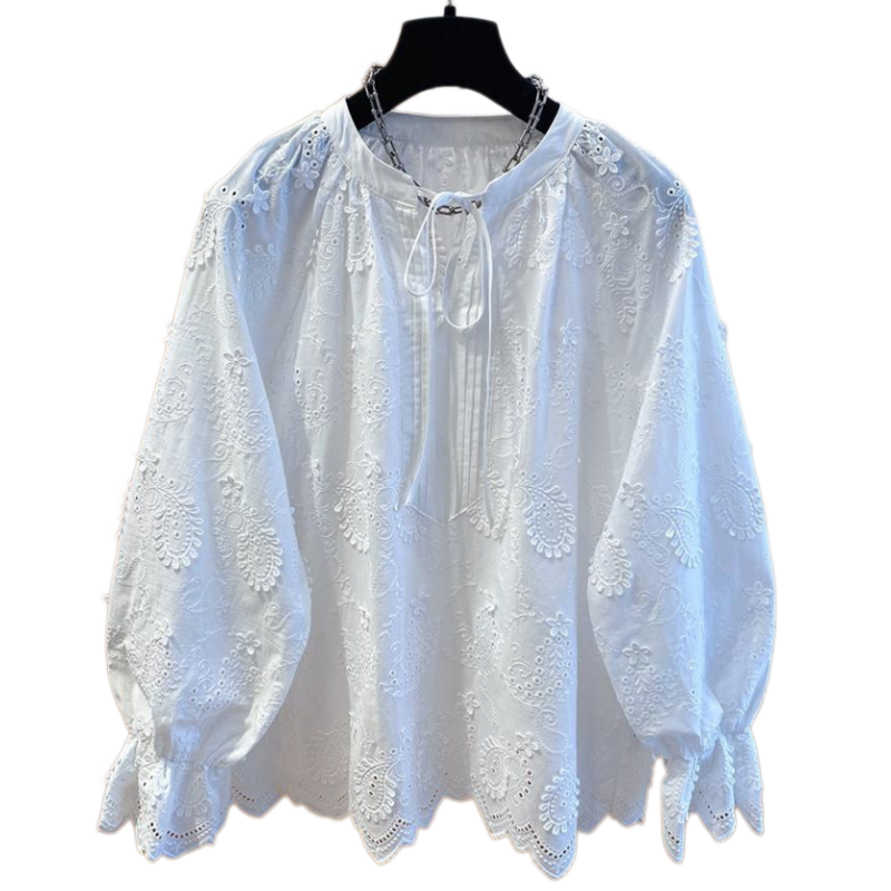 화이트 자수 홀로우 아웃 셔츠 여성 긴 소매 2026 새로운 이른 봄 루즈핏 풀오버 아름다운 아름다운 인형 셔츠 맨위