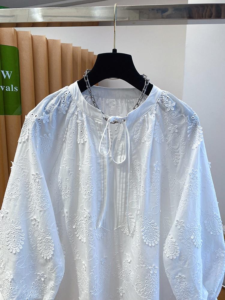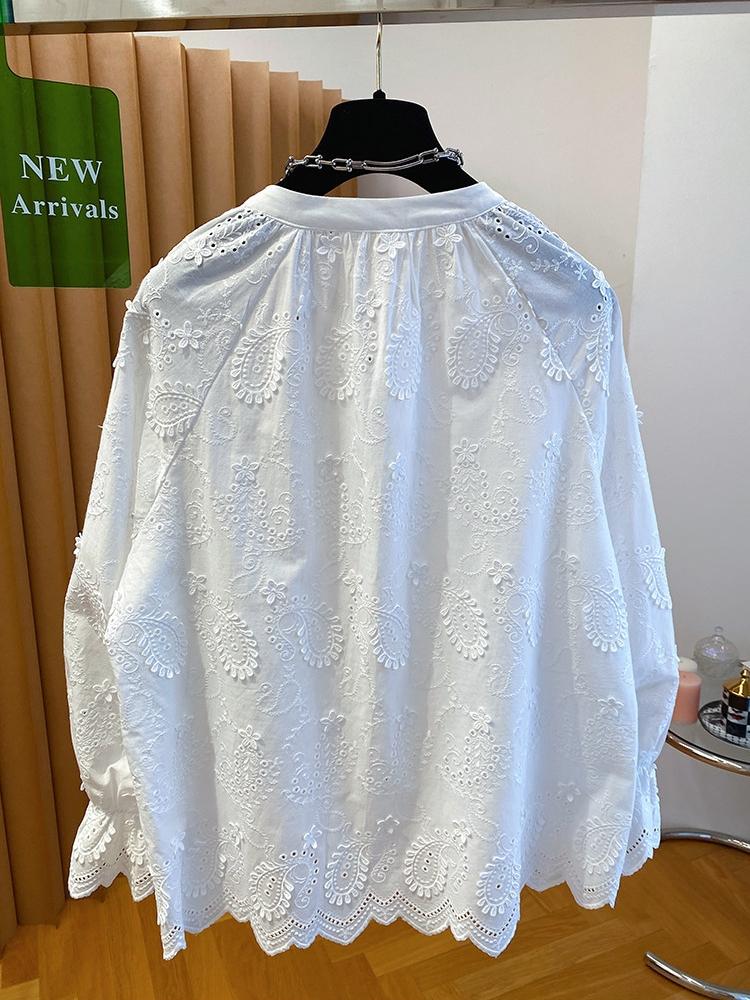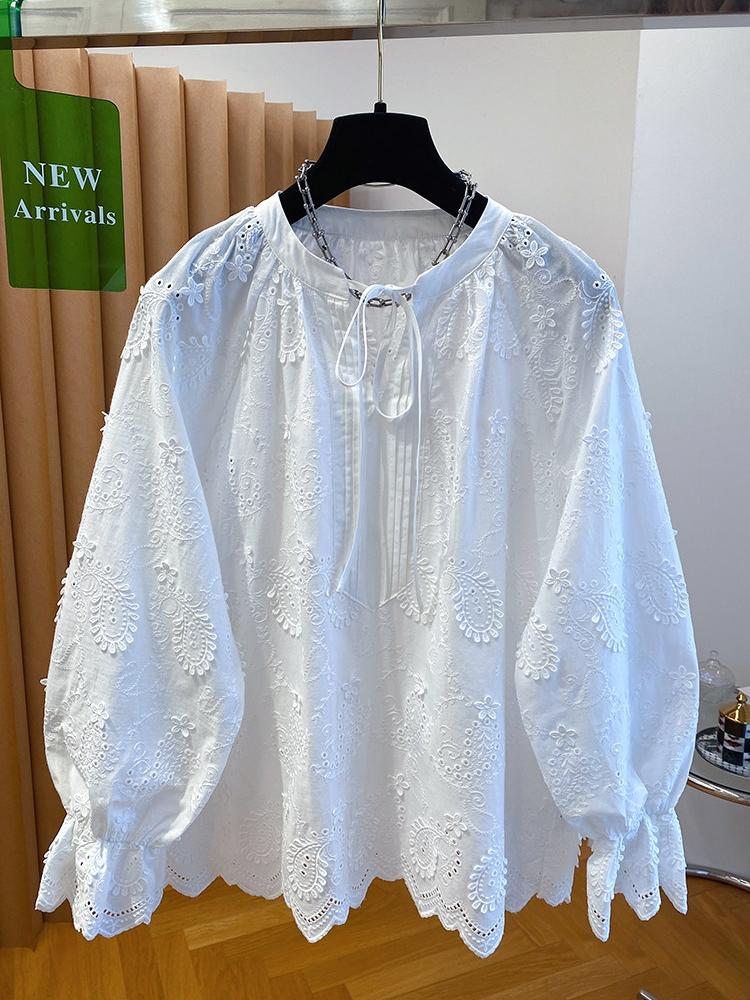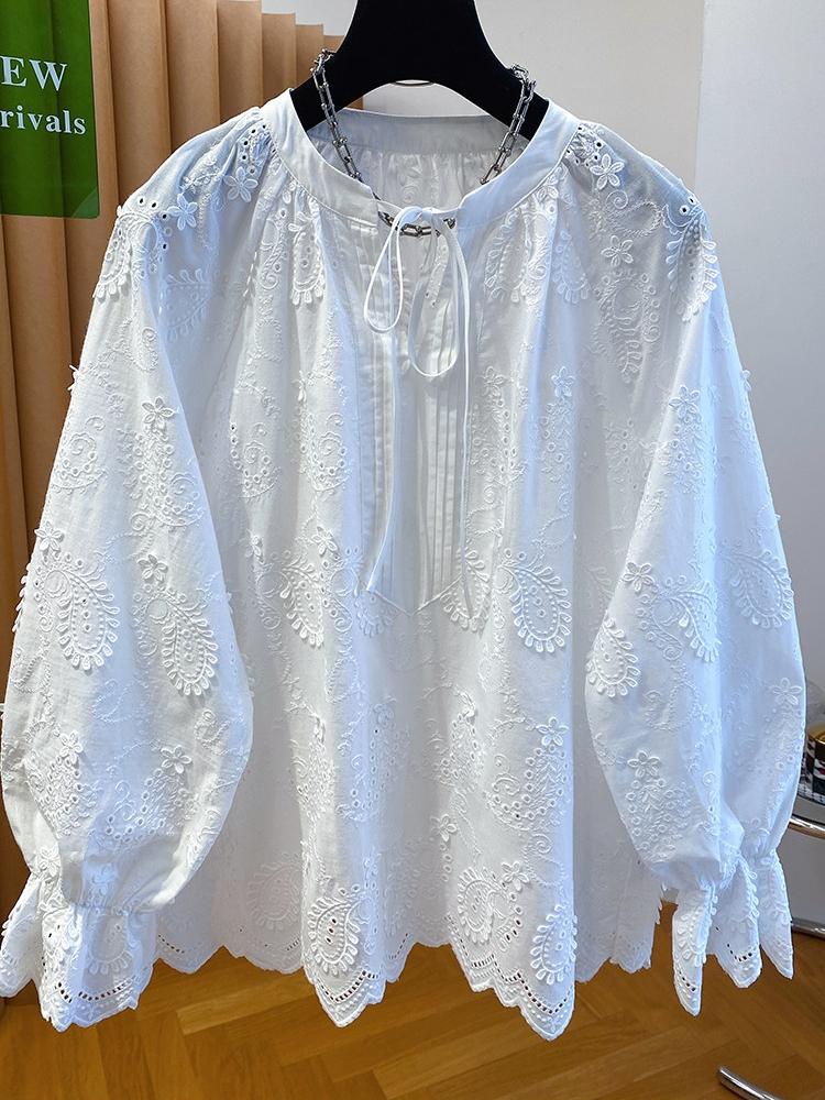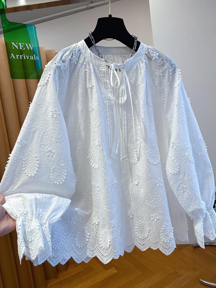 화이트 자수 홀로우 아웃 셔츠 여성 긴 소매 2026 새로운 이른 봄 루즈핏 풀오버 아름다운 아름다운 인형 셔츠 맨위