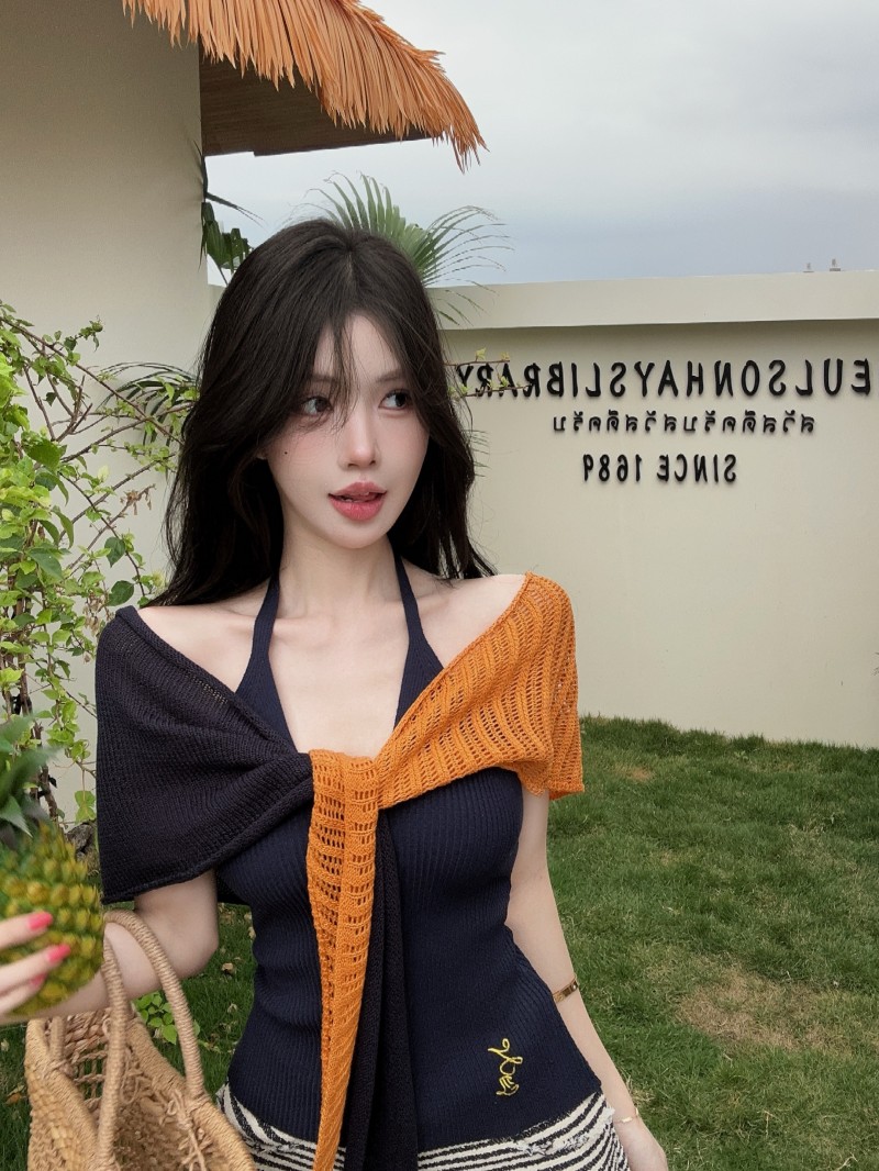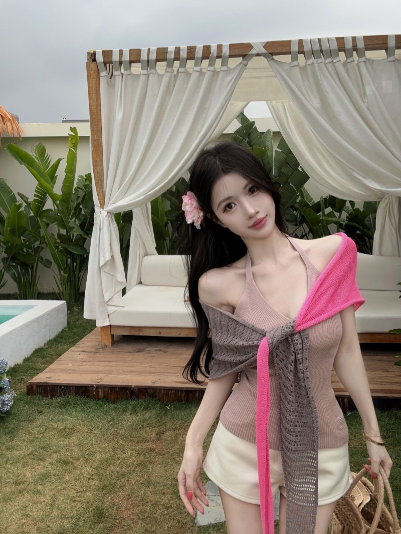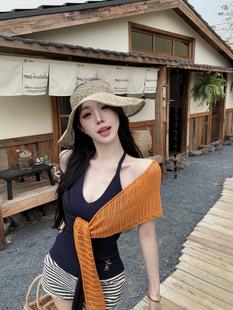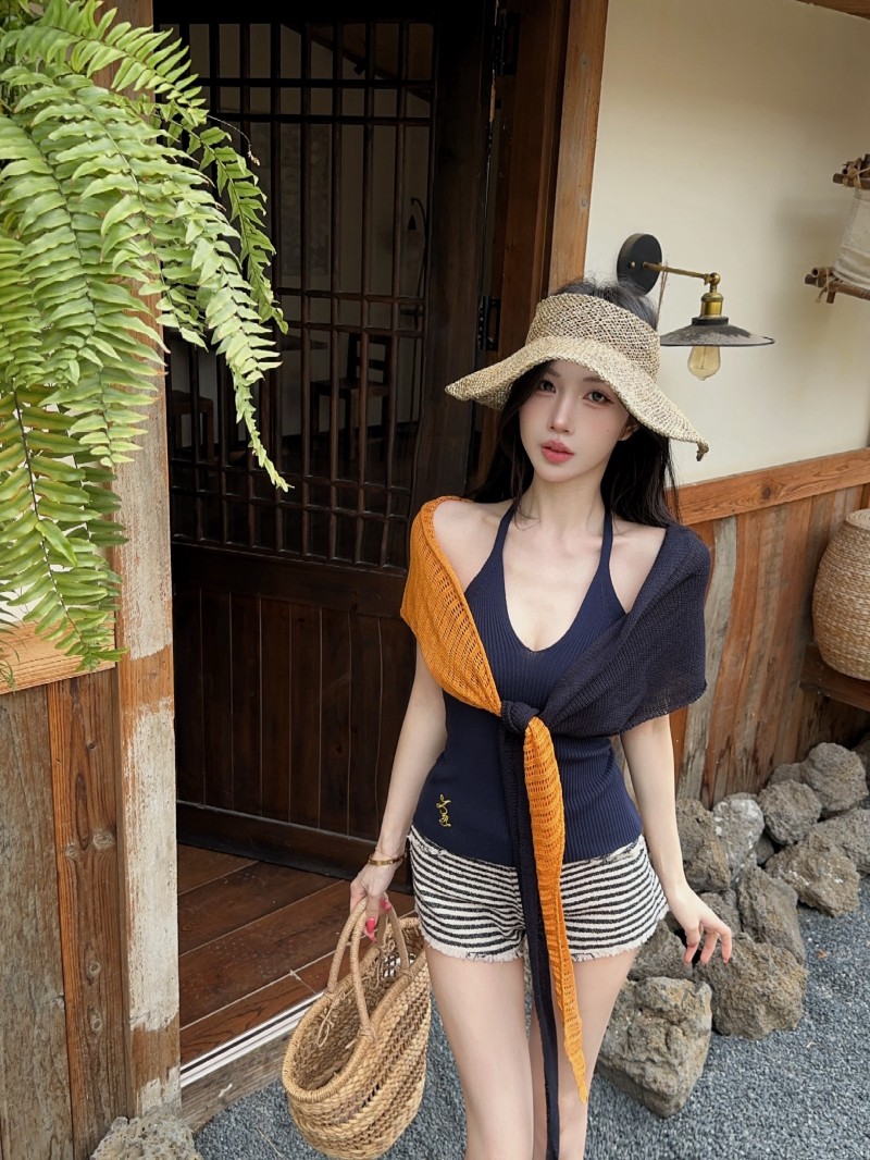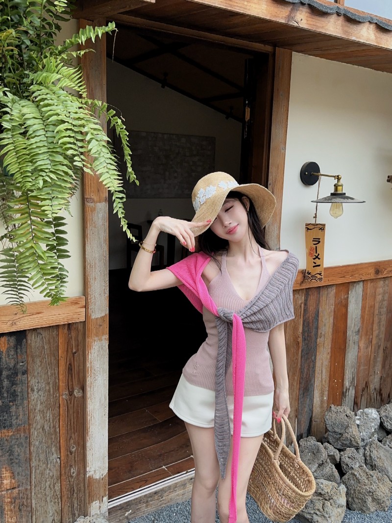 실사 정가 감소되지 않음 아름다움 어깨 함락 행침 목 슬립 모방 아마 숄 투피스 세트 여름 니트 세트