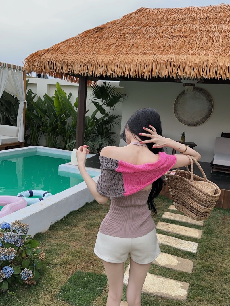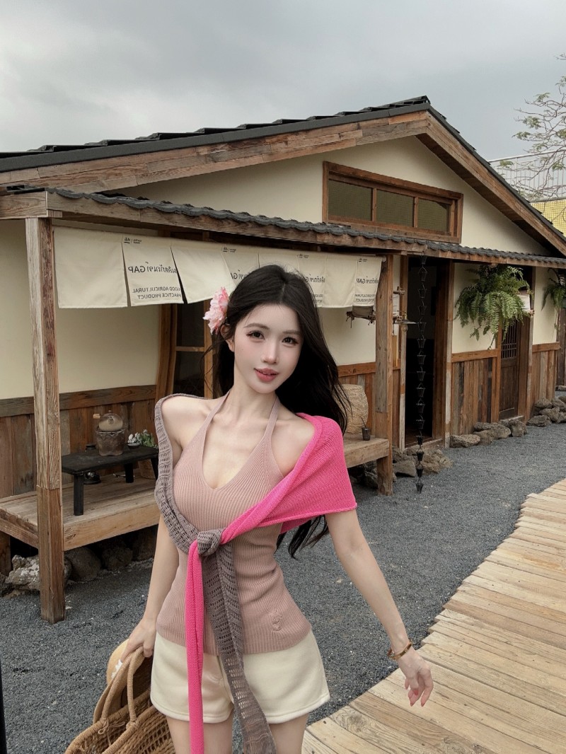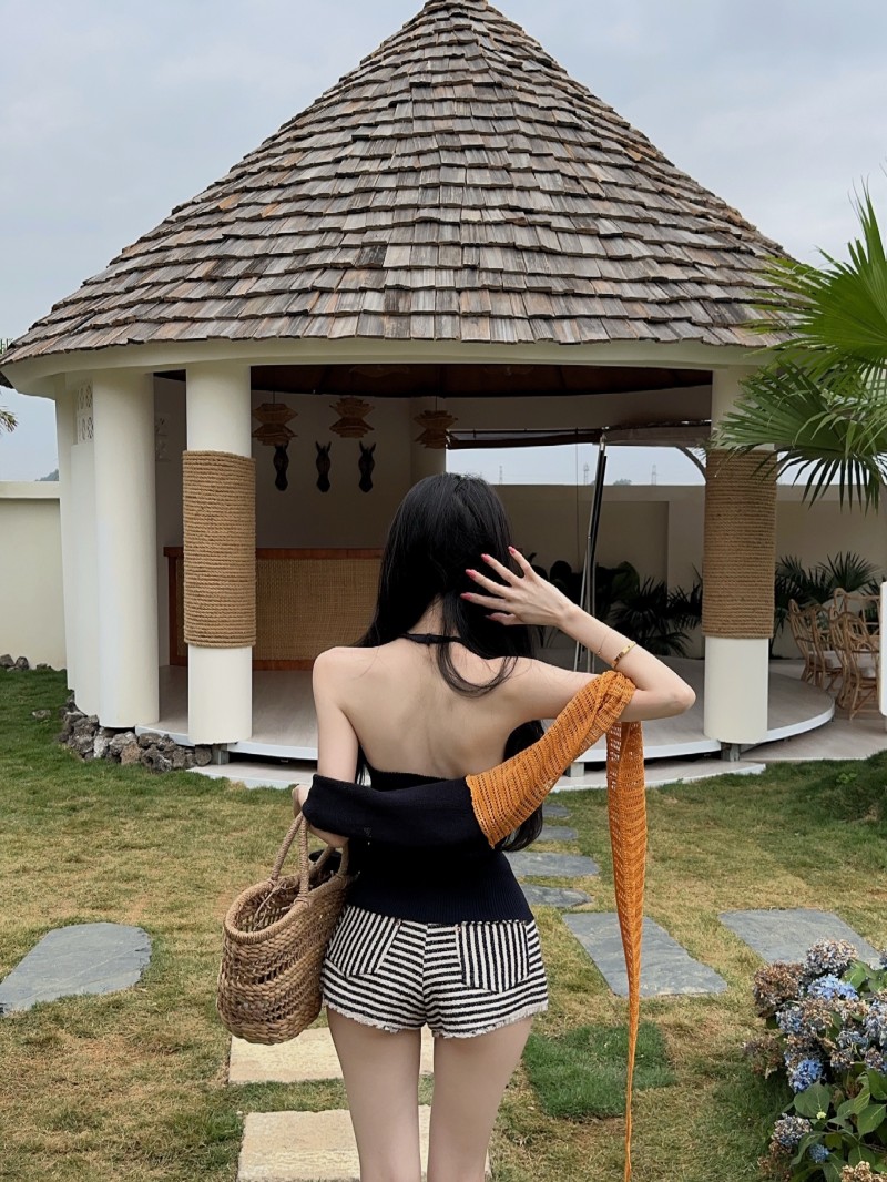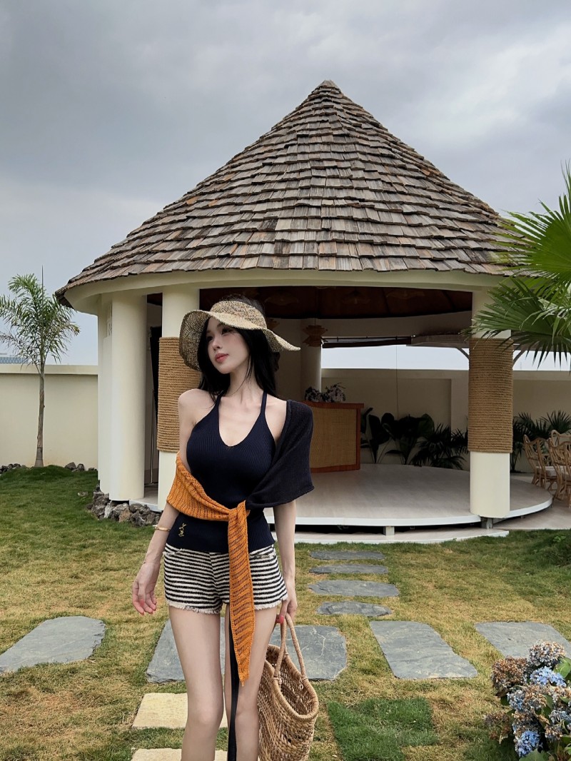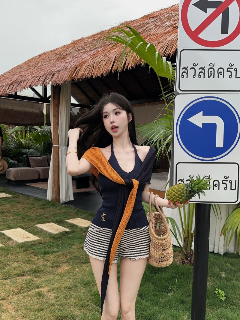 실사 정가 감소되지 않음 아름다움 어깨 함락 행침 목 슬립 모방 아마 숄 투피스 세트 여름 니트 세트