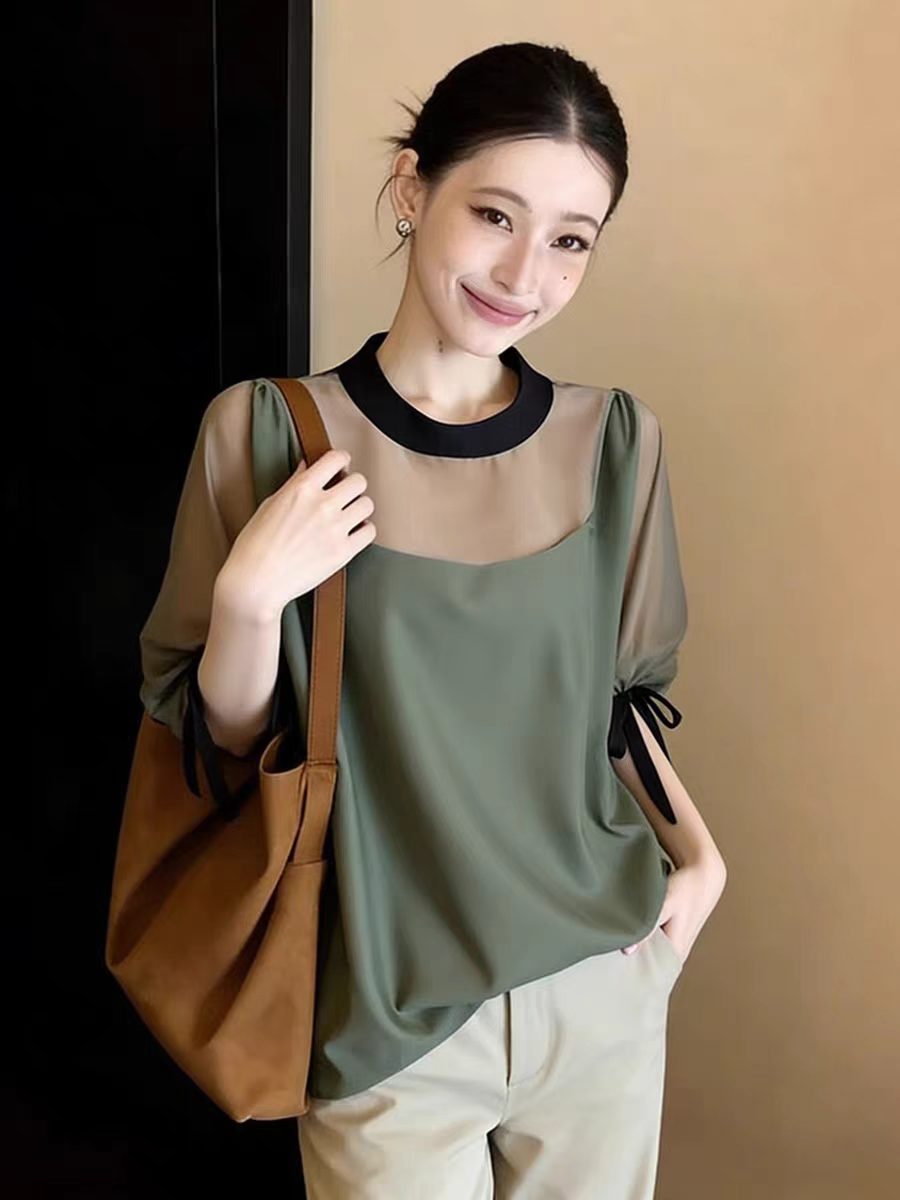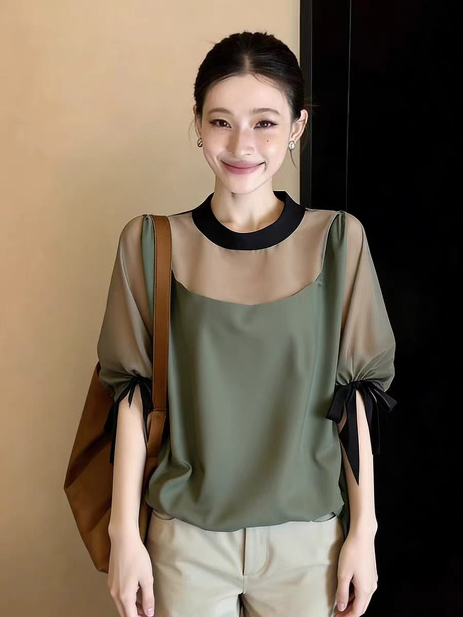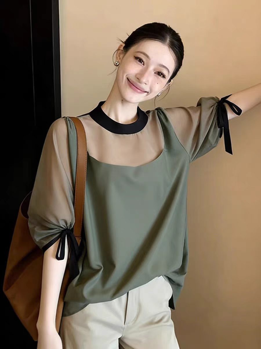 일본식 국경 간 셔츠 여성 2026 여름 새로운 라운드 넥 두 개의 슬리브 스트랩 7 분 나팔 소매 맨위
