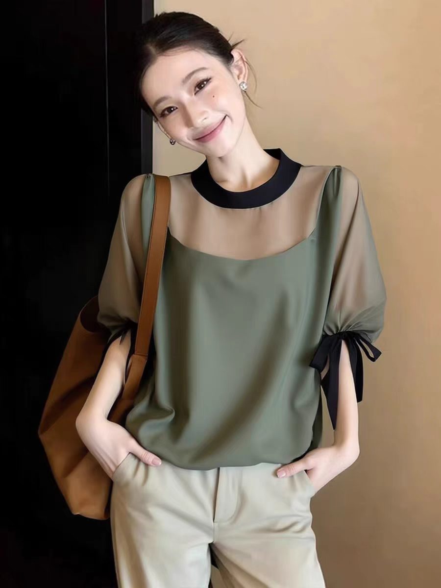 일본식 국경 간 대외 무역 여름 새로운 반팔 박쥐 셔츠 루즈핏 품격 슬림해 보이는 라운드 넥 캐주얼 다용도 쉬폰 블라우스