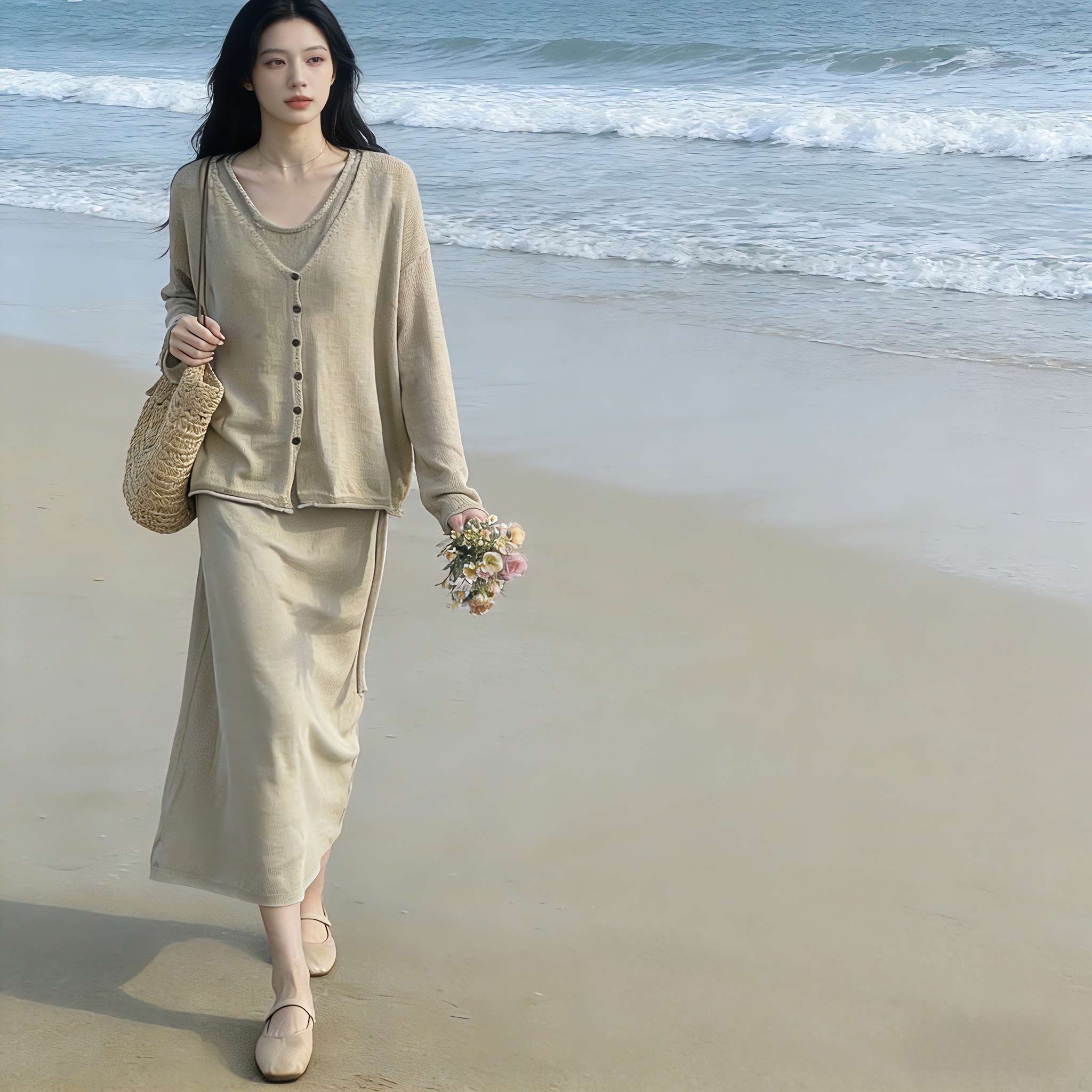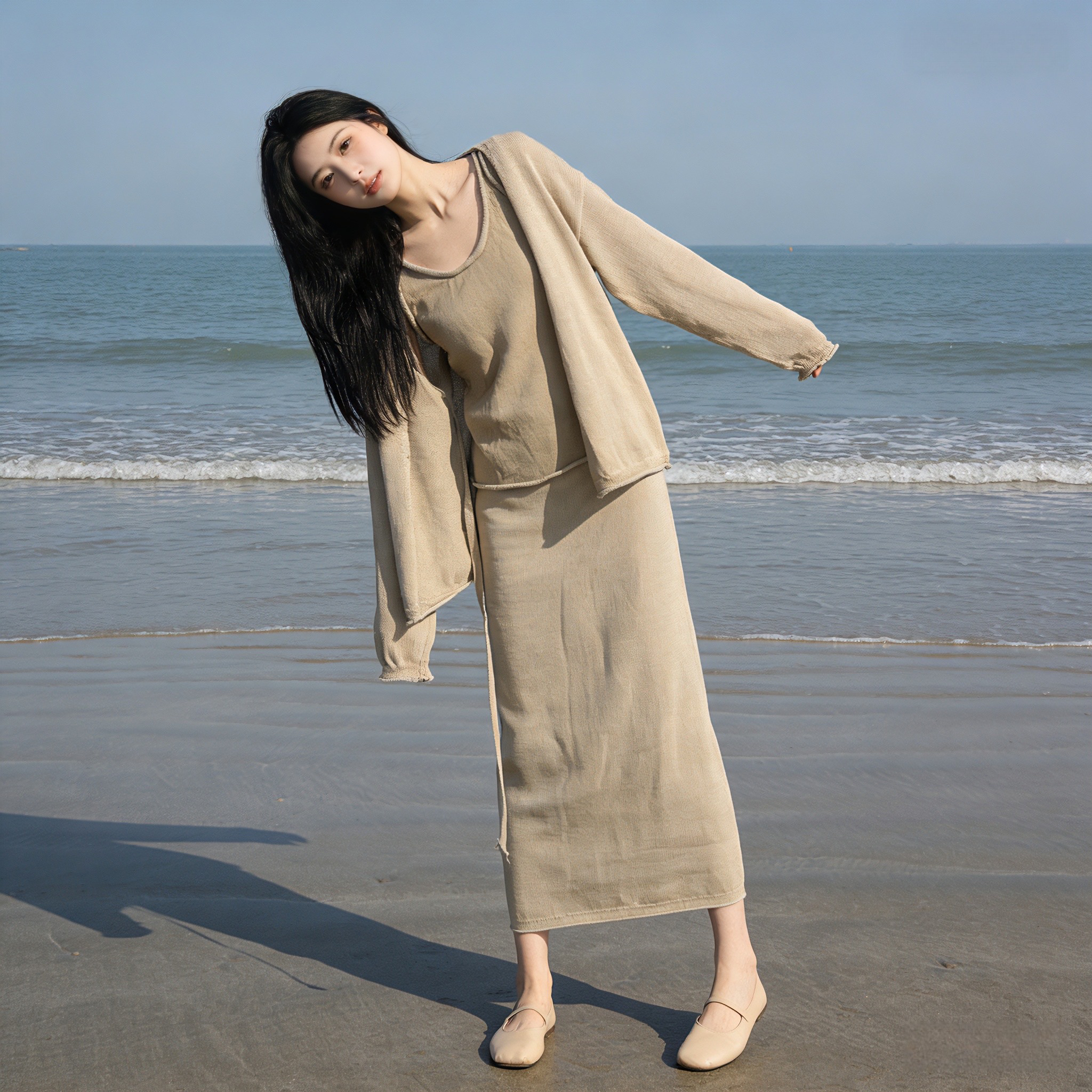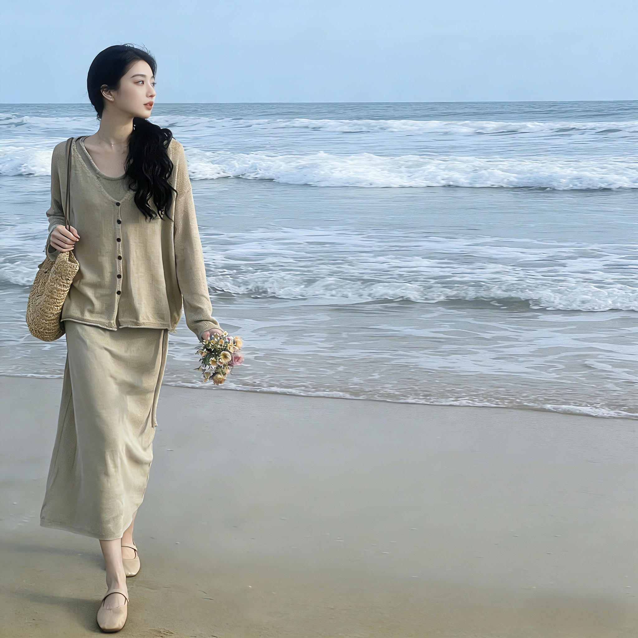 실사 정가 2026 새로운 니트 세트 3종 세트 느긋한 품격 와 성별 캐주얼 여성 의류 디자인 센스