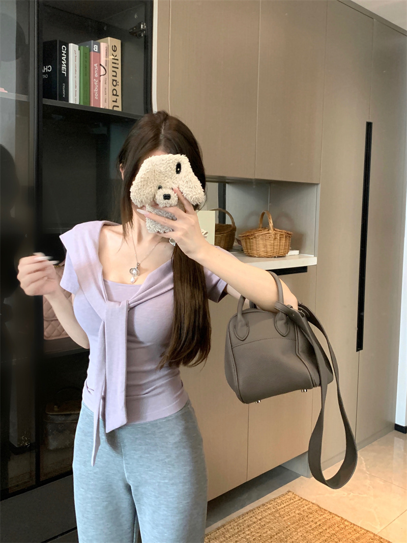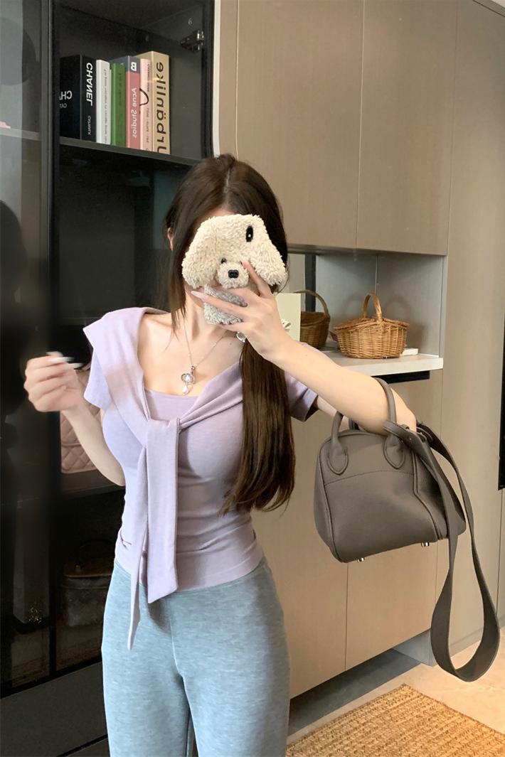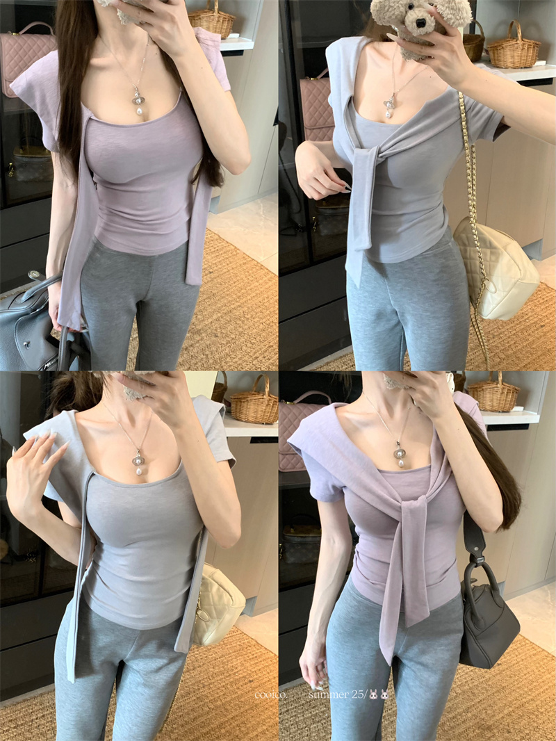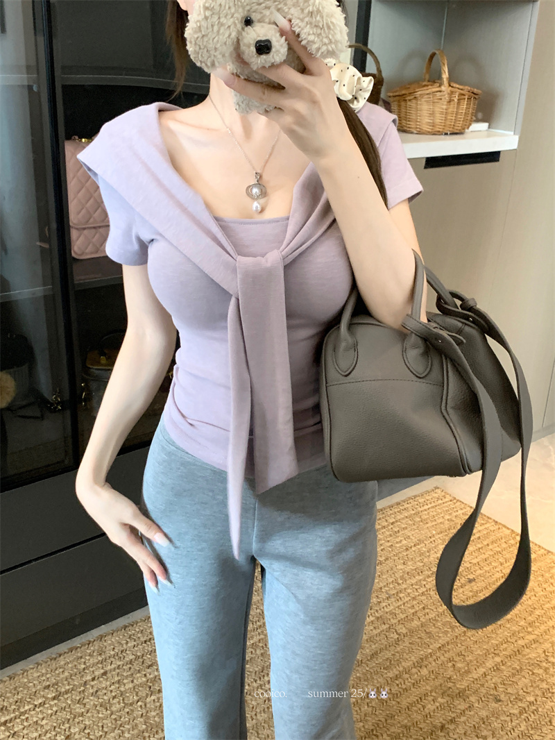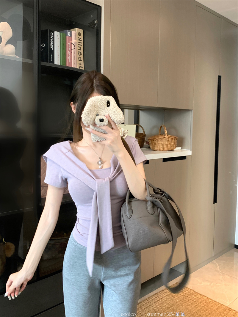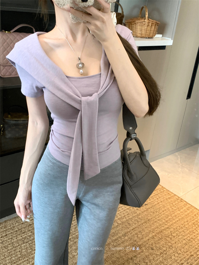 실사 정가 26 년 여름 새로운 비스듬한 칼라 배트윙 소매 둘 착용 슬림해 보이는 니트 작은 셔츠