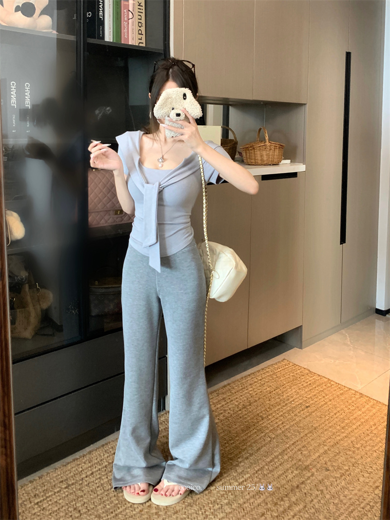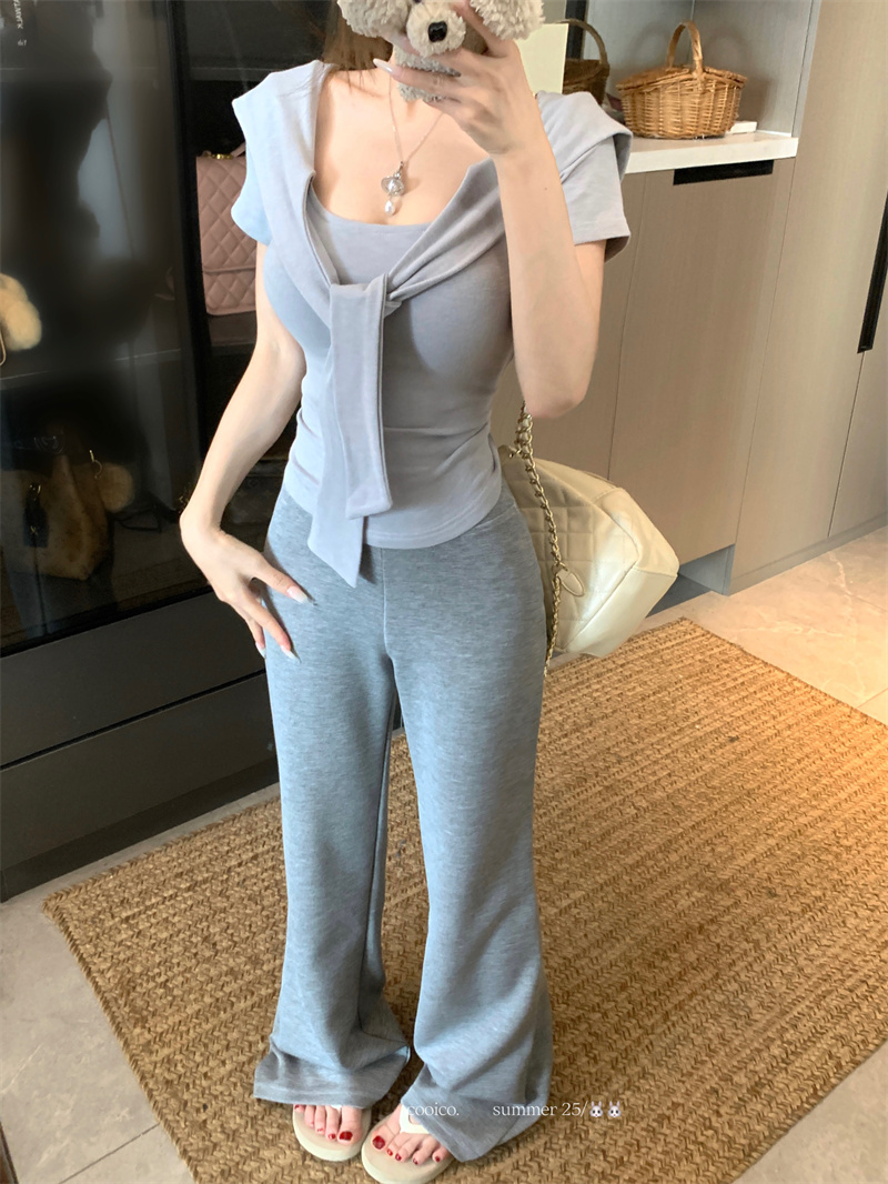 실사 정가 여름 동점 벨트 측면 칼라 반팔 티셔츠 순수한 욕망 출퇴근 작은 대중 디자인 센스 다용도 캐주얼 바지 세트