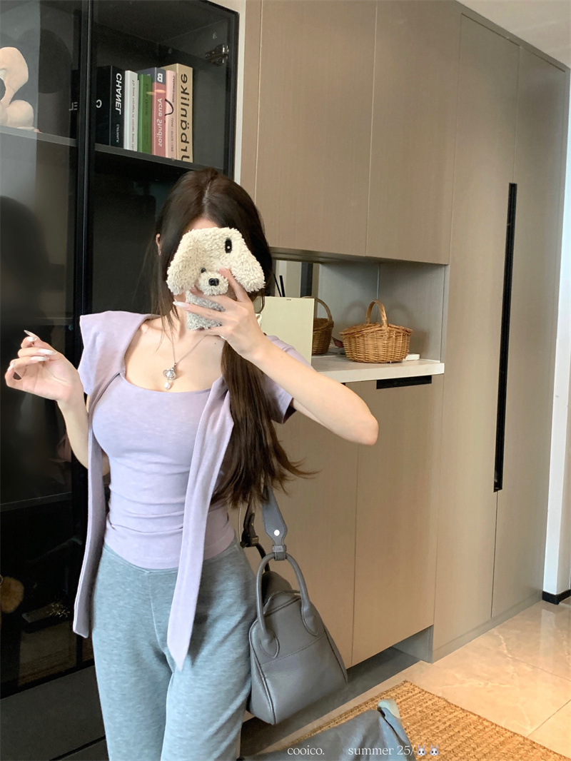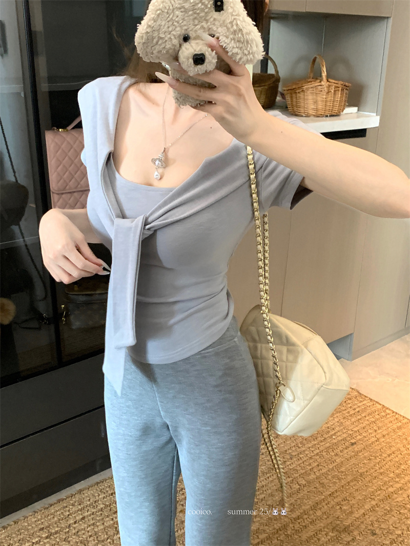 실사 정가 프랑스식 부드러운 바람 허리 수축 니트 반팔 티셔츠 여성 여름 새로운 허리 수축 슬림해 보이는 맨위