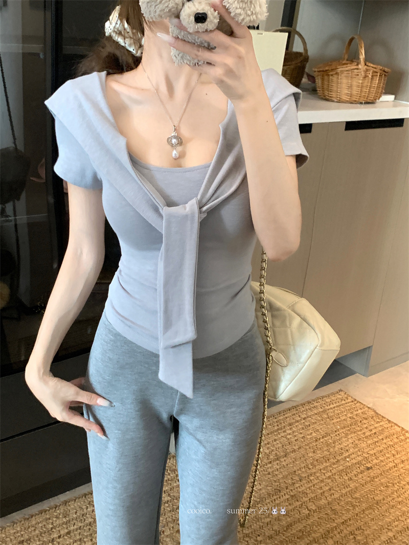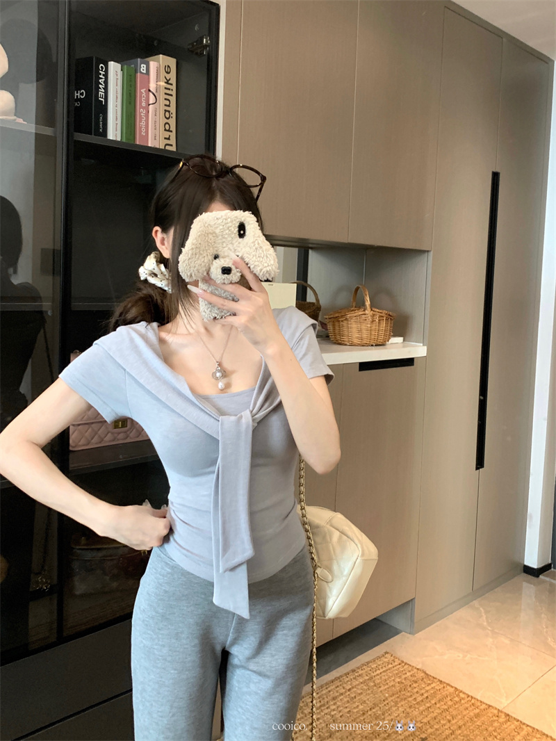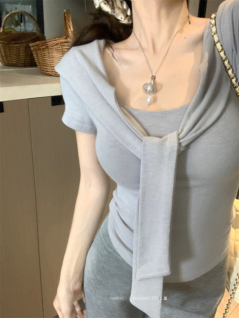실사 정가 회색 오프숄더 반팔 티셔츠 여성 여름 슬림해 보이는 한 부서 고급 센스 품격 오프숄더 맨위