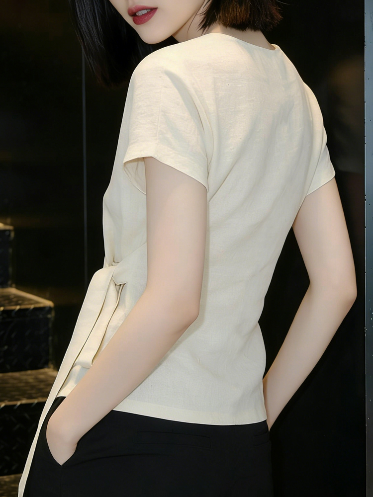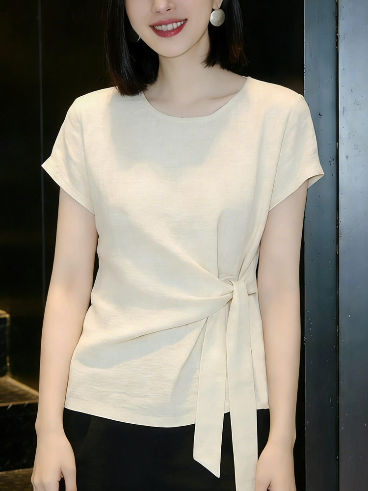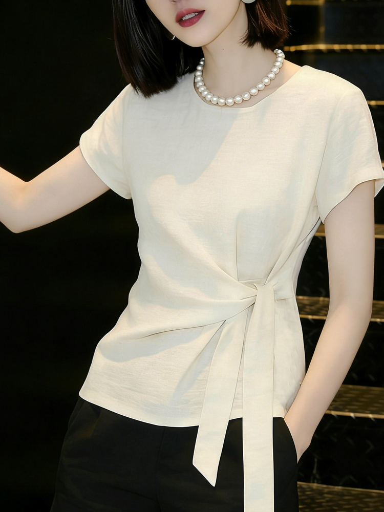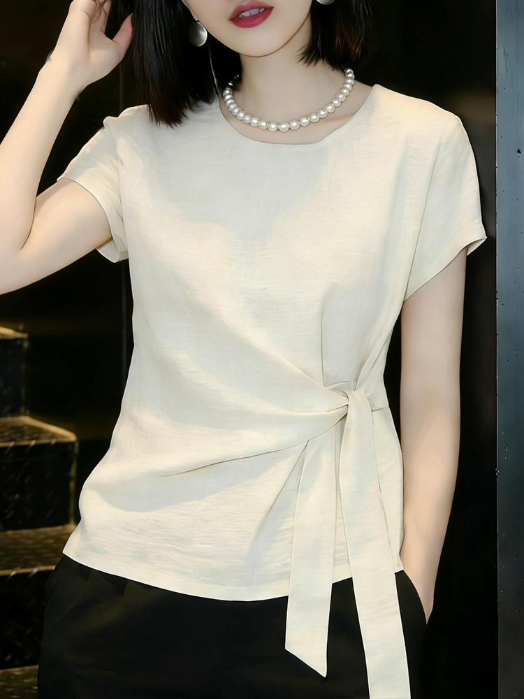 불규칙 레이스업 반팔 여성 셔츠 새로운 봄 고급 센스 외국 가스 연령 감소 허리 수축 슬림해 보이는 디자인 센스 맨위