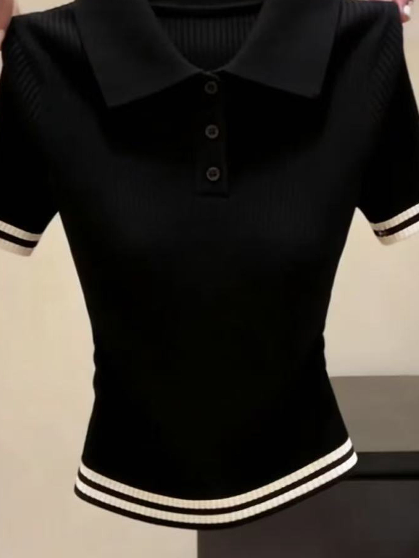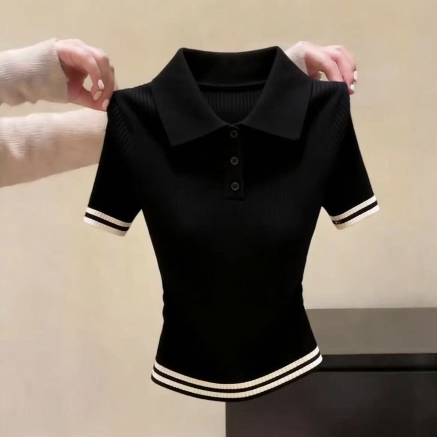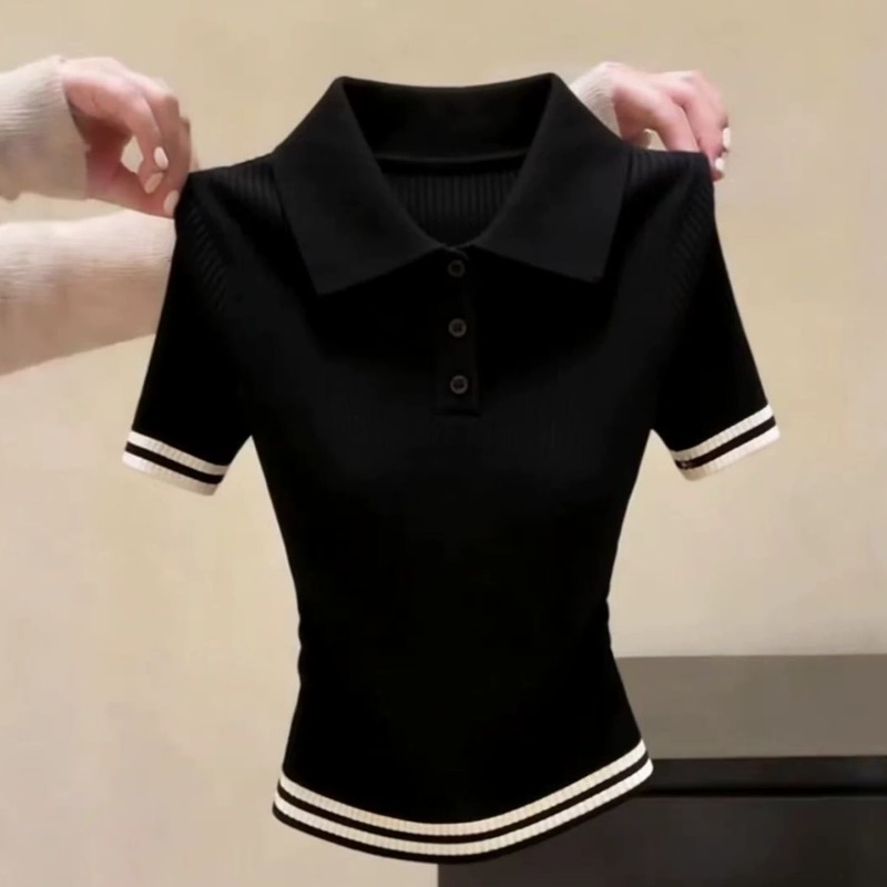 톰 글 래 원인 블루 배색 하프 지퍼 반팔 니트 스웨터 여성 여름 출퇴근 몸매 가꾸기 슬림해 보이는 쇼트 스타일 얼음 실크 맨위