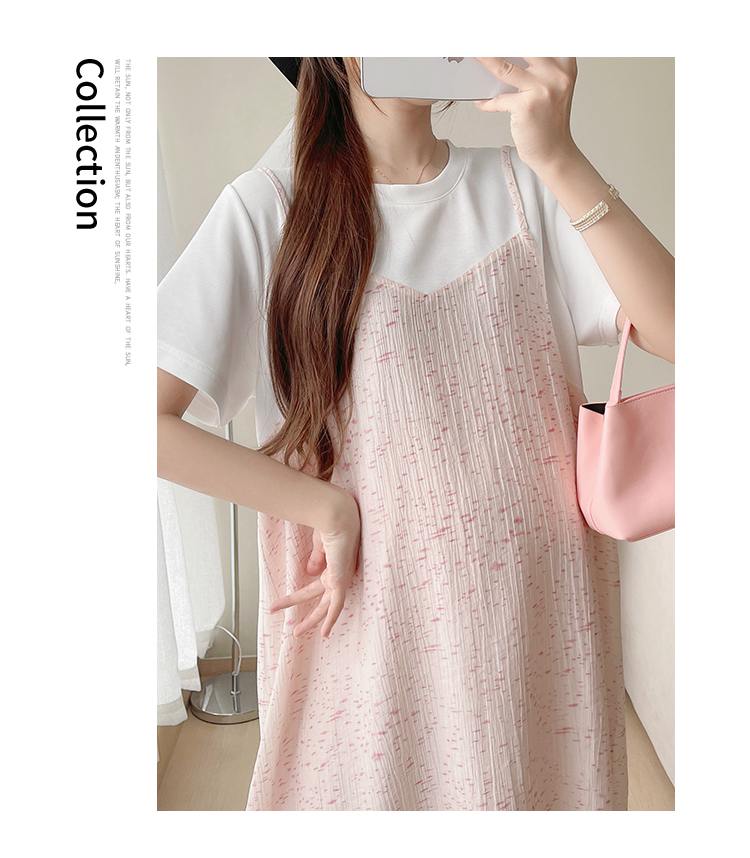실사 임산부 루즈핏 슬림해 보이는 고급 센스 자수 치마 페이크 레이어드 반팔 드레스