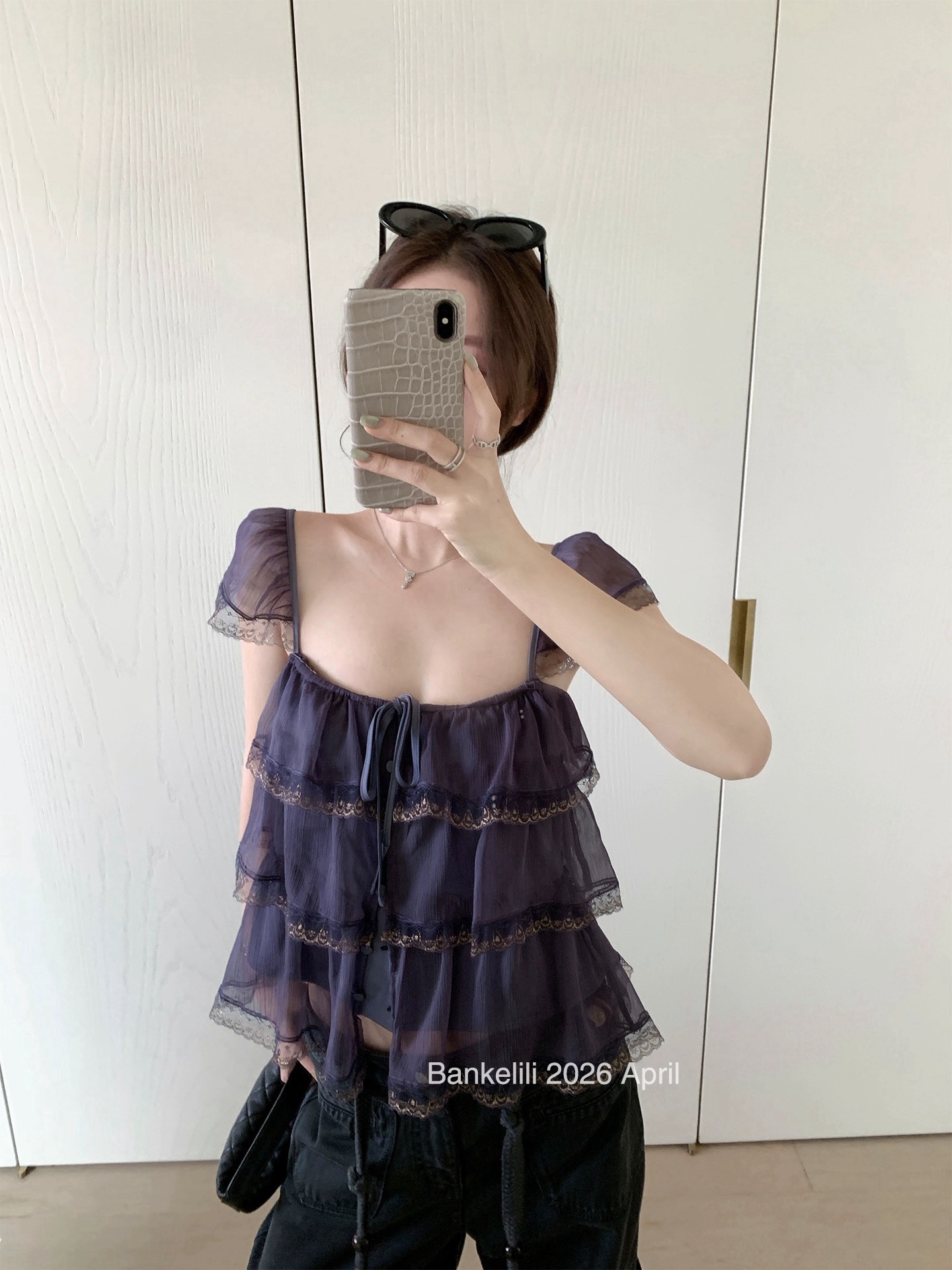 밤나무 코코아 bankelili 팬 바다 리건 프릴 레이스 계층의 감각 작은 날다 소매 광장 칼라 슬립 여성