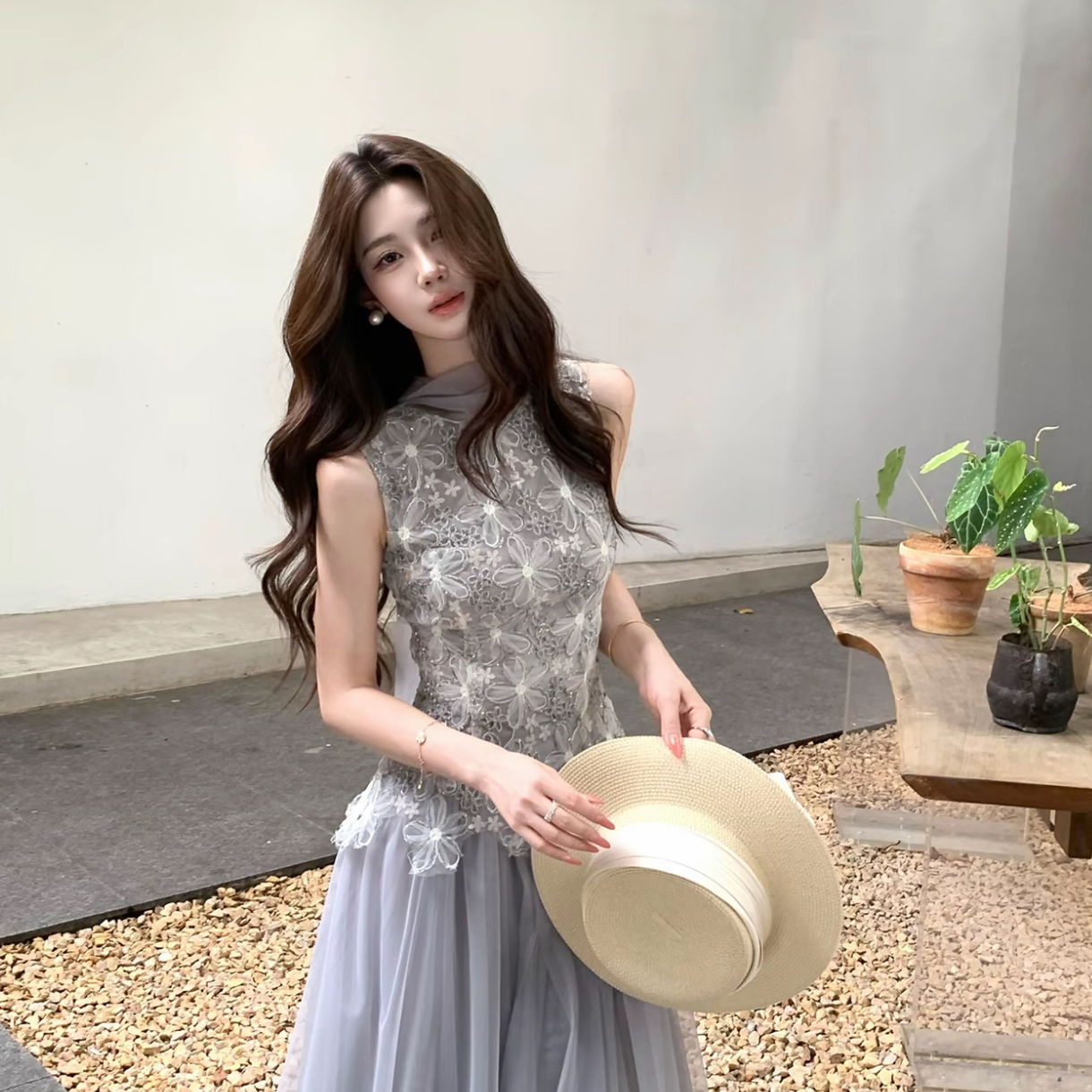 무쯔리 목자이 ~ 중 리 제직 밀가루 포함 꽃 감기 품격 3 차원 꽃잎 레이스 망사 패치워크 민소매 허리 수축 맨위 세트