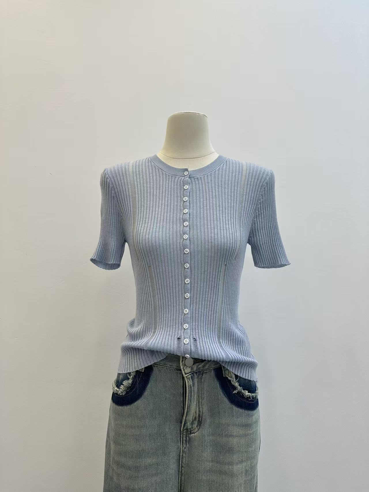 2026 여름 한국 스타일 품격 V넥 마 무늬 반팔 니트 스웨터 여성 파란색 몸매 가꾸기 슬림해 보이는 다용도 맨위