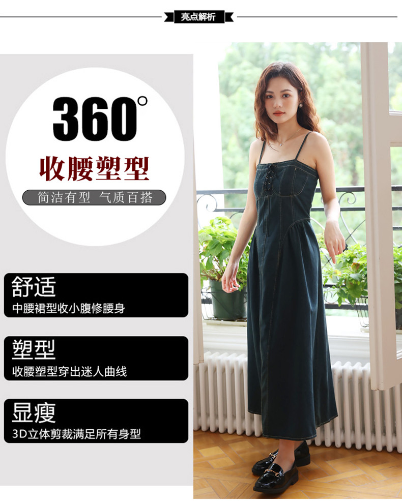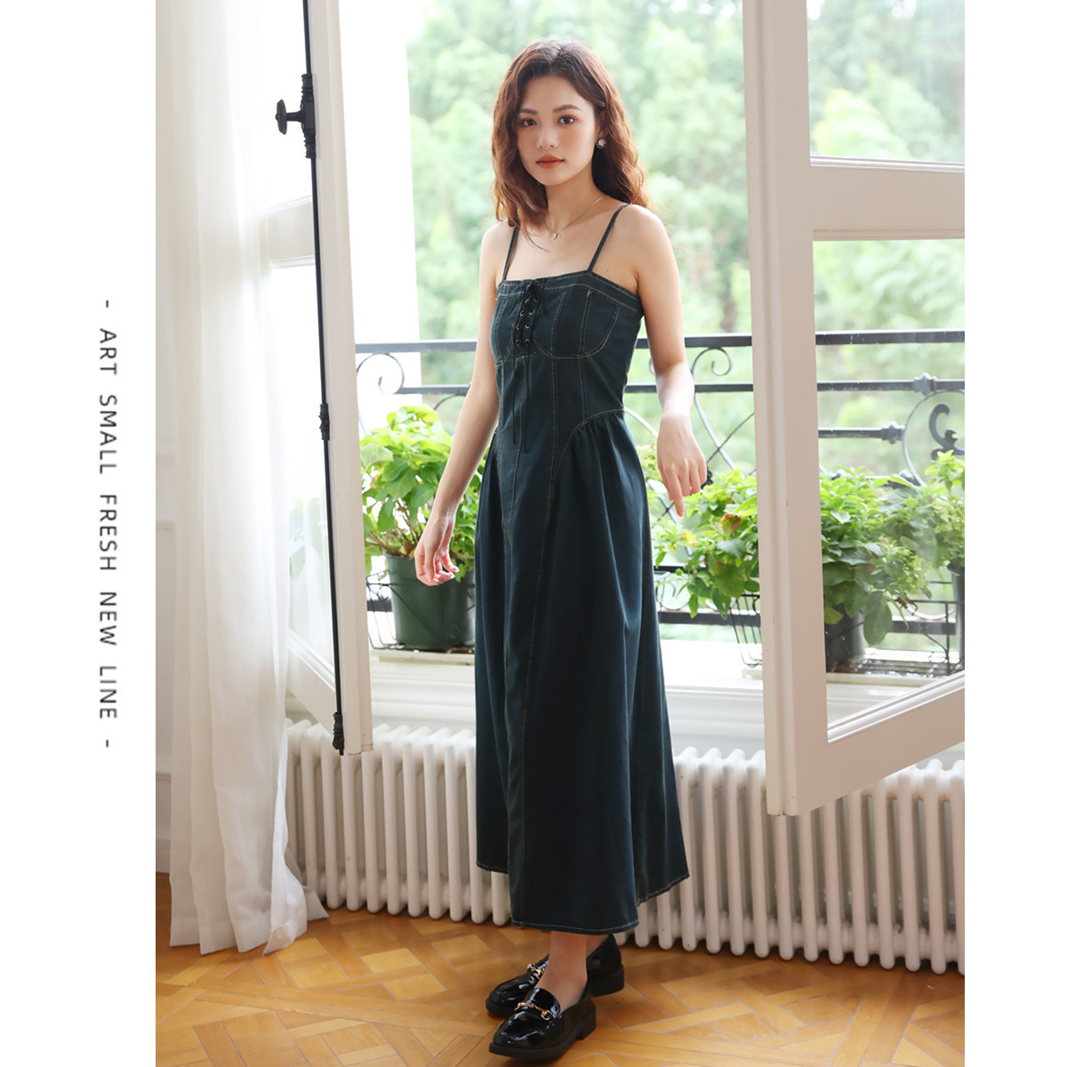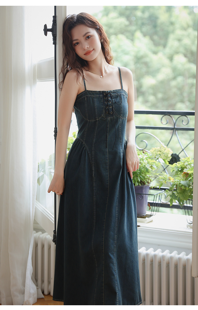 레트로 허리 수축 슬림해 보이는 데님 스커트 슬립 나비 매듭 드레스 품격 몸매 가꾸기 다용도 롱 스커트 여름 여성