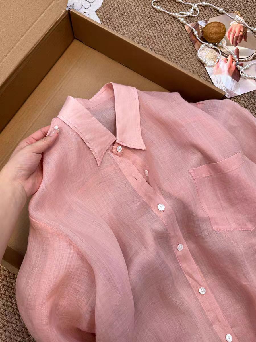 여름 얇은 스타일 긴팔 단색 셔츠 캐주얼 한 부서 도루 가을 센스 자외선 차단 맨위 여성 달콤함 품격 주간 실크 셔츠