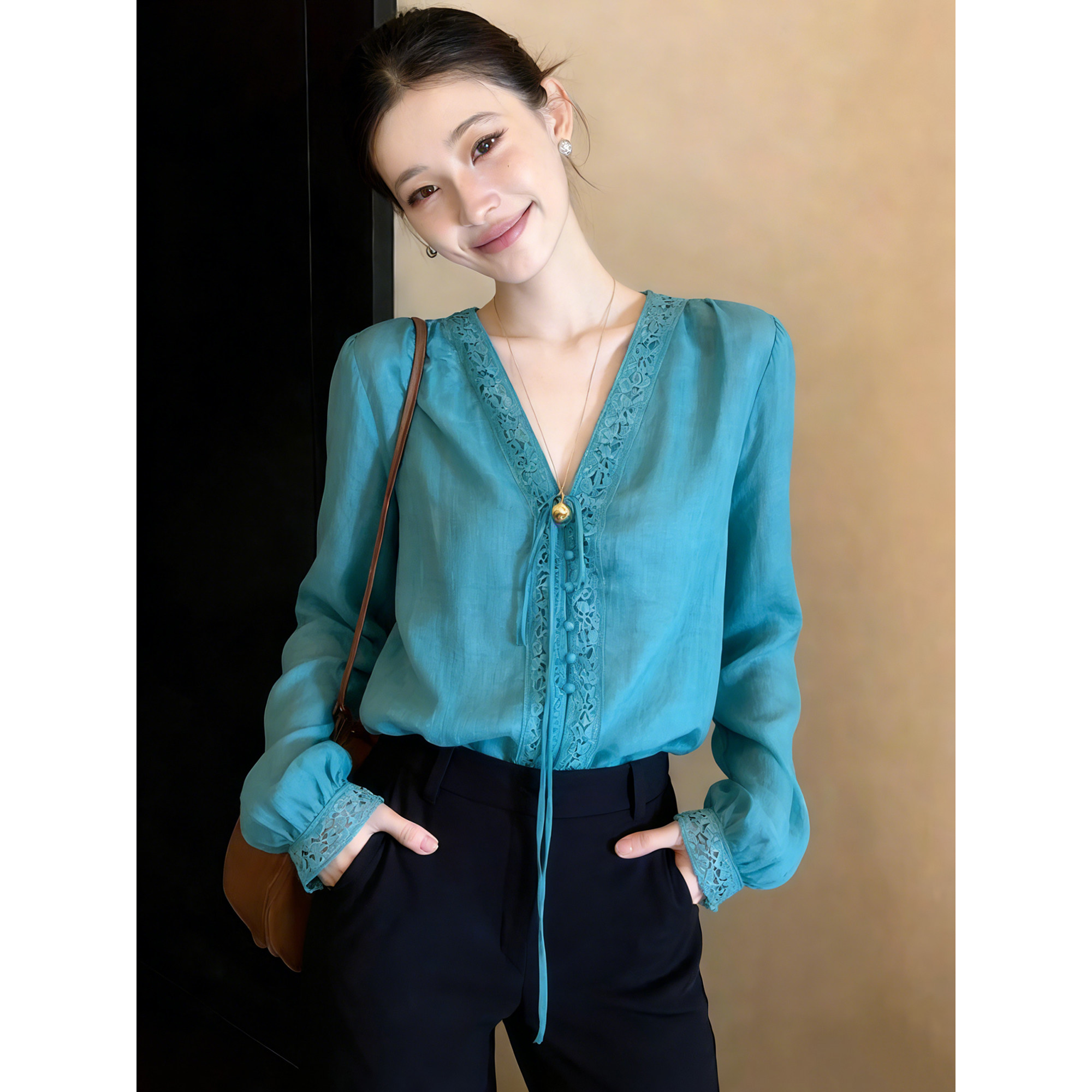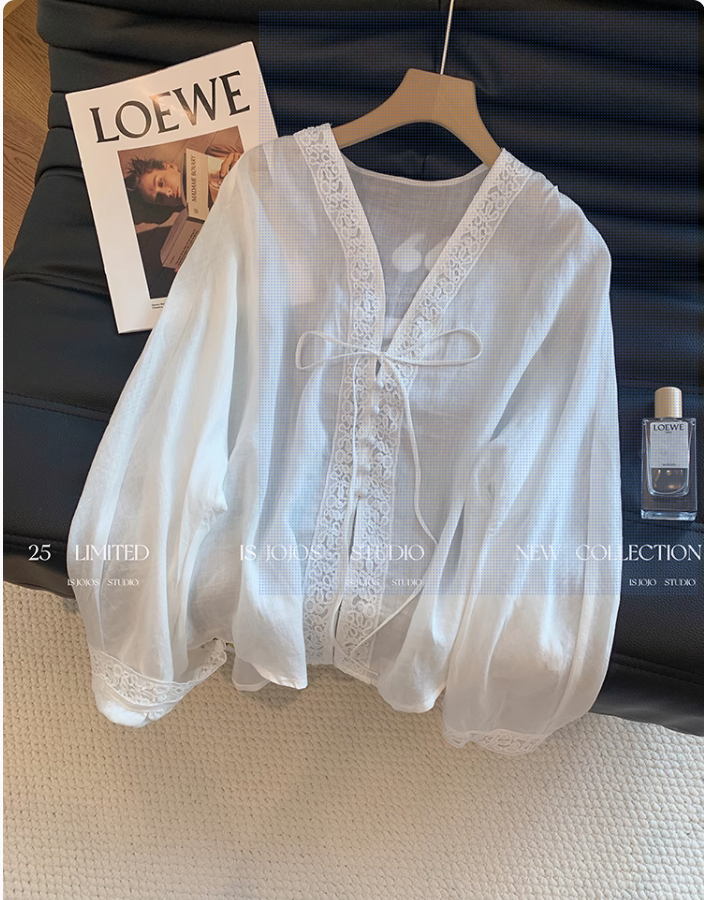 파란색 레이스 측면 V넥 레이스업 라미 긴팔 여성 셔츠 여름 새로운 고급 센스 다용도 얇은 스타일 자외선 차단 셔츠