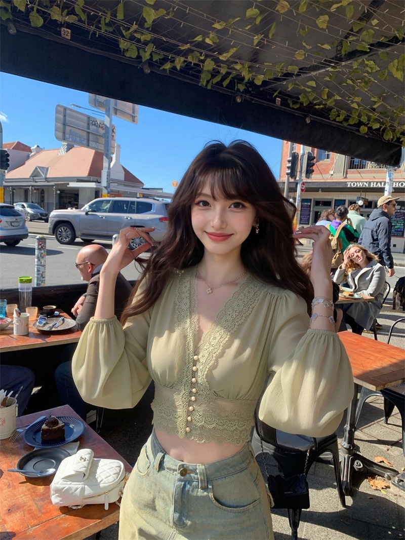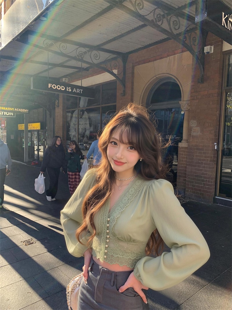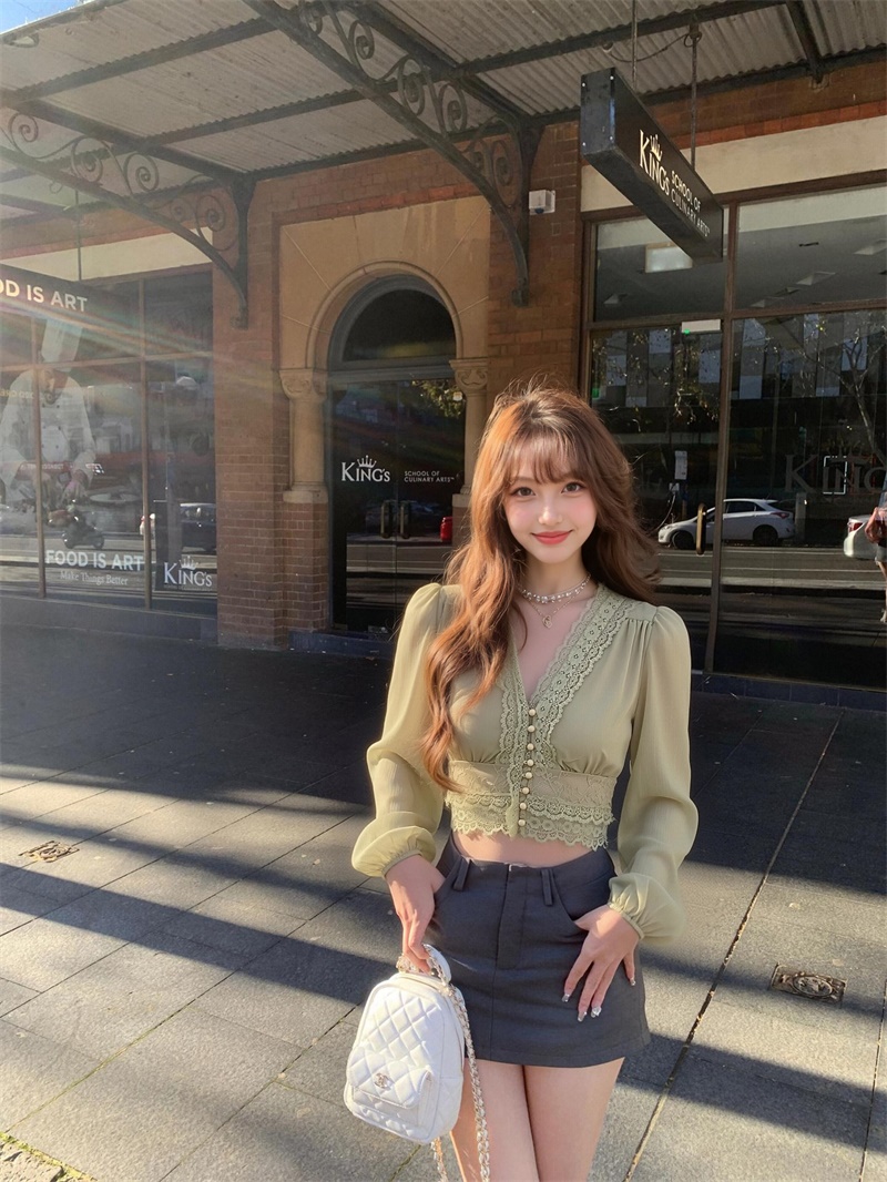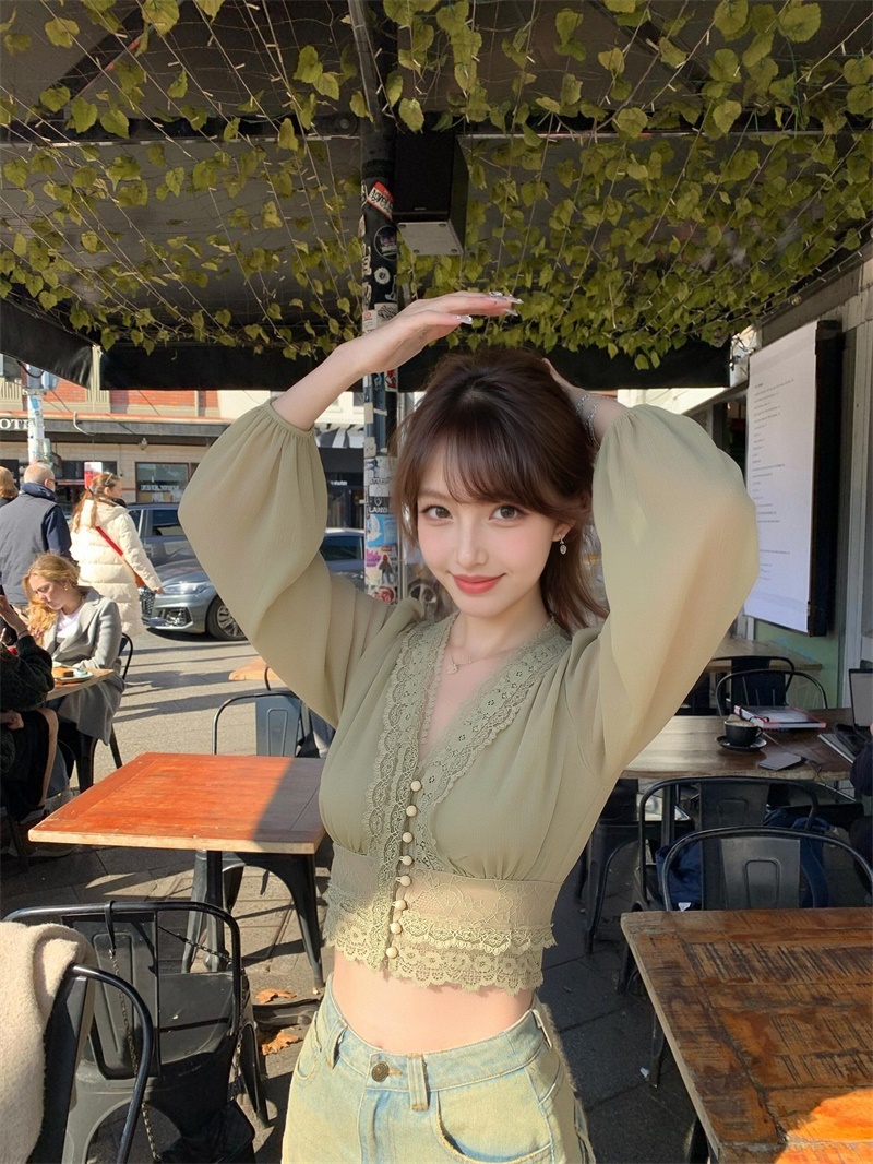 실사 정가 레이스 프랑스식 낭만주의 레이스 조각 꼬집기 허리 긴팔 셔츠 맨위