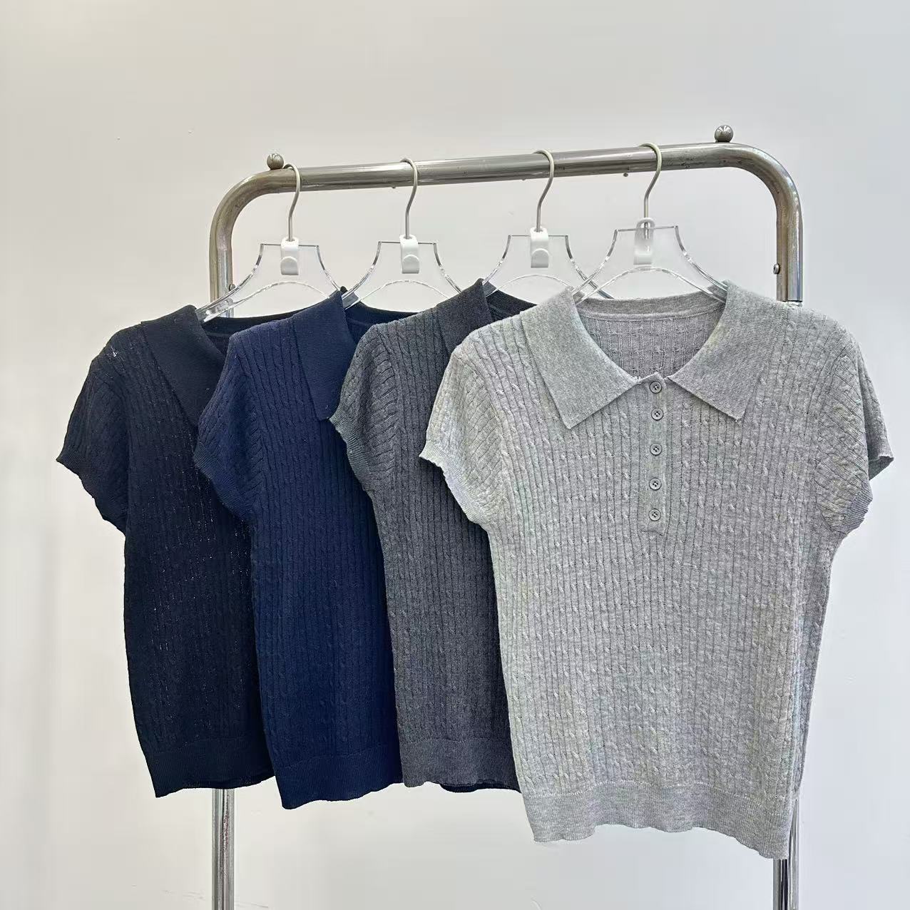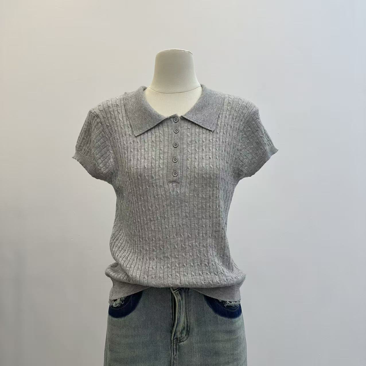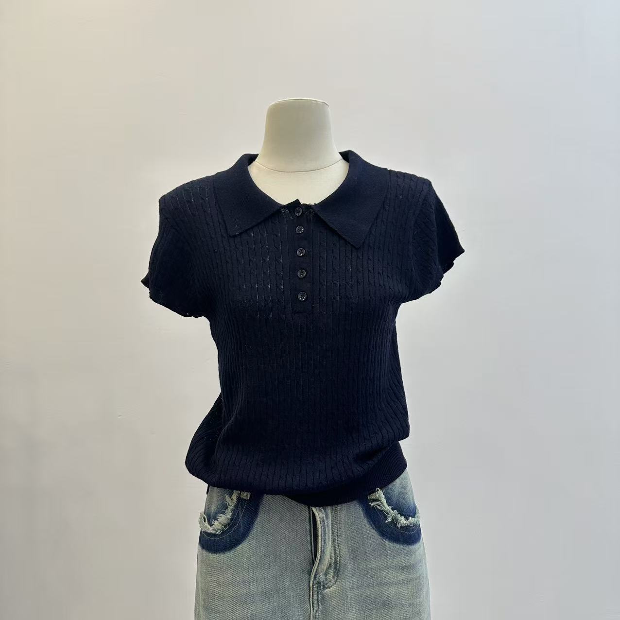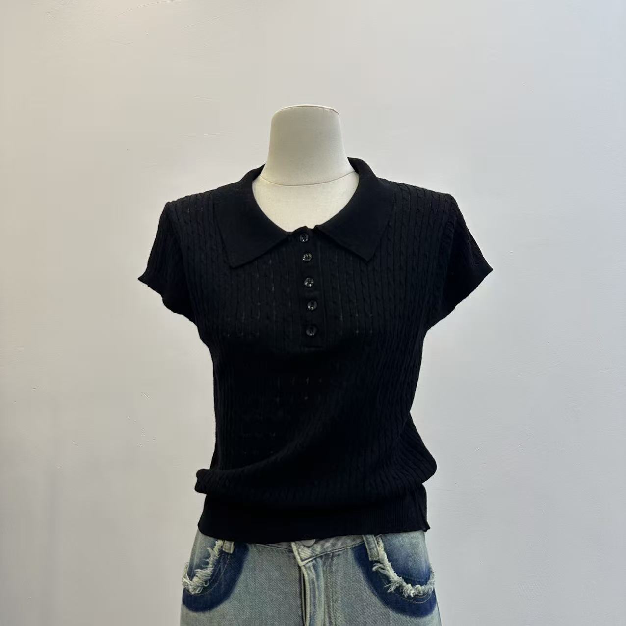 레트로 POLO 칼라 니트 반팔 티셔츠 여성 여름 얇은 스타일 패션 품격 몸매 가꾸기 슬림해 보이는 Chic chic 맨위