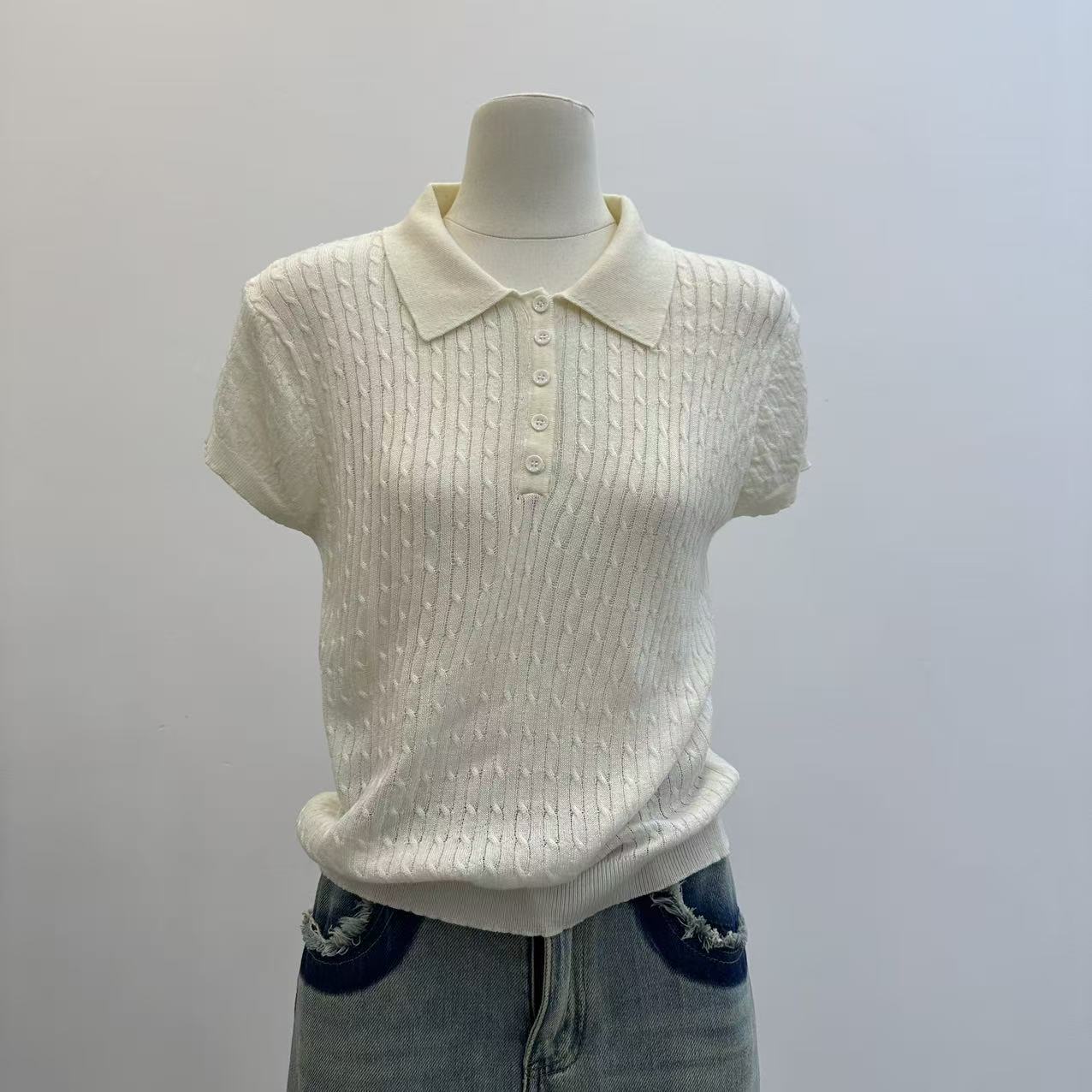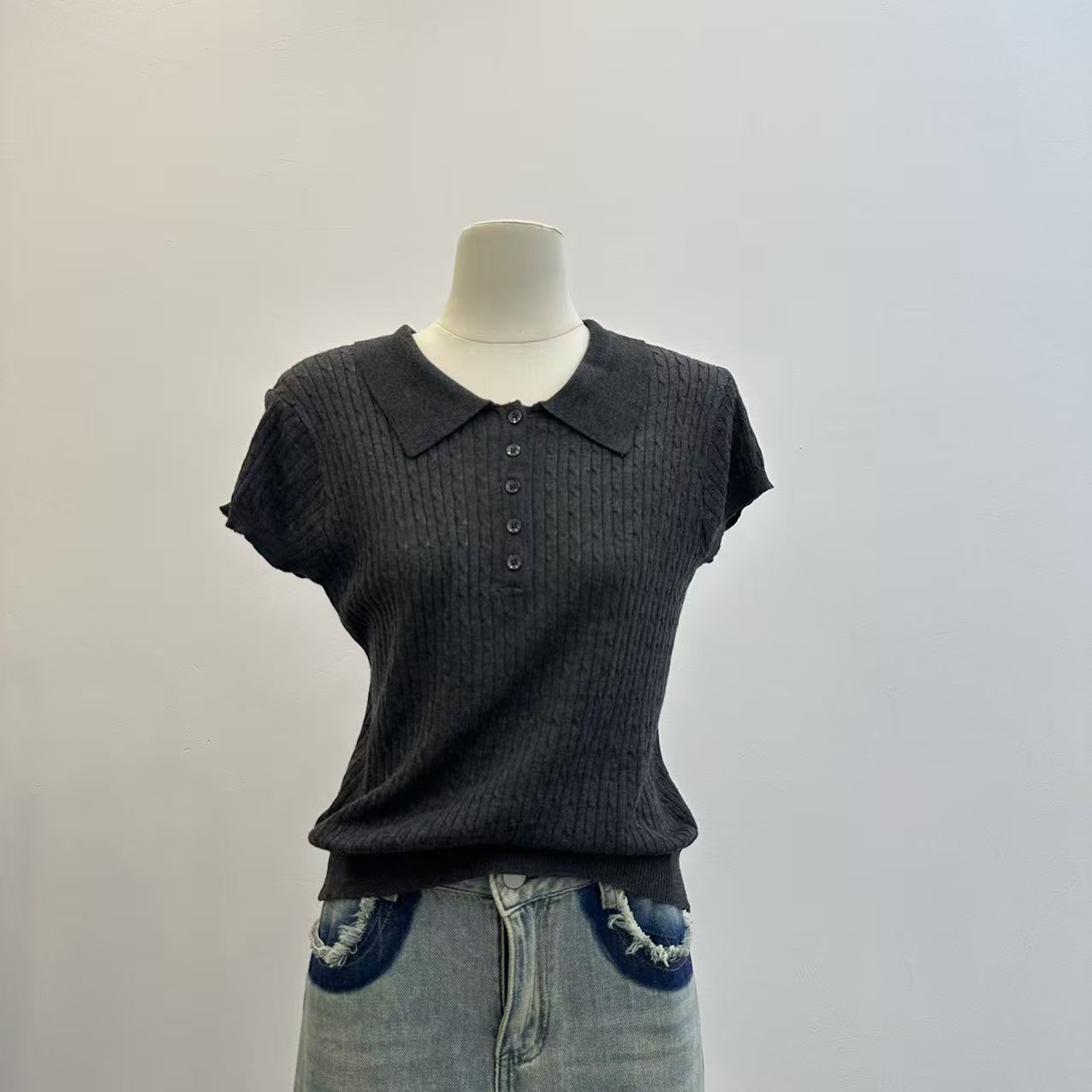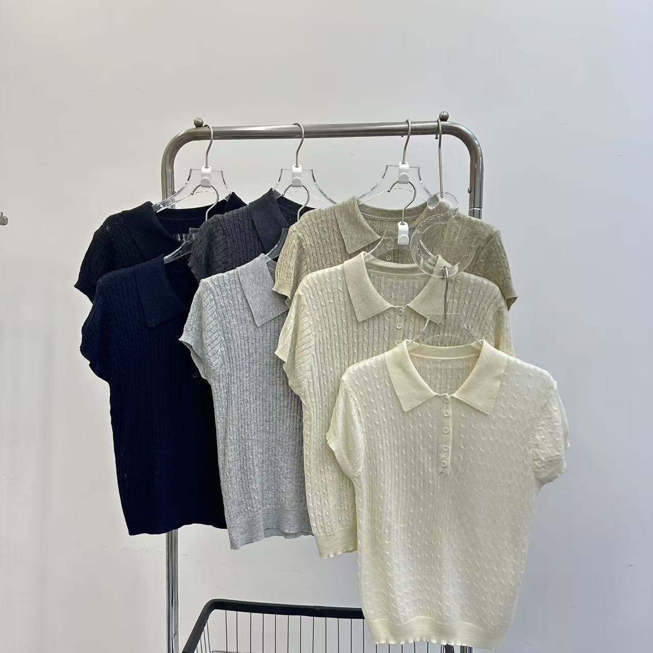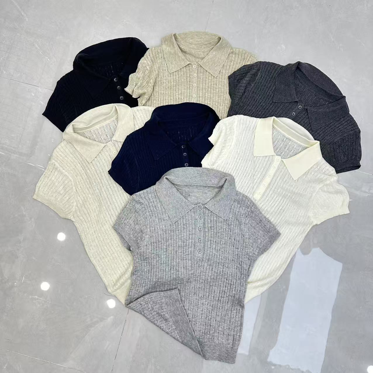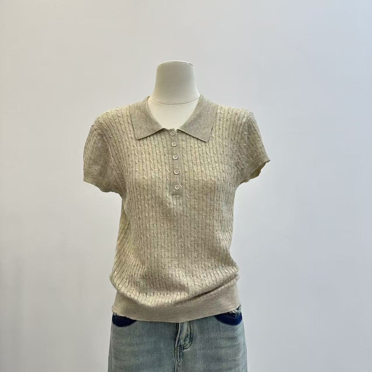레트로 POLO 칼라 니트 반팔 티셔츠 여성 여름 얇은 스타일 패션 품격 몸매 가꾸기 슬림해 보이는 Chic chic 맨위