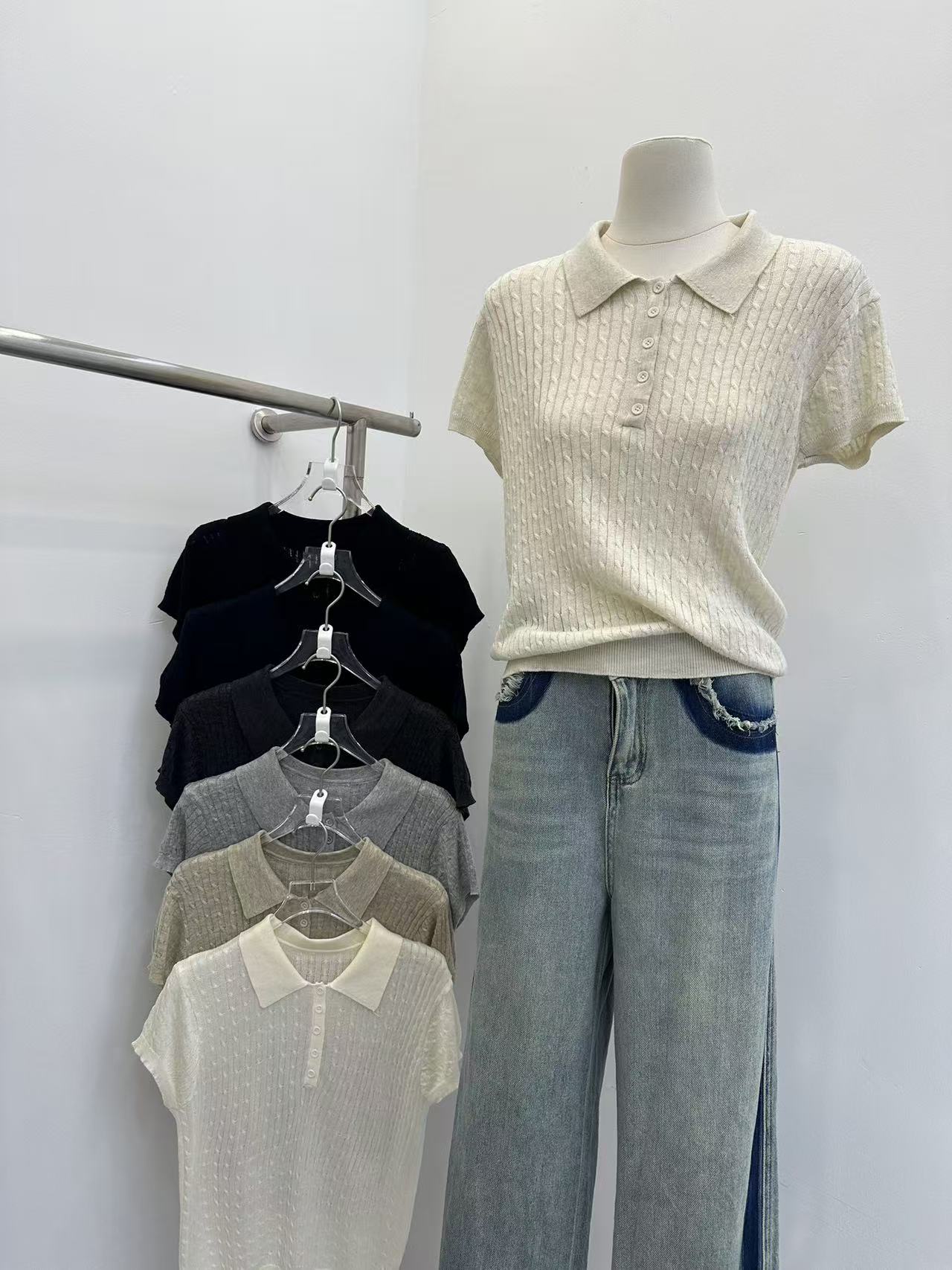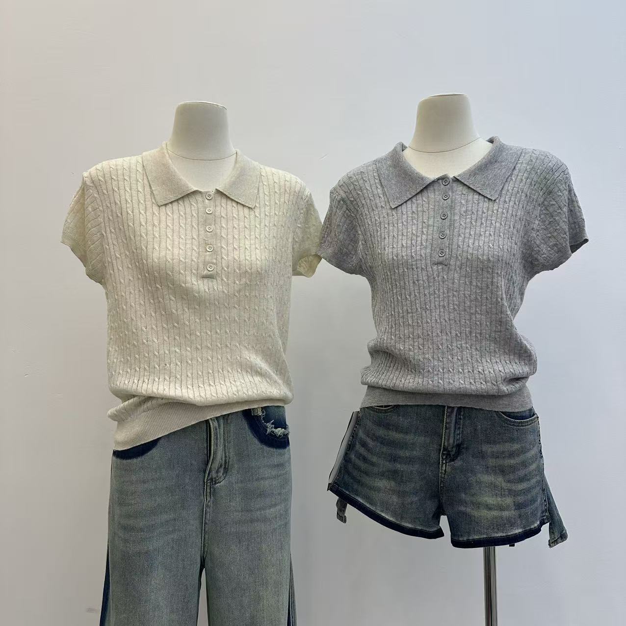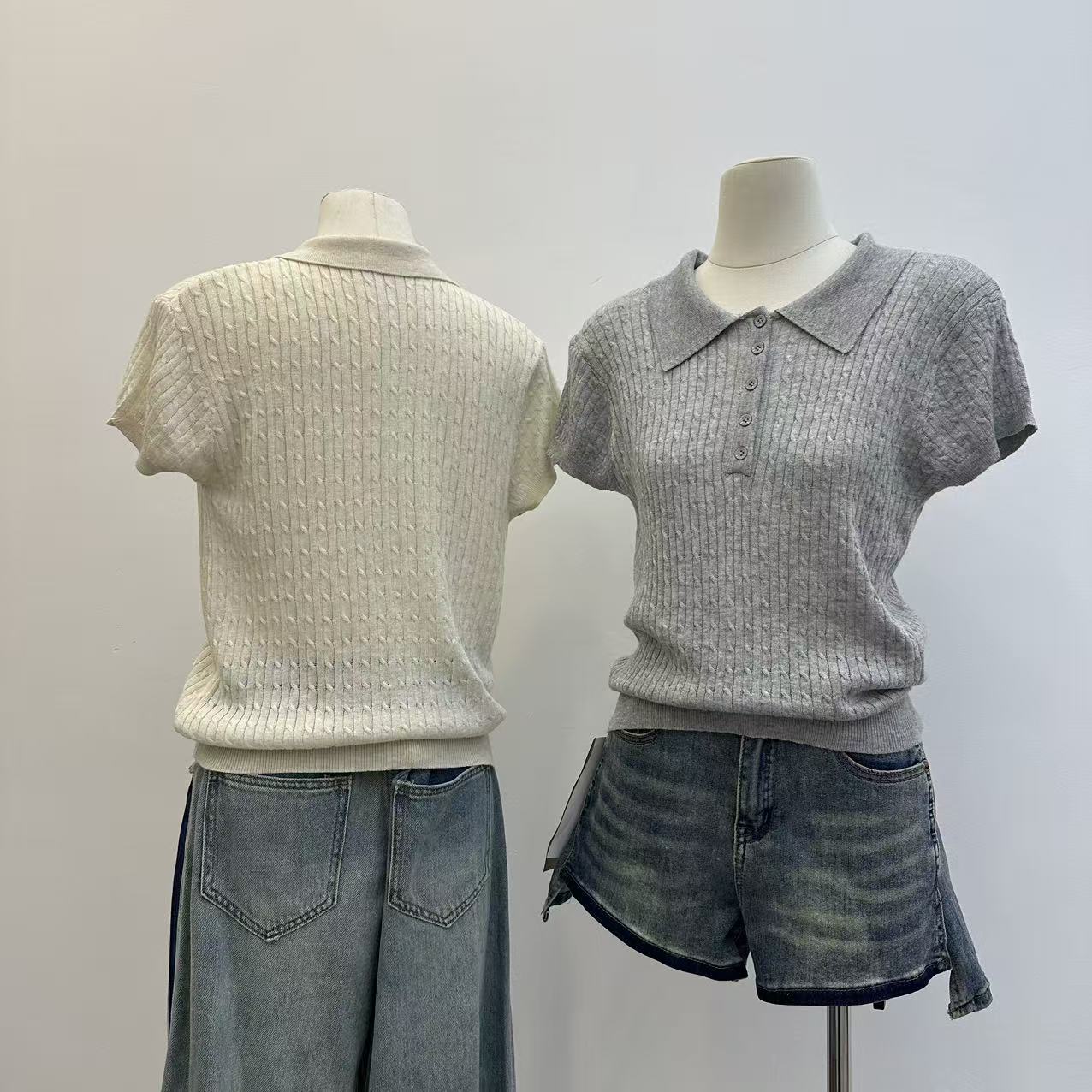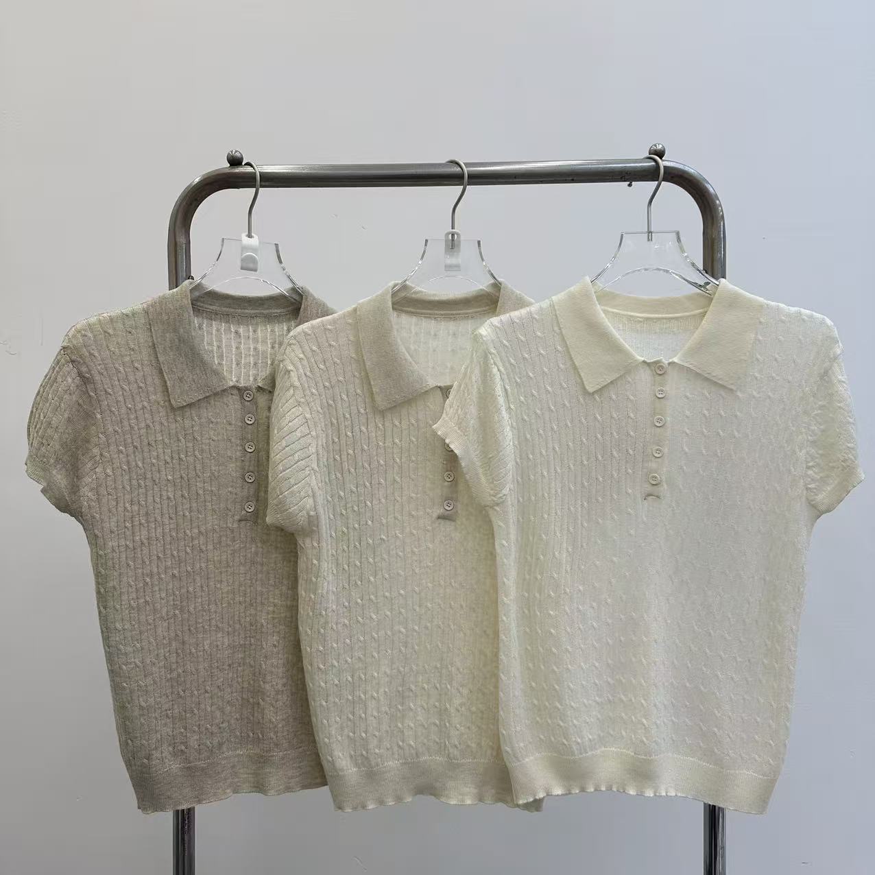 레트로 POLO 칼라 니트 반팔 티셔츠 여성 여름 얇은 스타일 패션 품격 몸매 가꾸기 슬림해 보이는 Chic chic 맨위