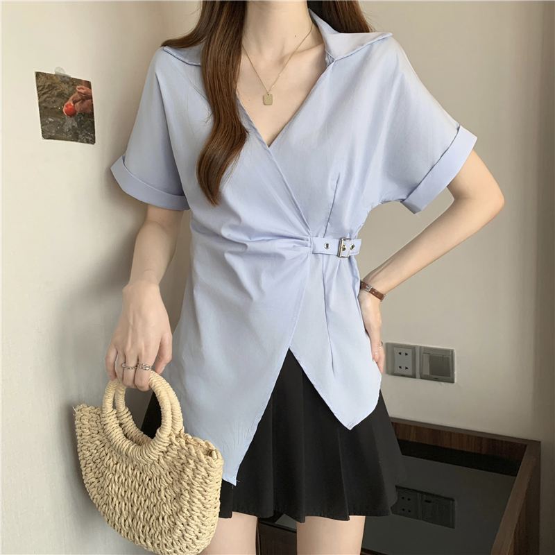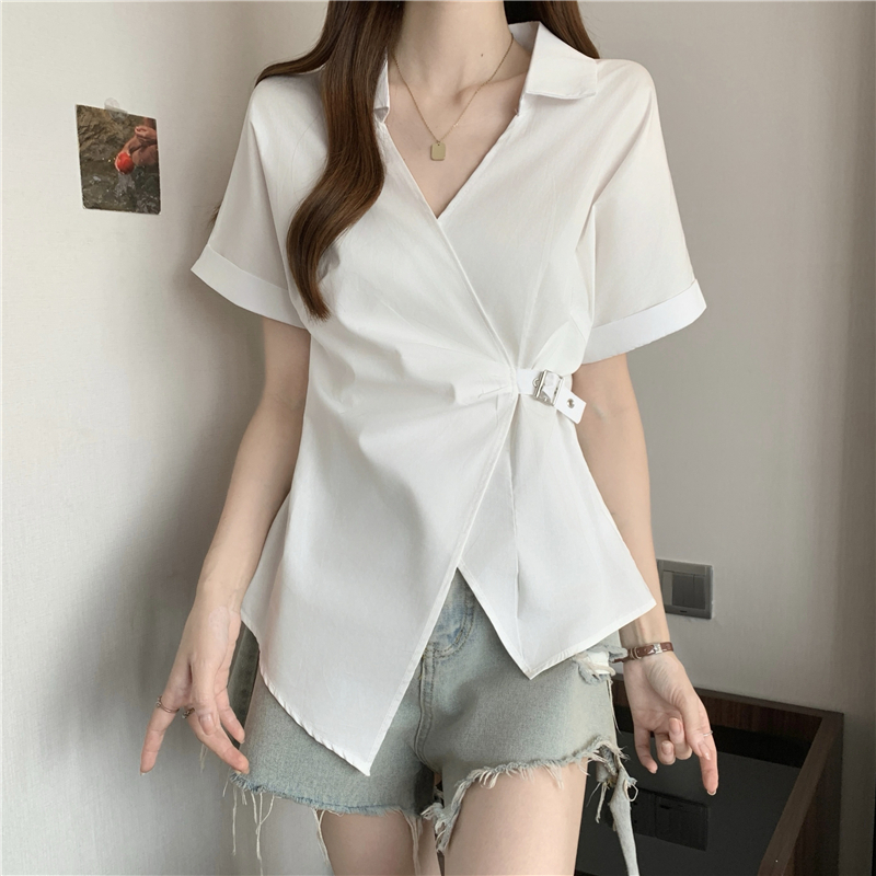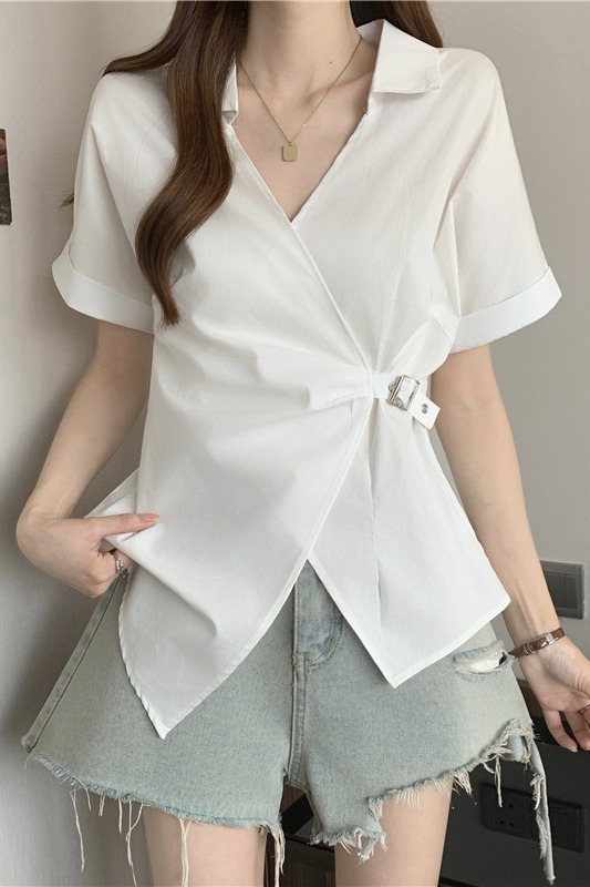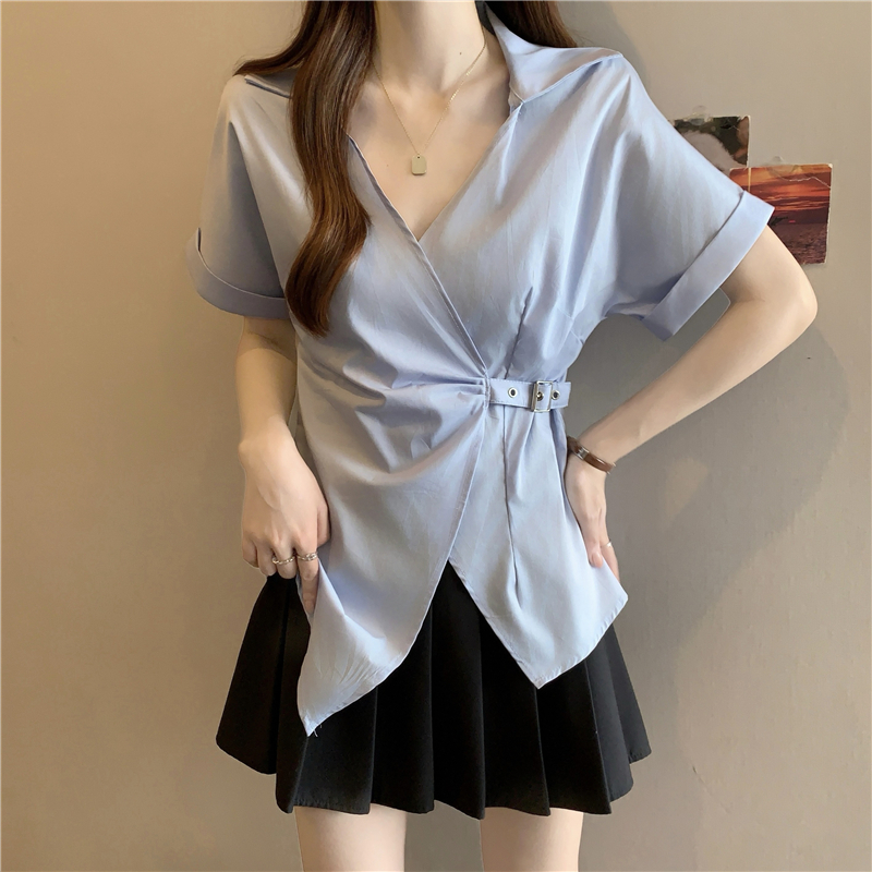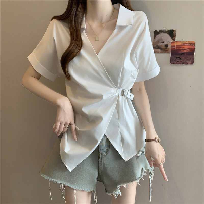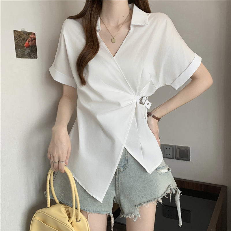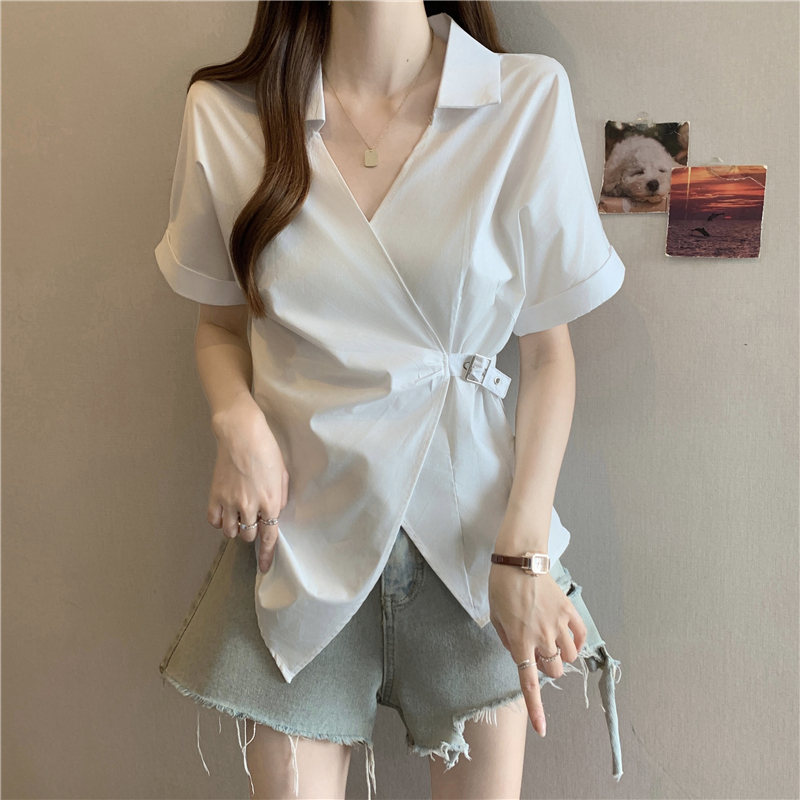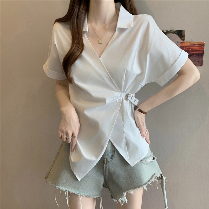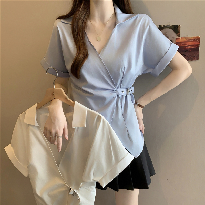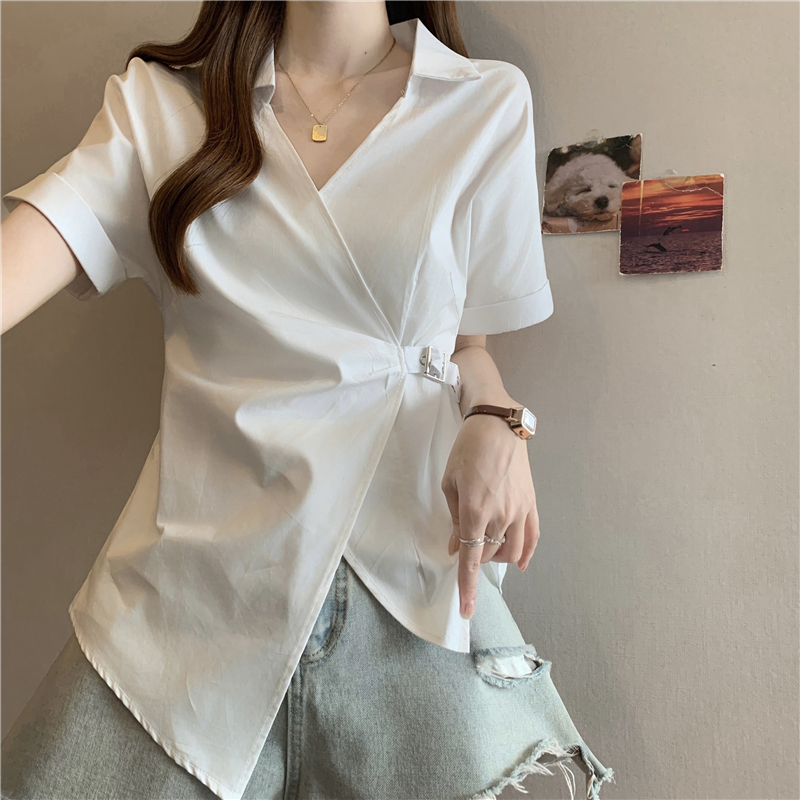 프랑스식 화이트 V넥 긍정적 인 어깨 반팔 여성 셔츠 여름 빅 사이즈 지방 mm 스트랩 허리 수축 불규칙 리본 맨위