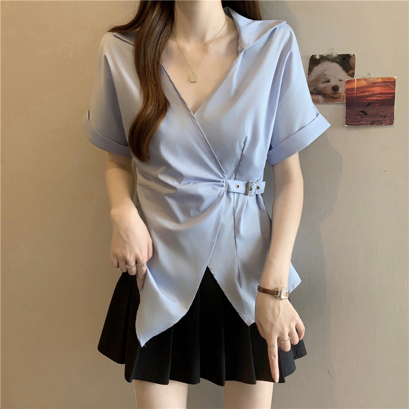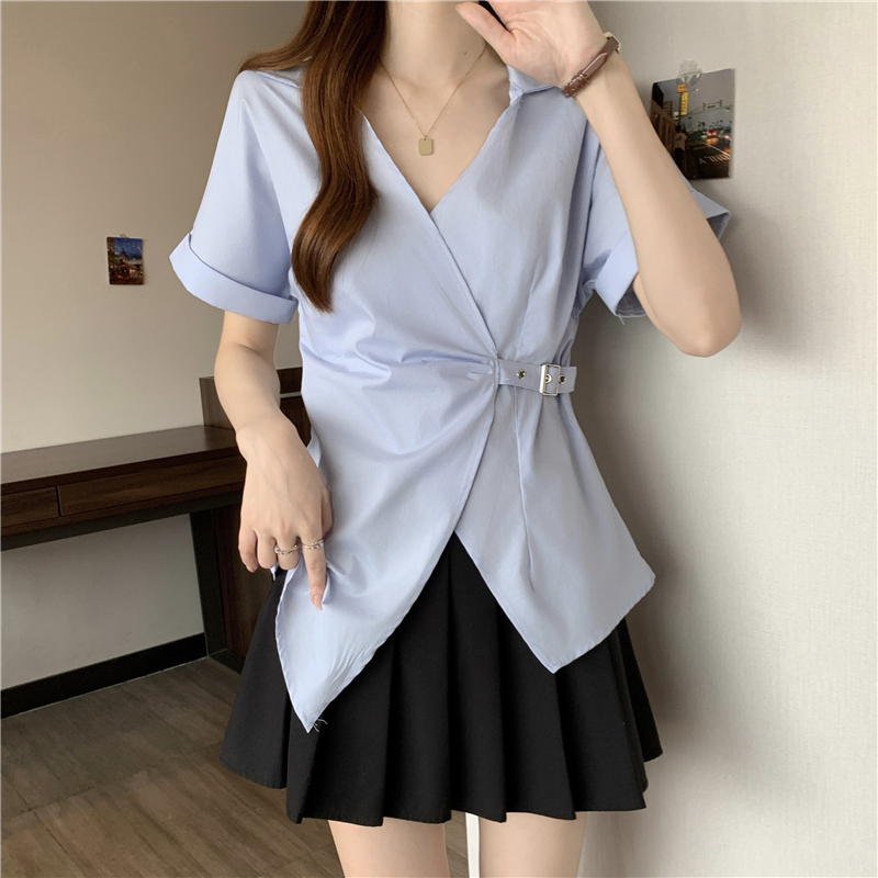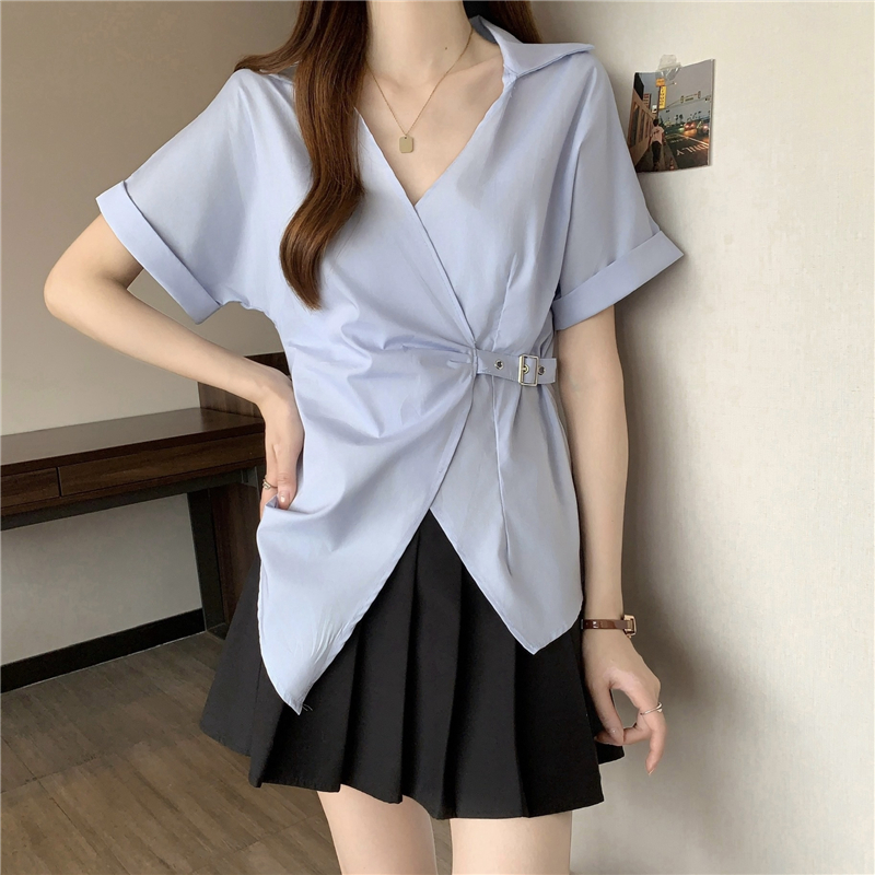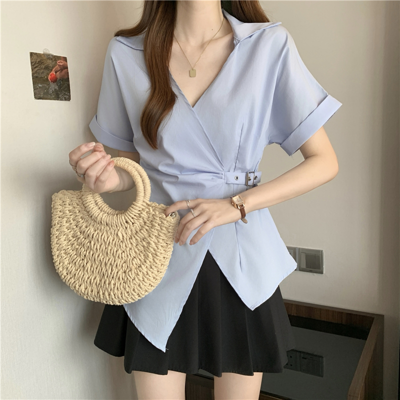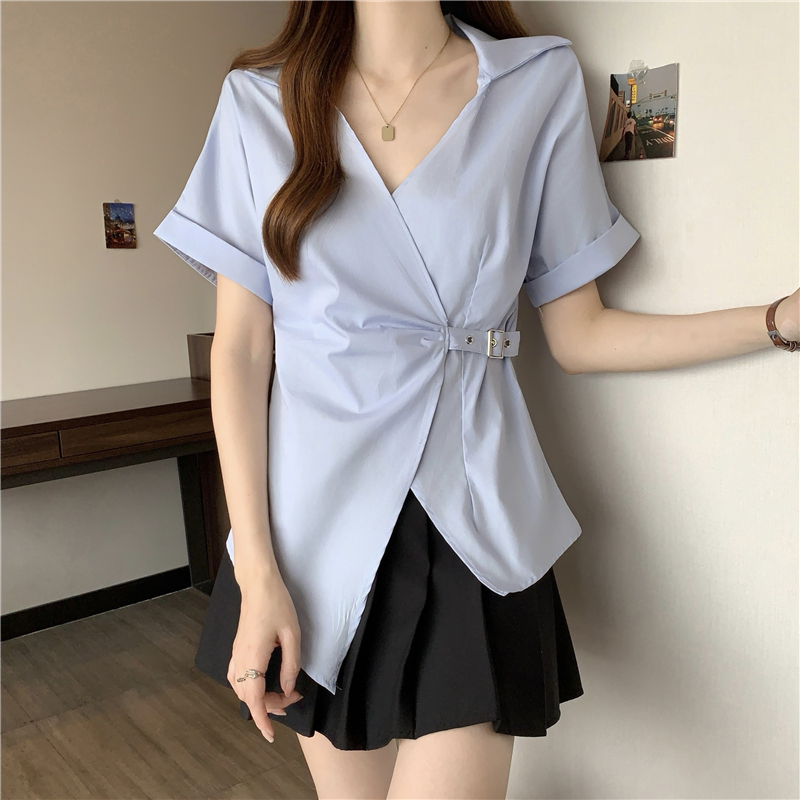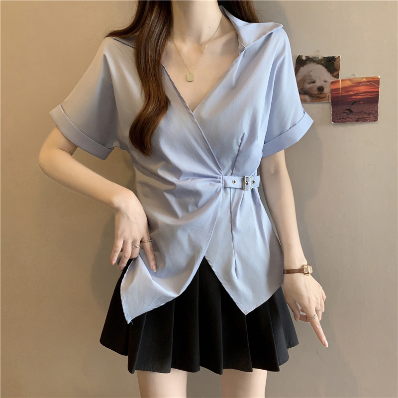 프랑스식 Chic 파란색 V넥 반팔 여성 셔츠 2026 여름 지방 mm 슬림해 보이는 불규칙 레이스업 허리 수축 맨위