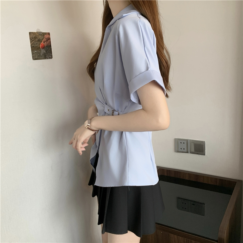 하늘색 외국 가스 레이스 칼라 작은 날다 반팔 여성 셔츠 2026 여름 지방 mm 레이스업 허리 수축 인형 셔츠 맨위