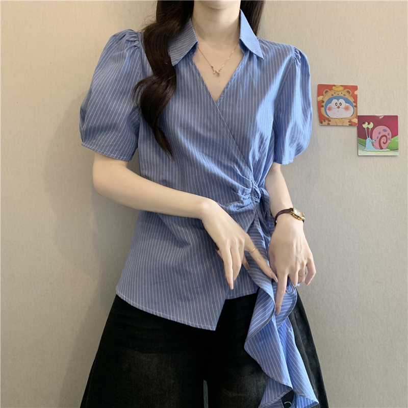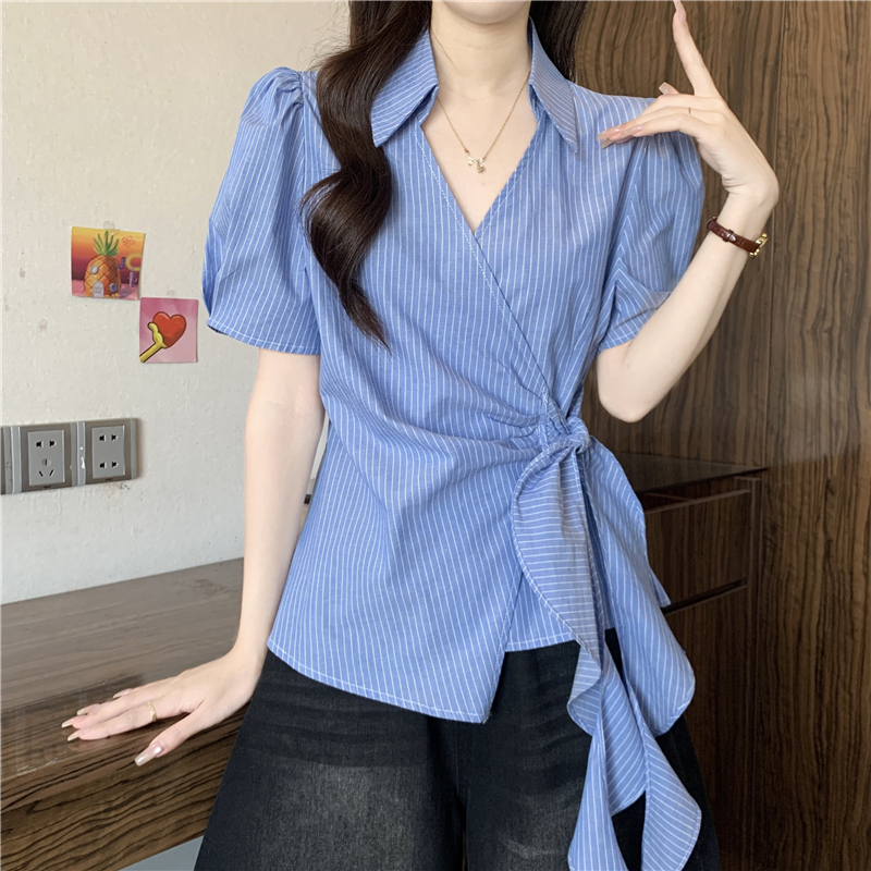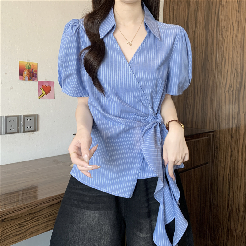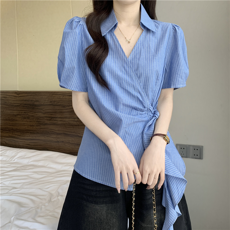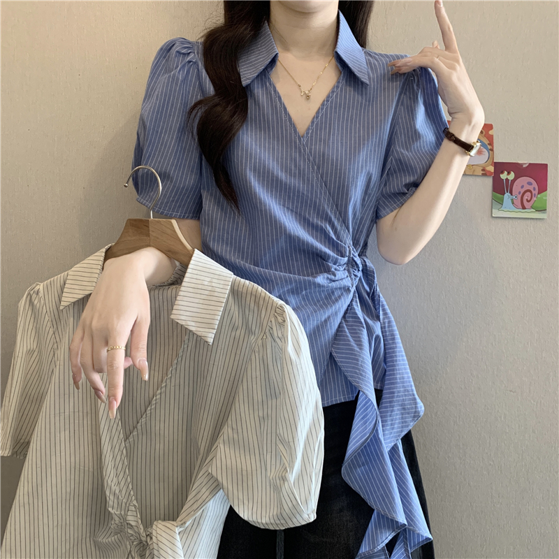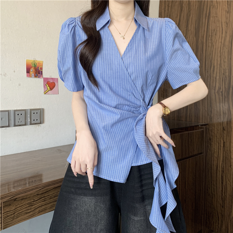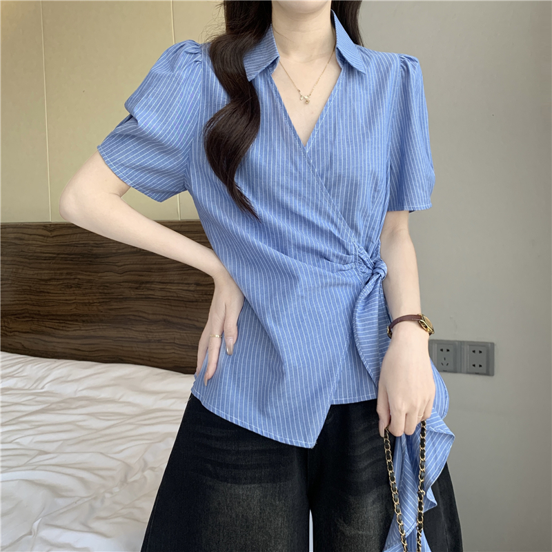 파란색 스트라이프 V넥 긍정적 인 어깨 반팔 여성 셔츠 여름 빅 사이즈 지방 mm 불규칙 스트랩 허리 수축 리본 맨위