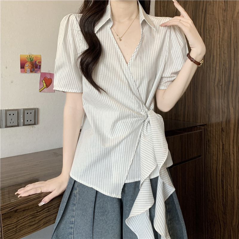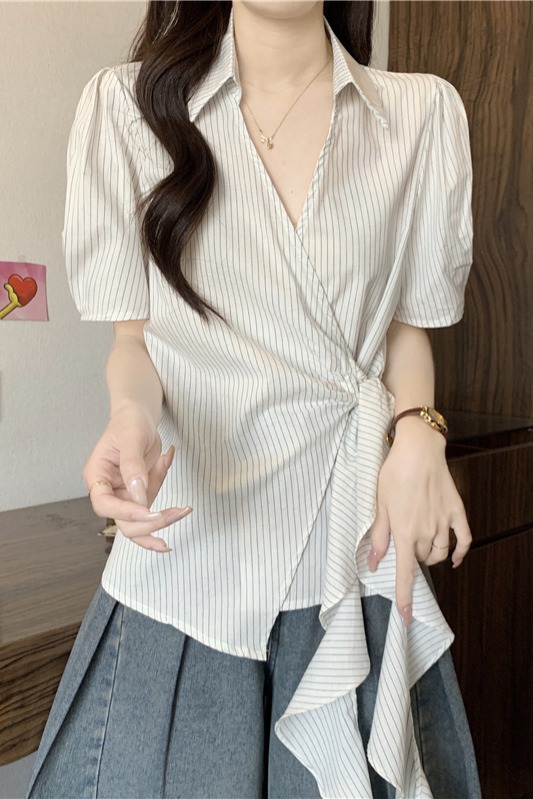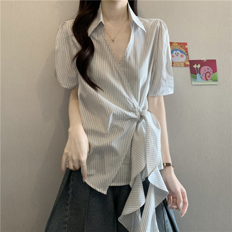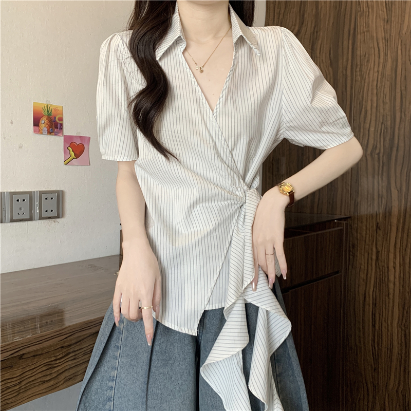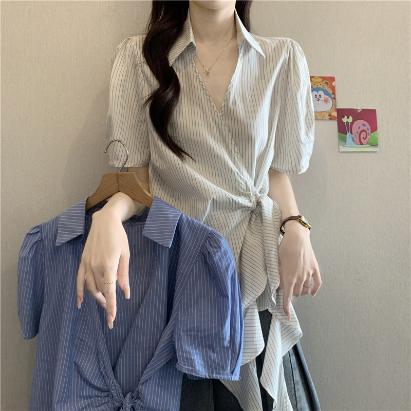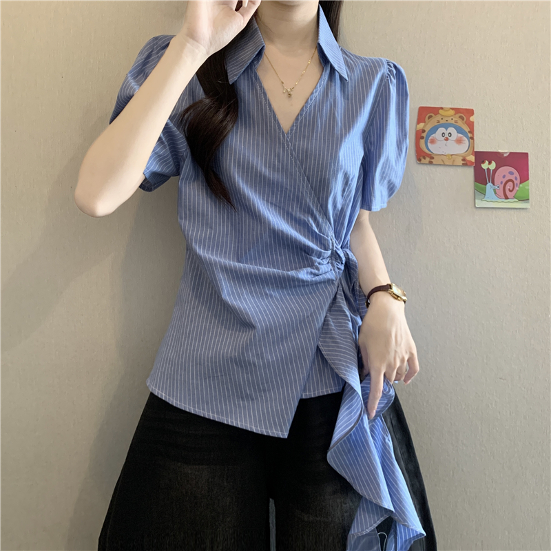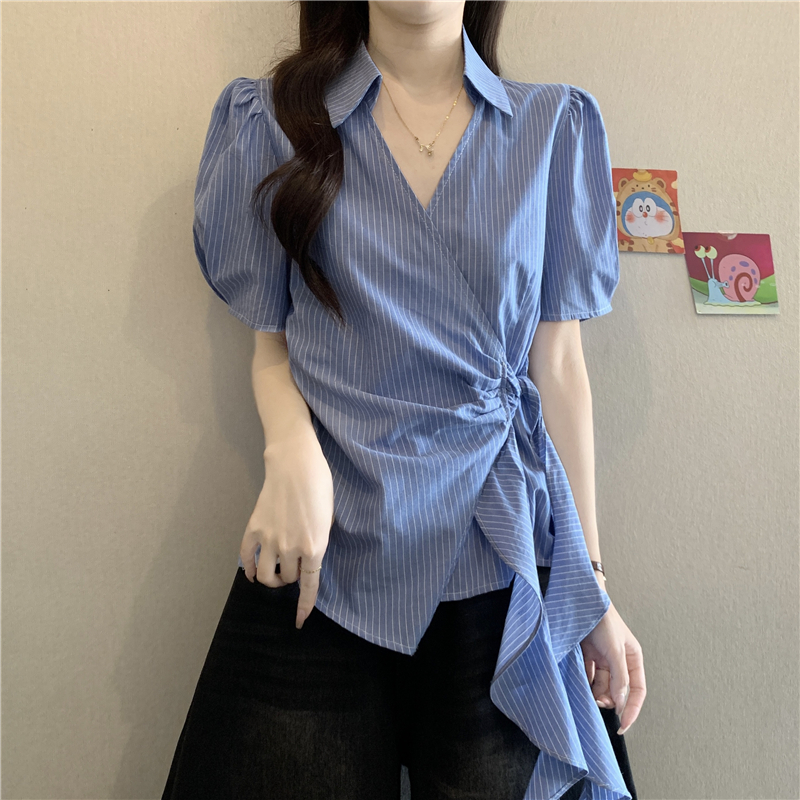 파란색 스트라이프 V넥 긍정적 인 어깨 반팔 여성 셔츠 여름 빅 사이즈 지방 mm 불규칙 스트랩 허리 수축 리본 맨위