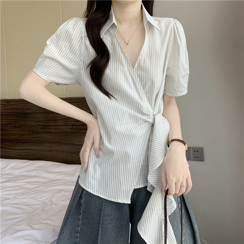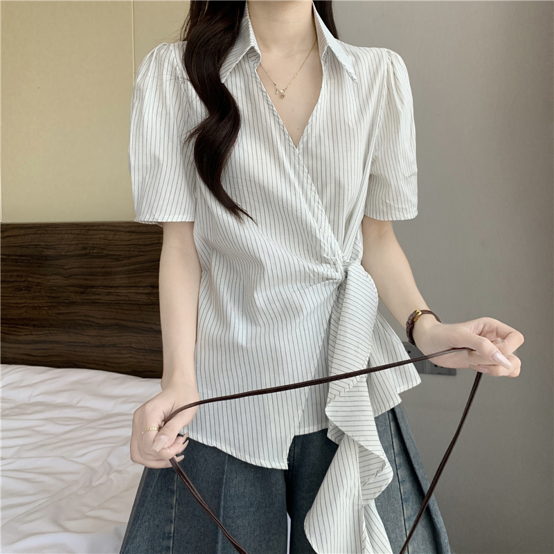 프랑스식 화이트 V넥 긍정적 인 어깨 반팔 여성 셔츠 여름 빅 사이즈 지방 mm 스트랩 허리 수축 불규칙 리본 맨위