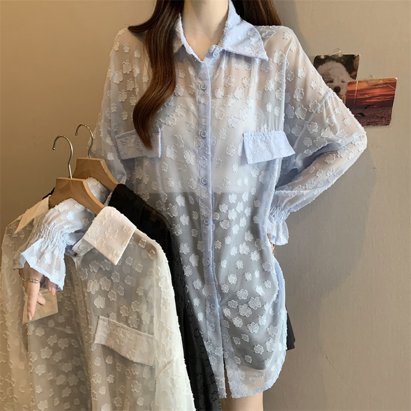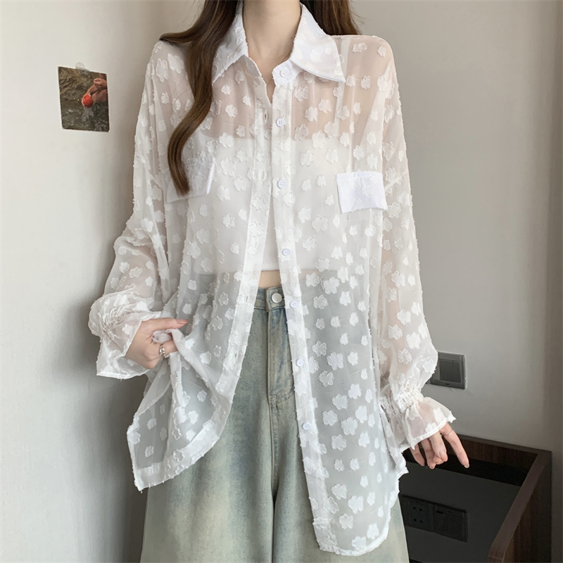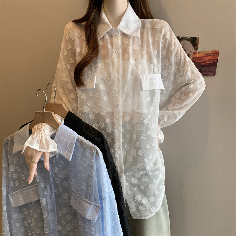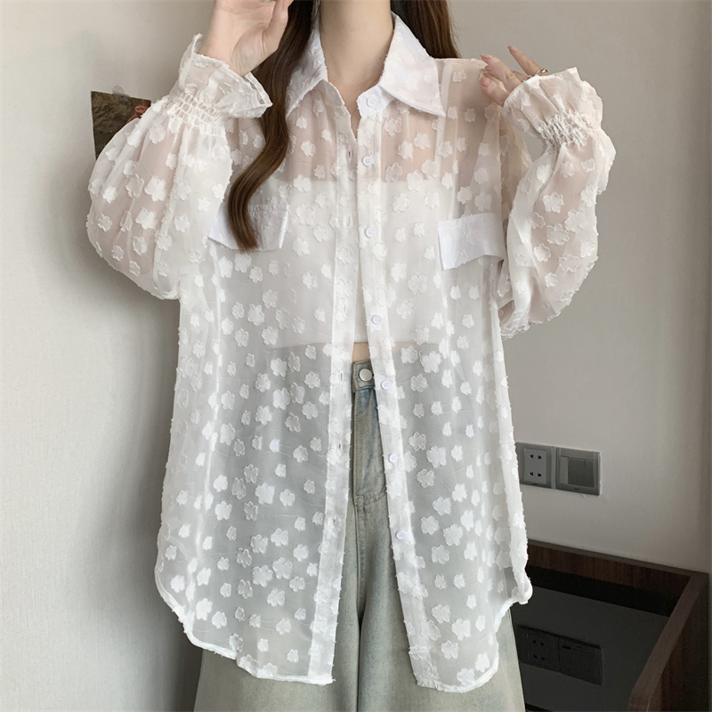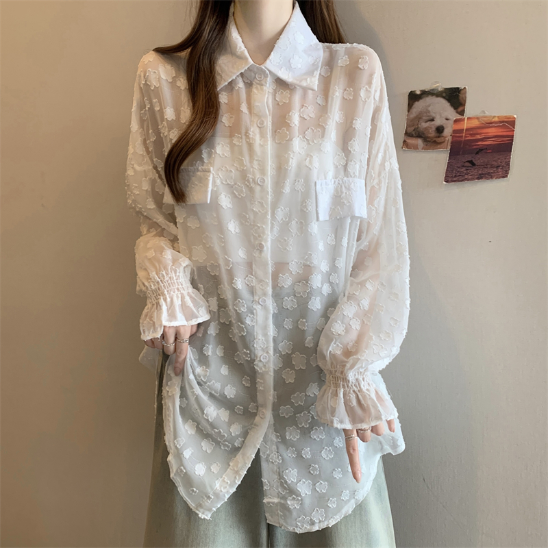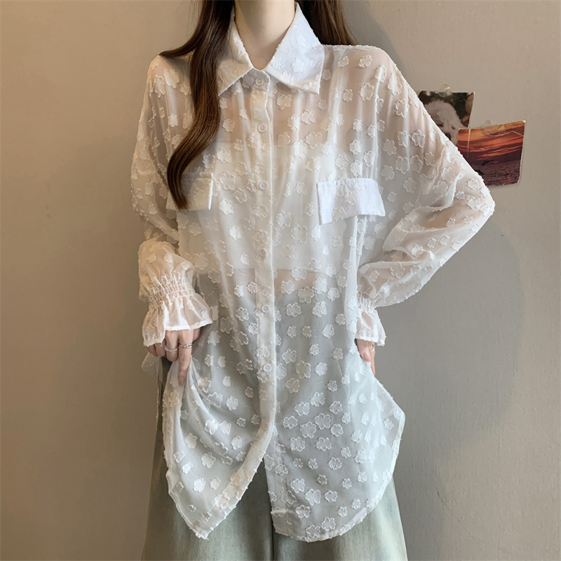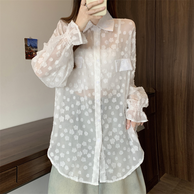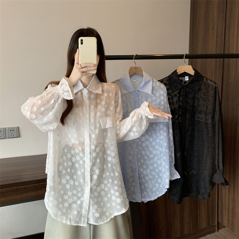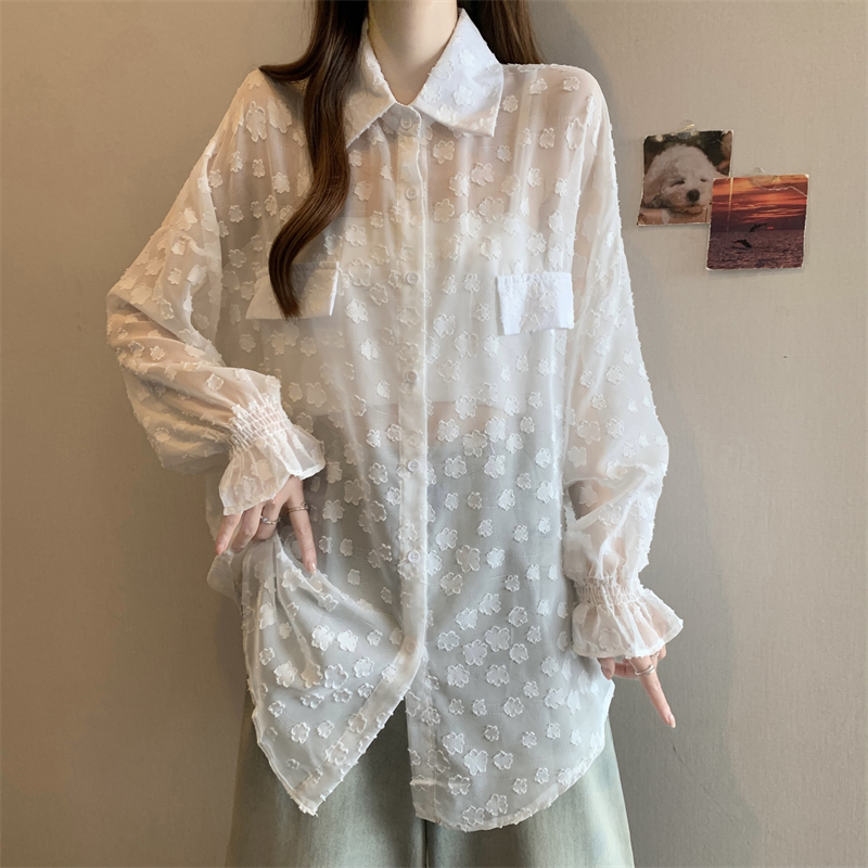 레이스 홀로우 아웃 자카드 긴팔 화이트 여성 셔츠 여름 빅 사이즈 지방 mm 루즈핏 표지 배 POLO 칼라 맨위