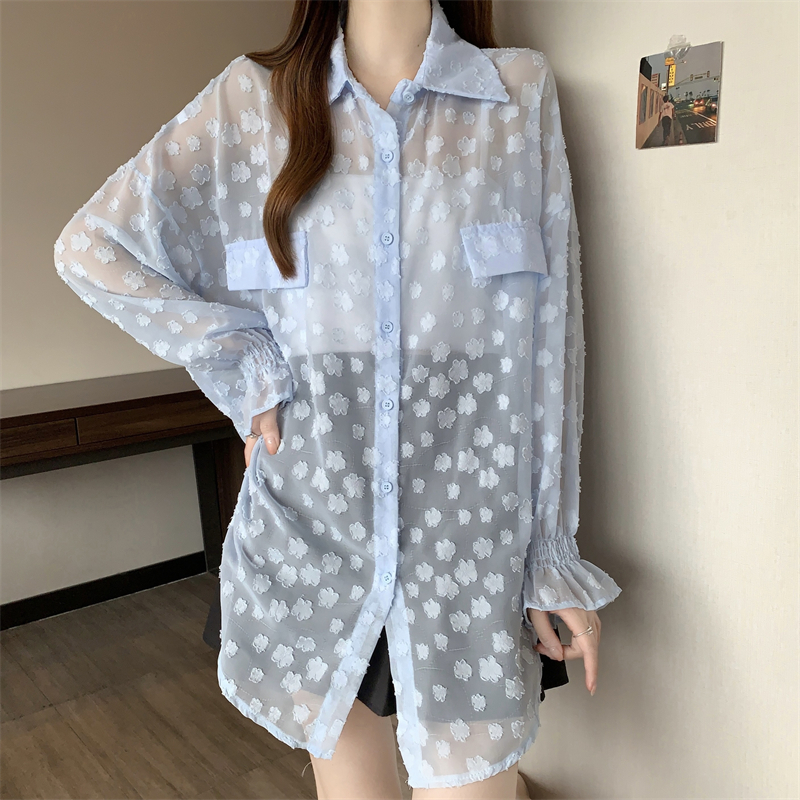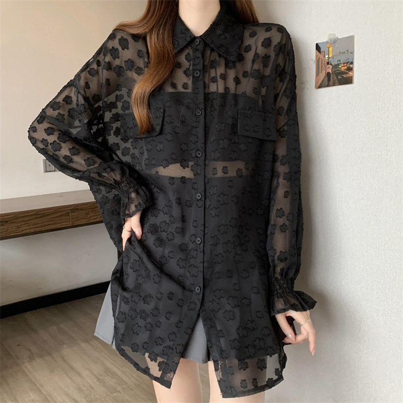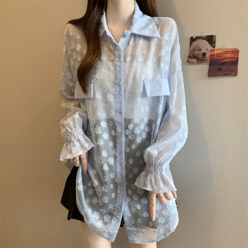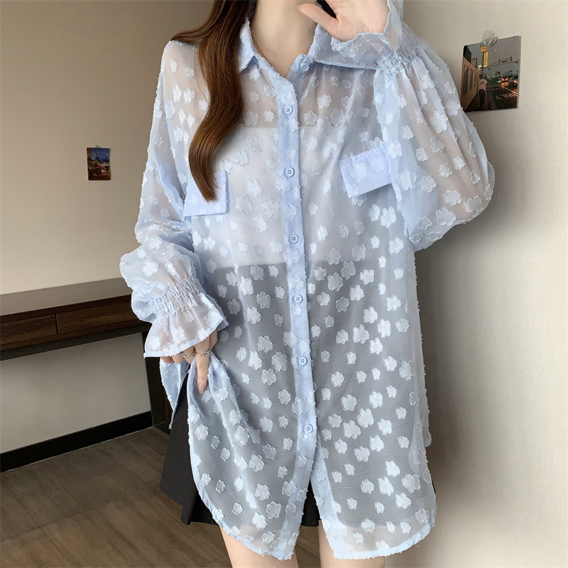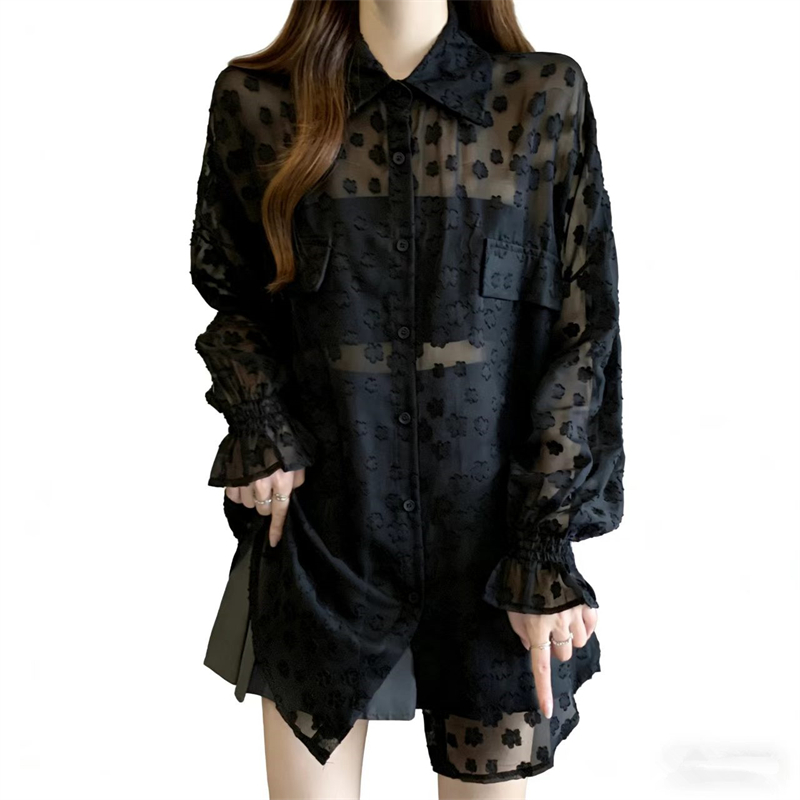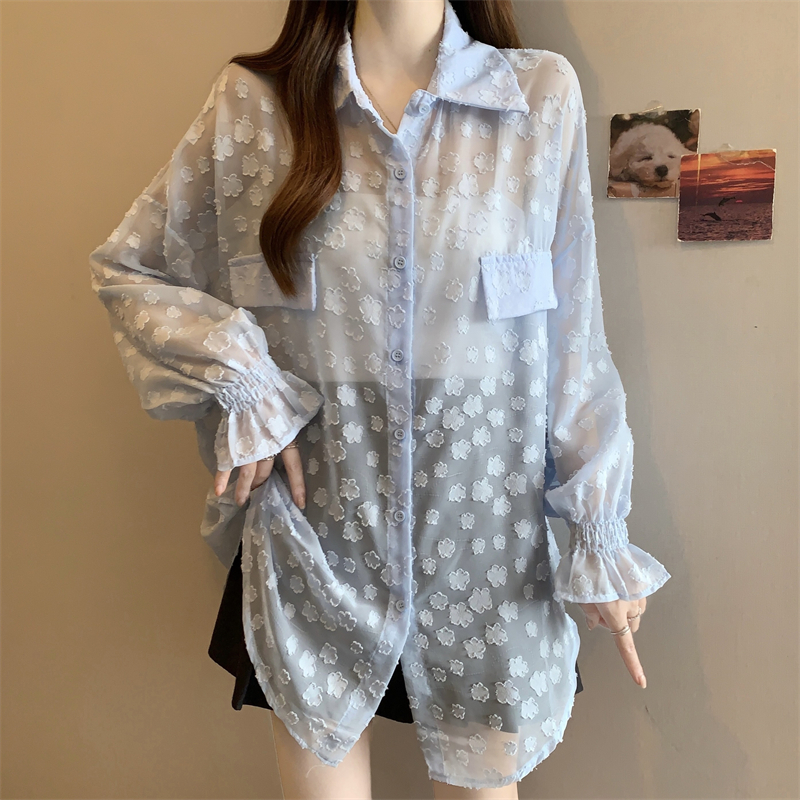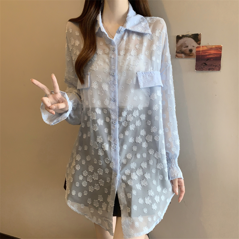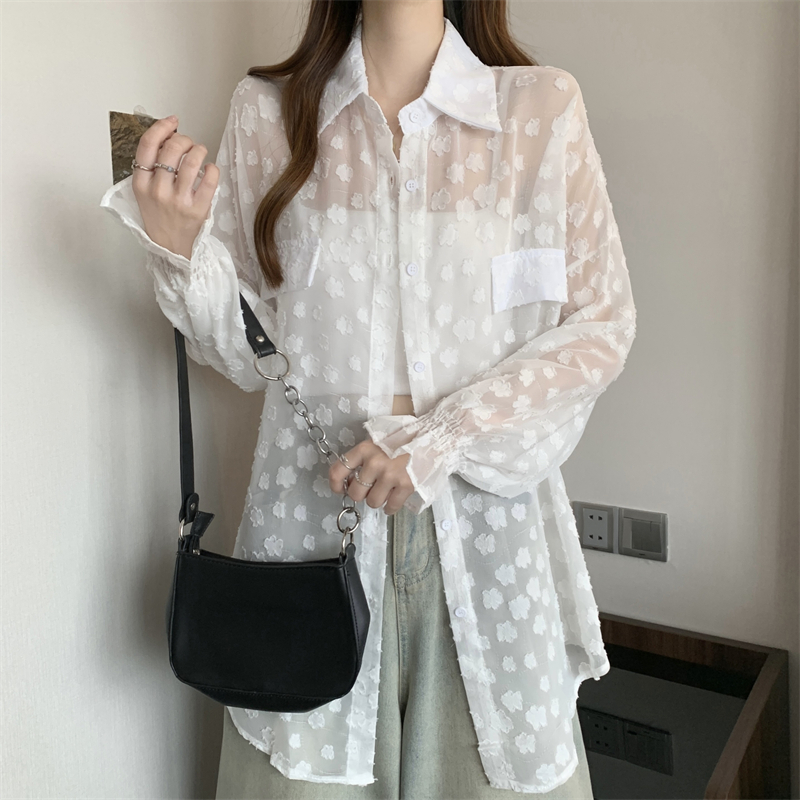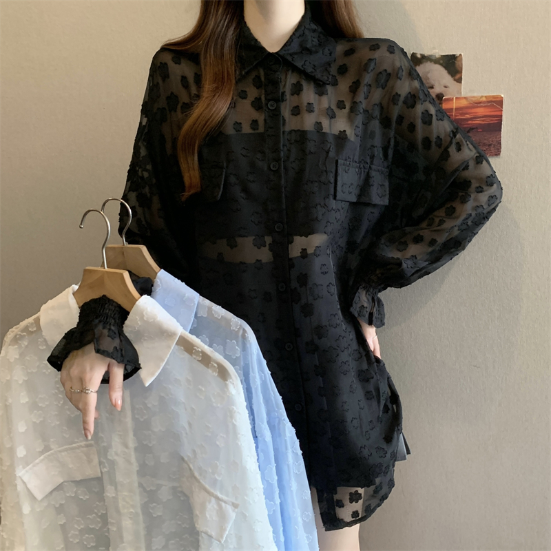 레이스 홀로우 아웃 자카드 긴팔 화이트 여성 셔츠 여름 빅 사이즈 지방 mm 루즈핏 표지 배 POLO 칼라 맨위