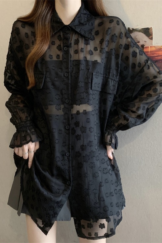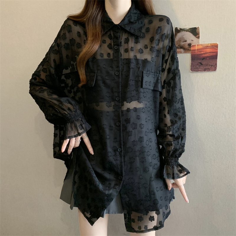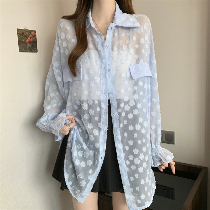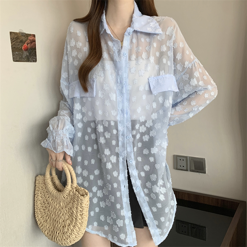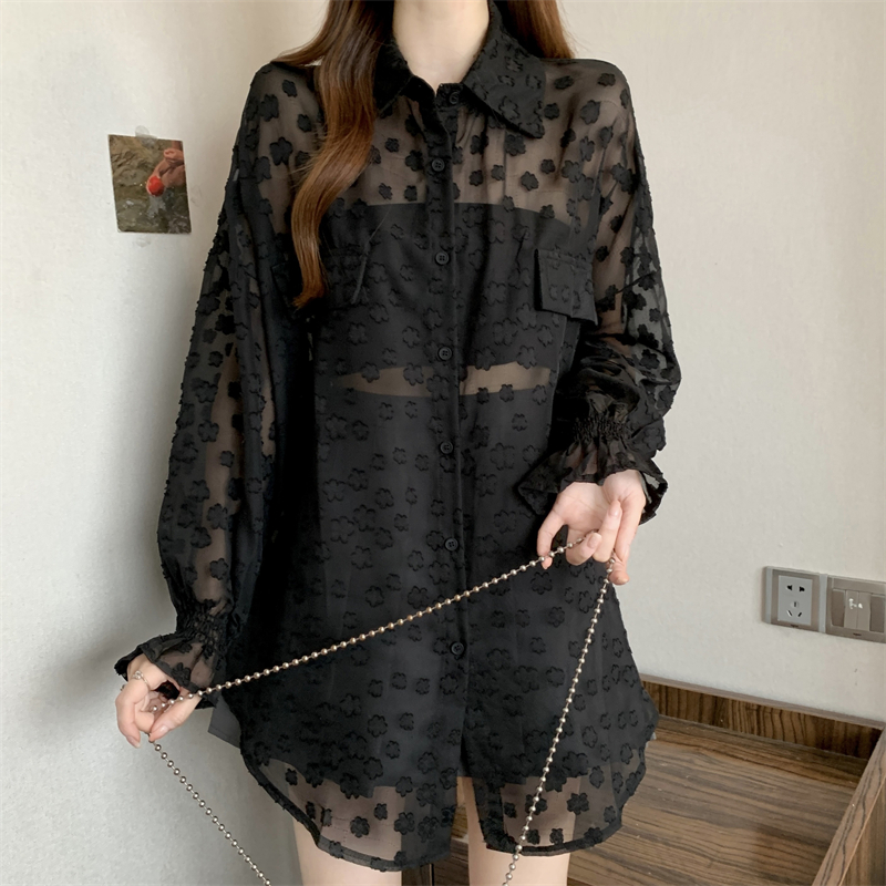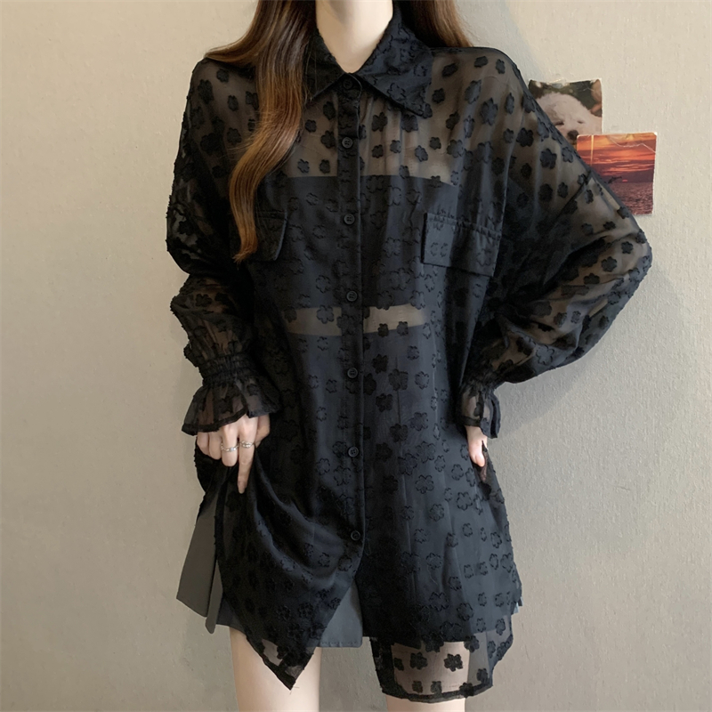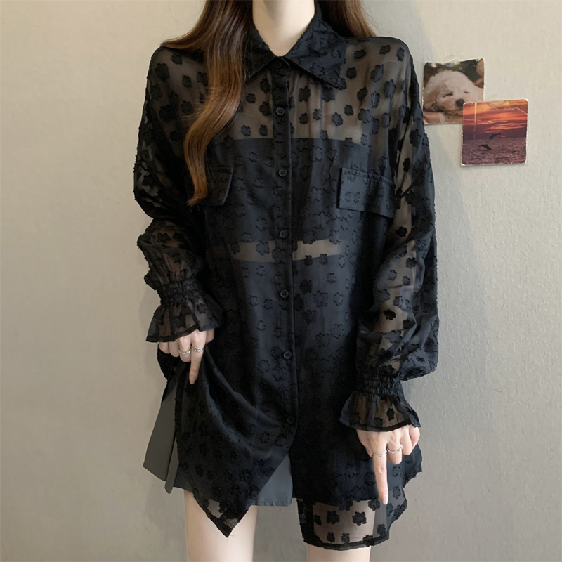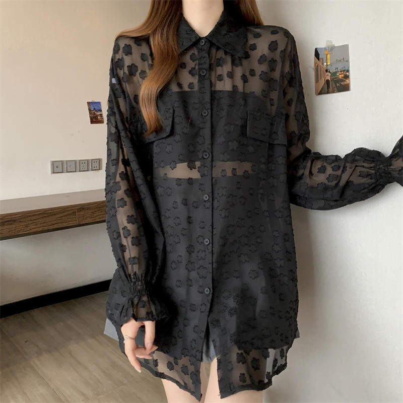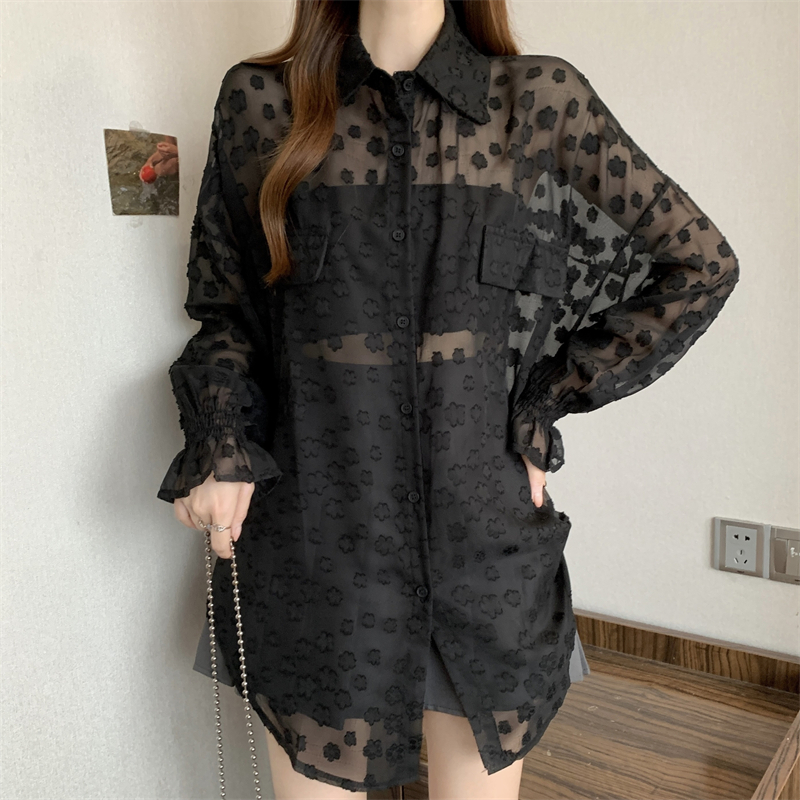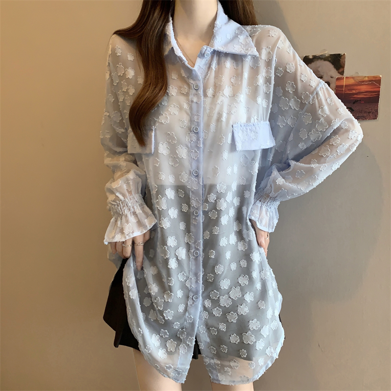 레이스 홀로우 아웃 자카드 긴팔 화이트 여성 셔츠 여름 빅 사이즈 지방 mm 루즈핏 표지 배 POLO 칼라 맨위