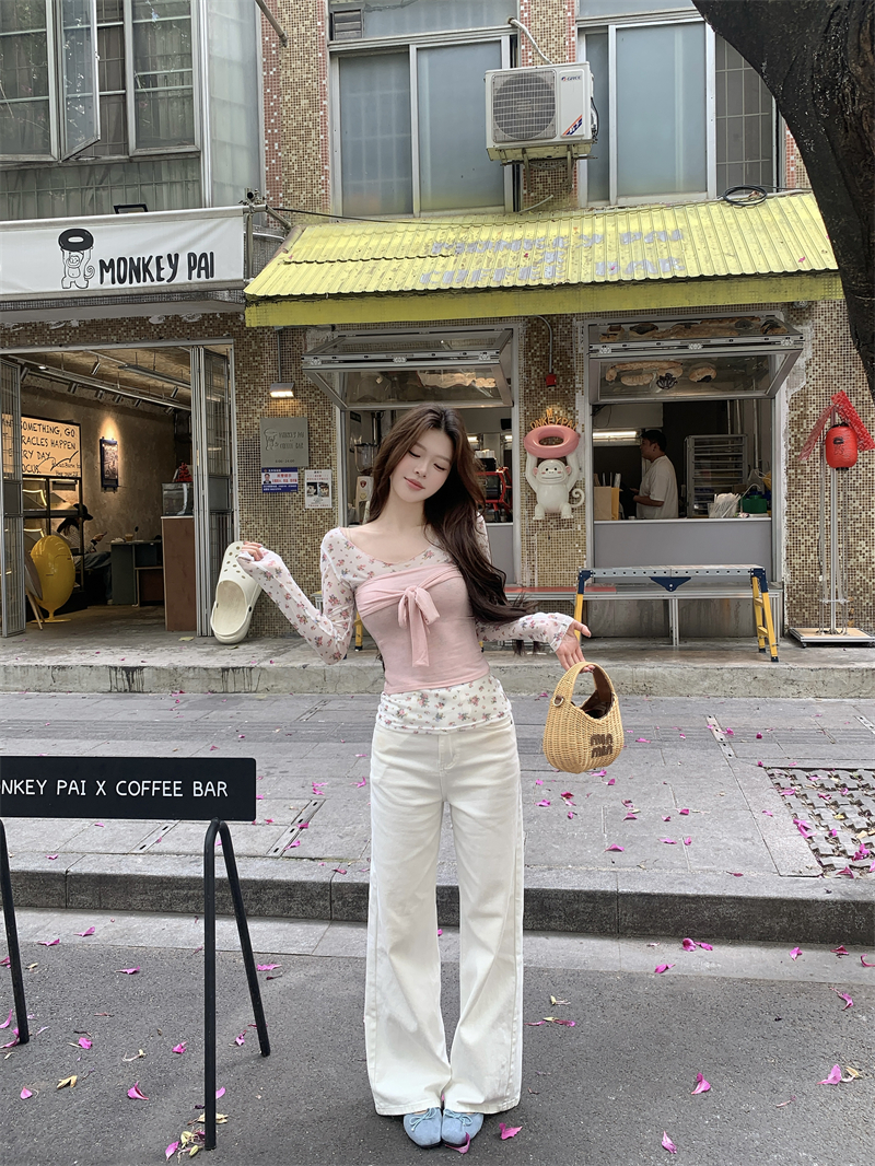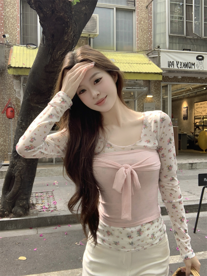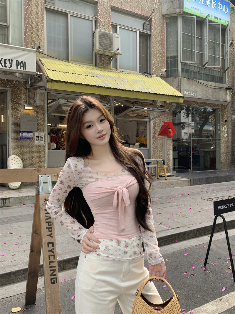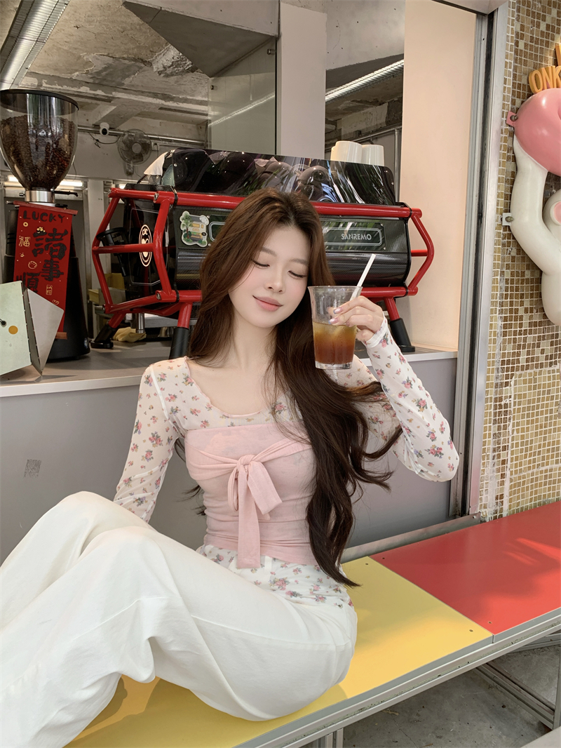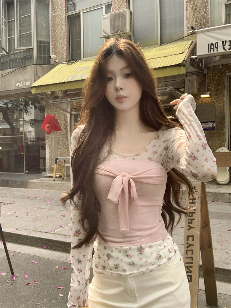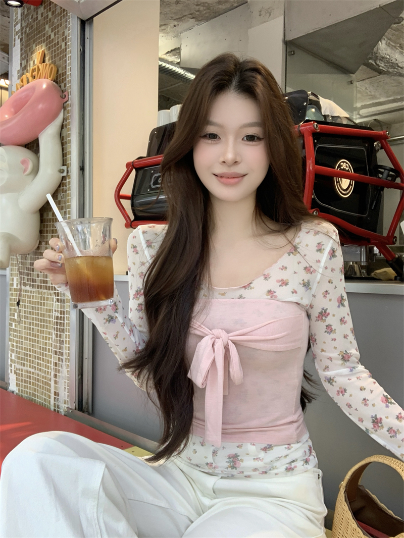 실사 정가 새로운 한국 스타일 핑크색 튜브탑 핑크색 꽃무늬 프린트 만나는 블라우스 2 세트