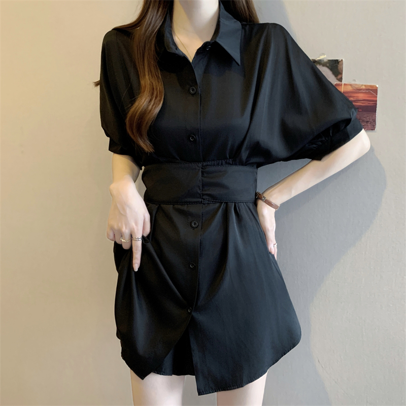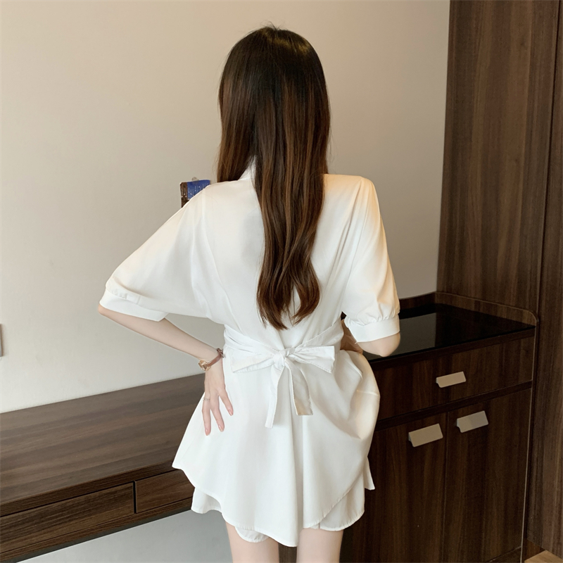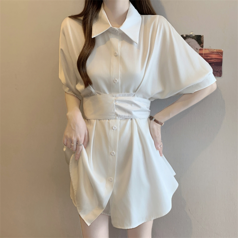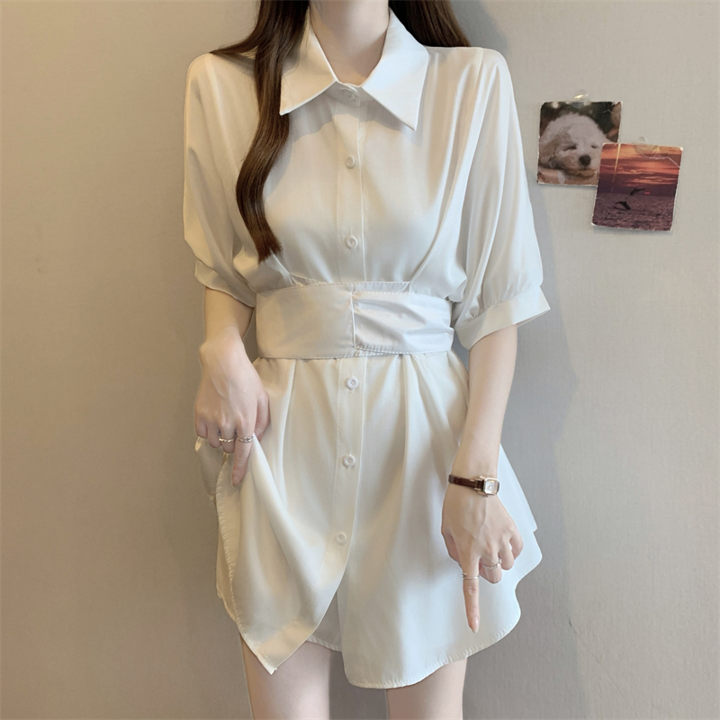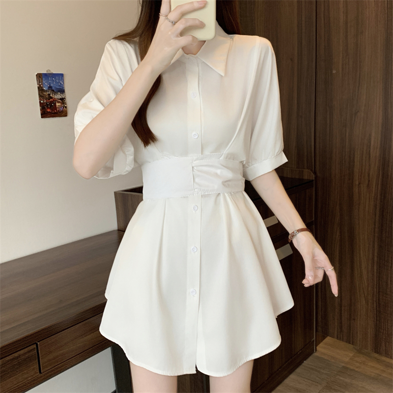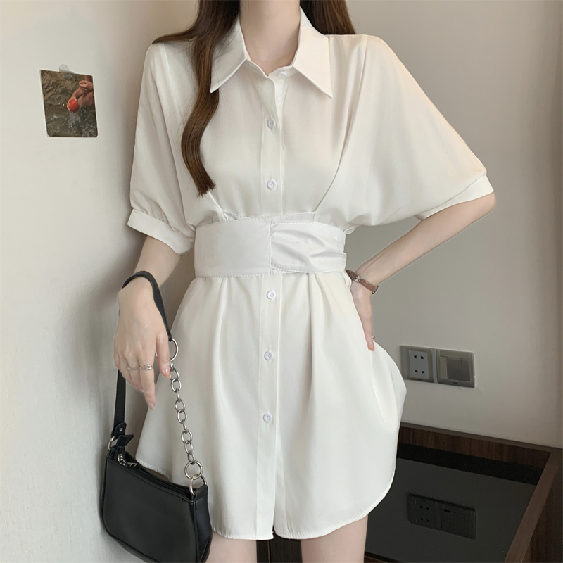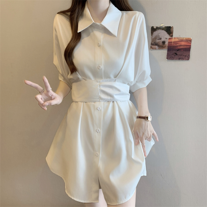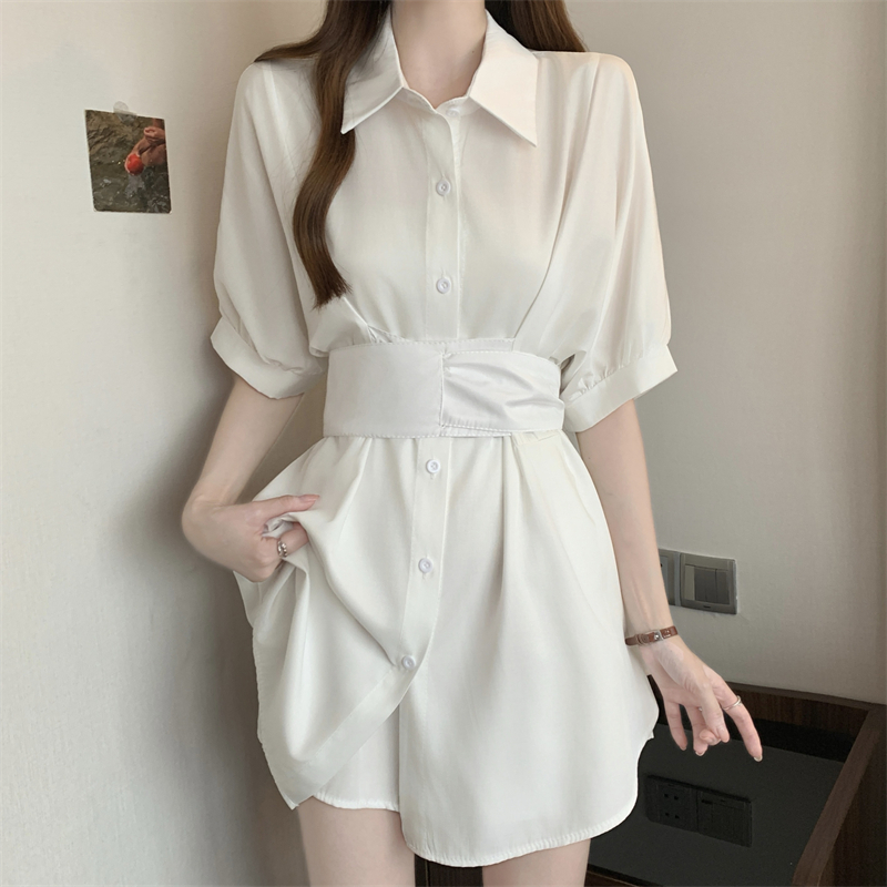 빅 사이즈 셔츠 세트 여성 여름 새로운 품격 허리 수축 POLO 칼라 셔츠 맨위 캐주얼 반바지 투피스 세트