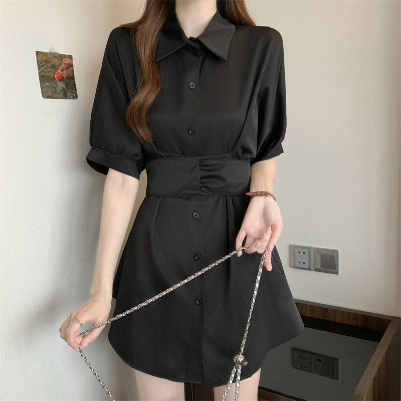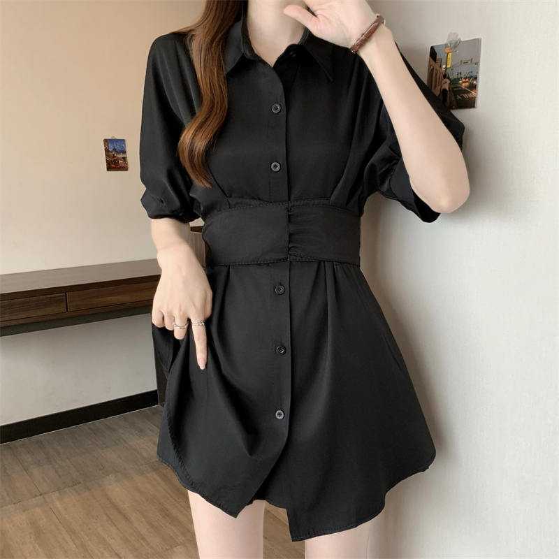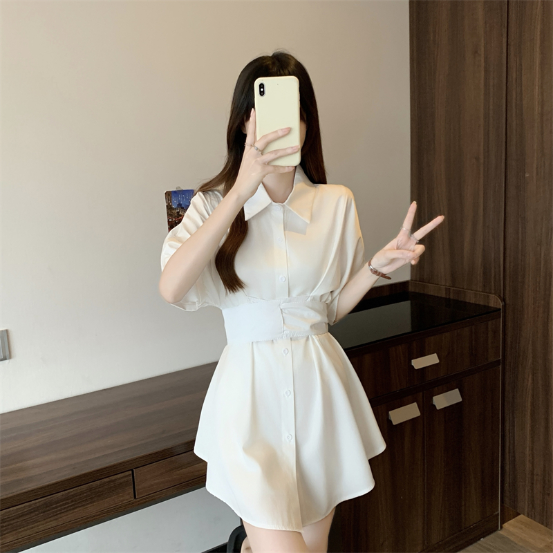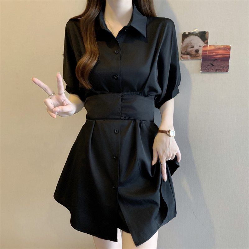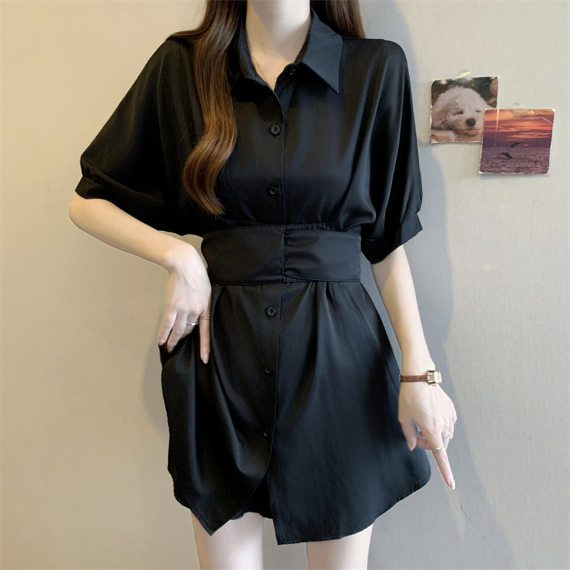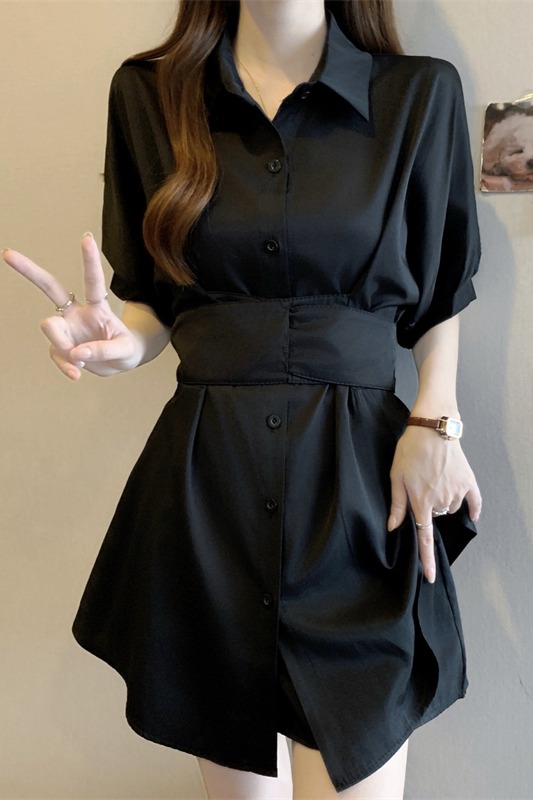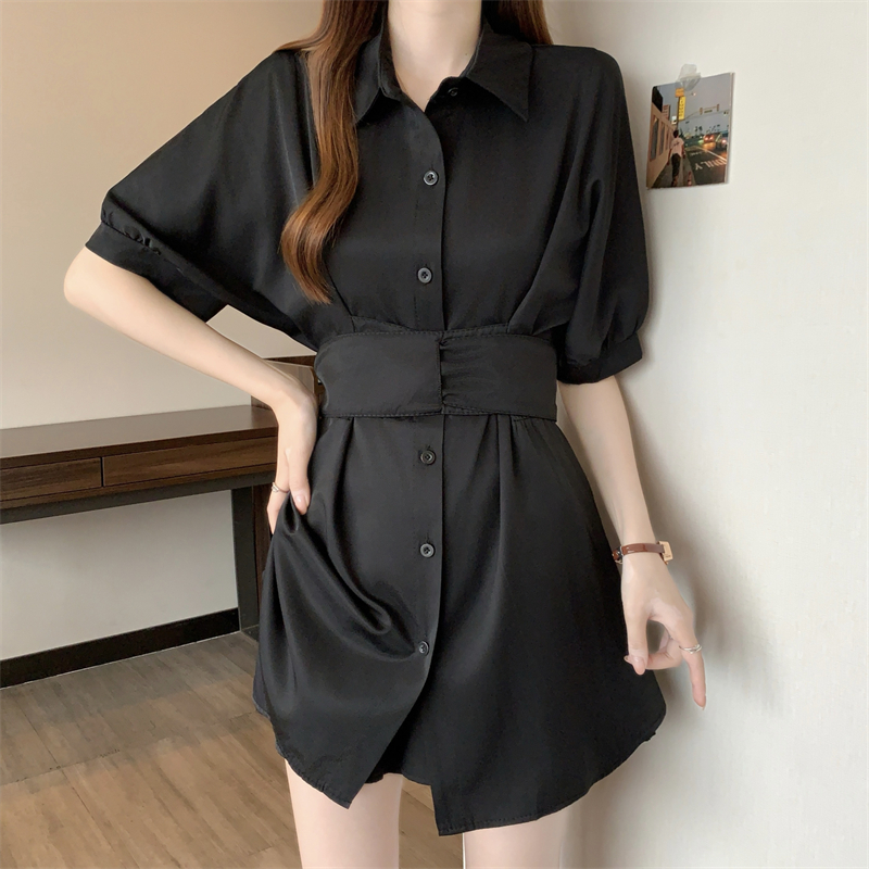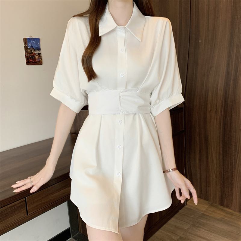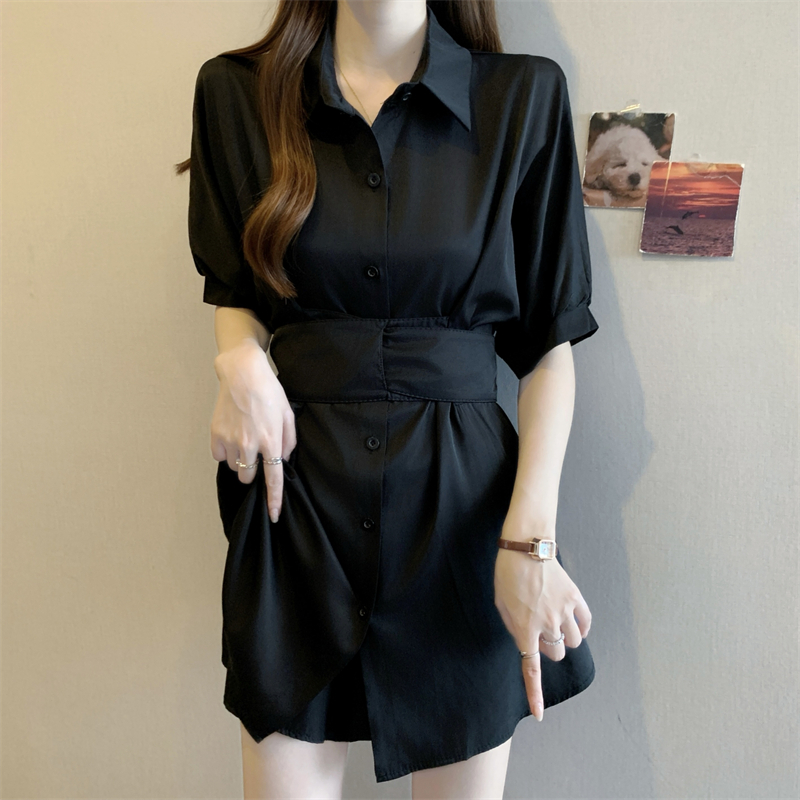 빅 사이즈 셔츠 세트 여성 여름 새로운 품격 허리 수축 POLO 칼라 셔츠 맨위 캐주얼 반바지 투피스 세트