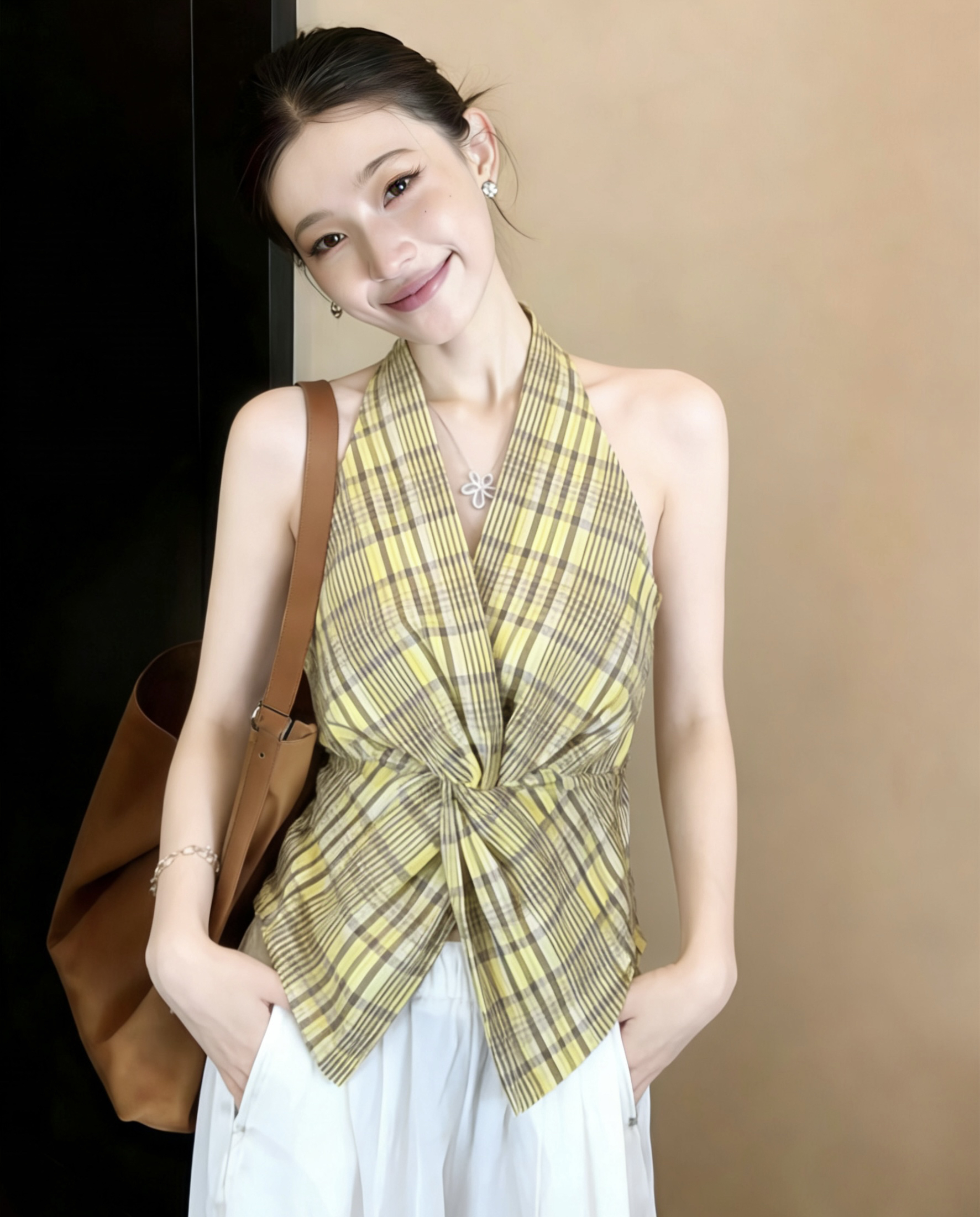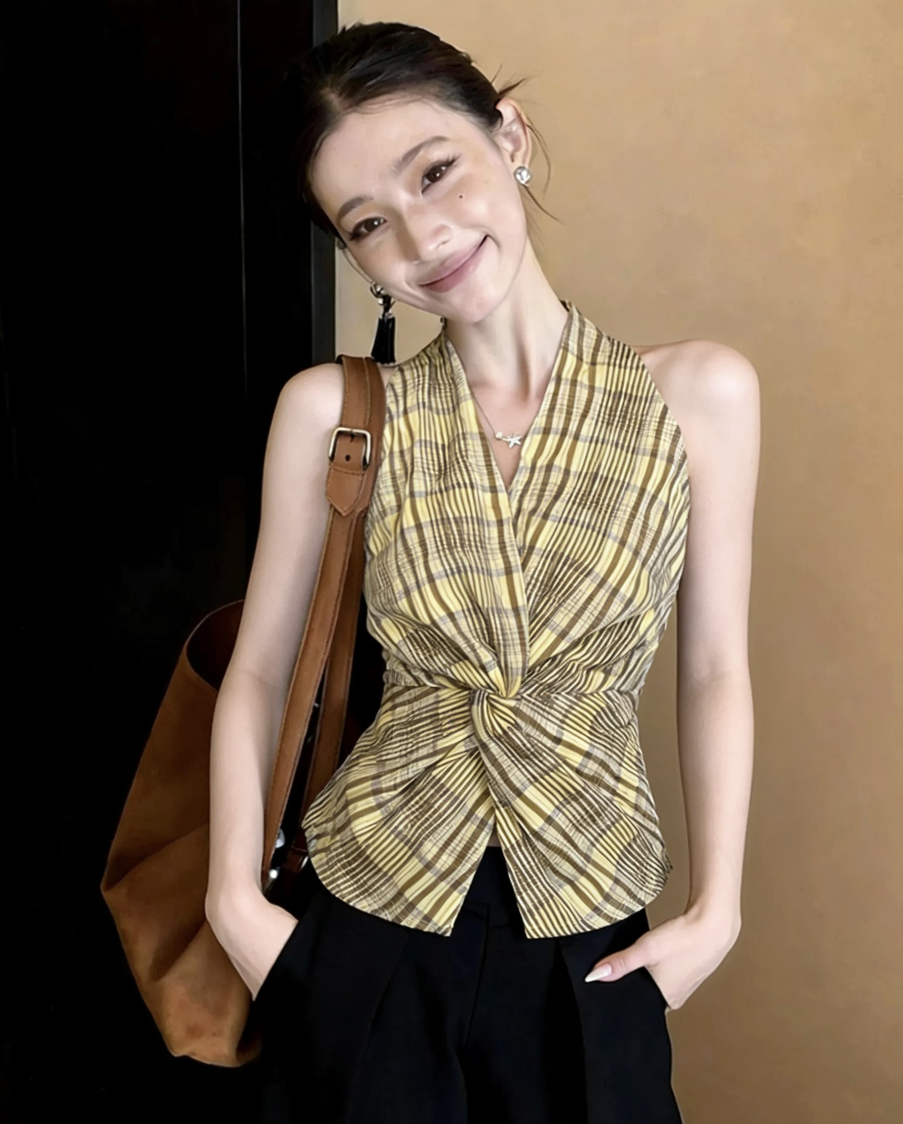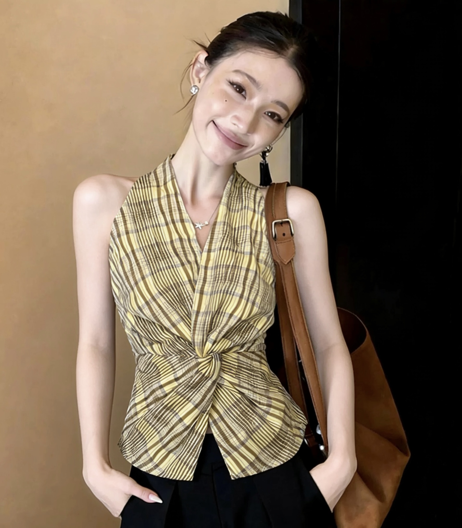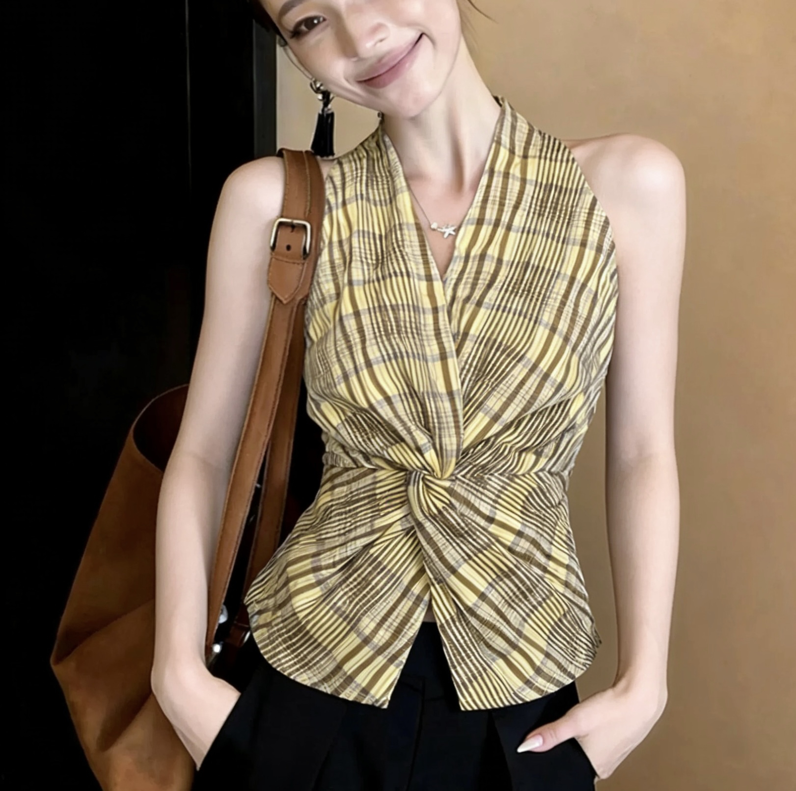 닝 부문 ll 체크무늬 비틀림 V넥 행침 목 조끼 여성 여름 새로운 한 부서 디자인 센스 쇼트 스타일 슬림해 보이는 민소매 켜기