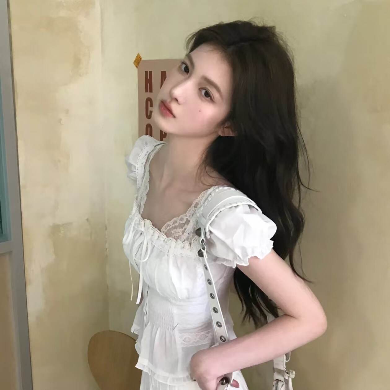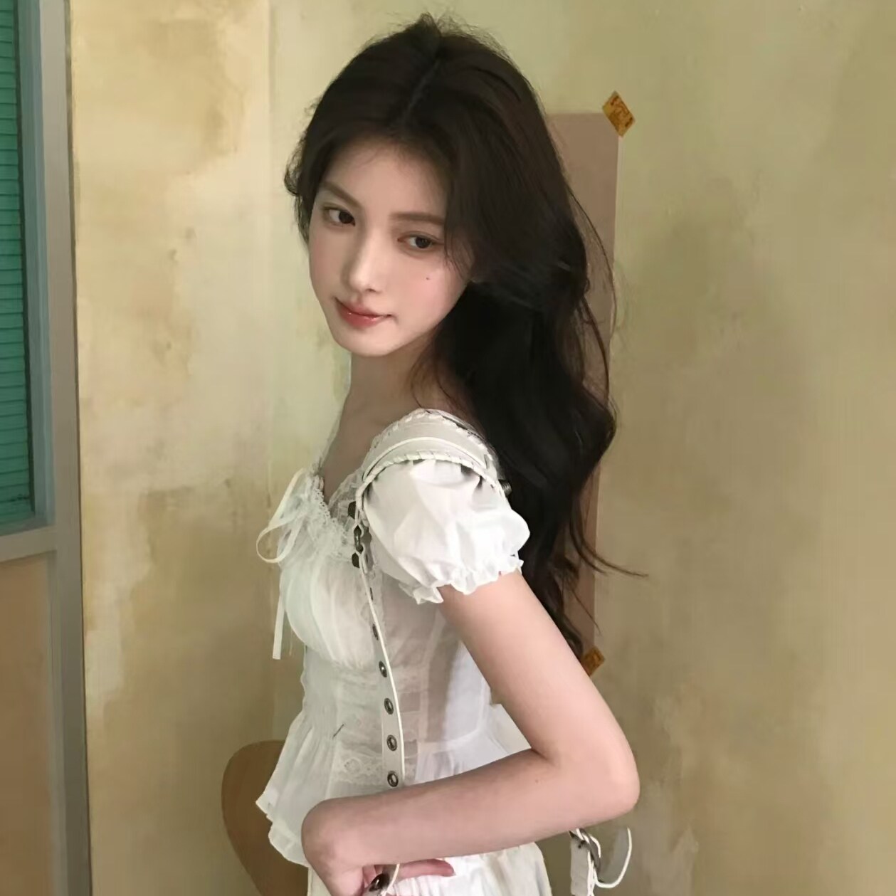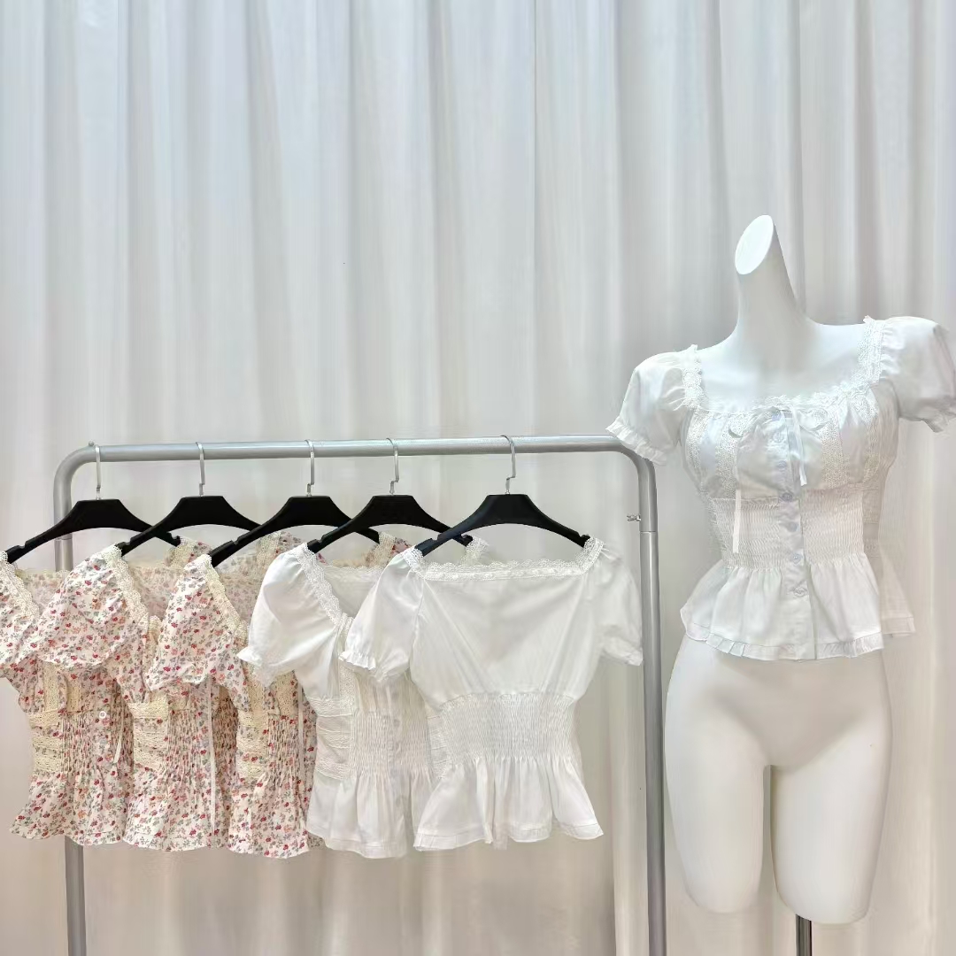송 긍정적 인 En 화이트 V넥 레이스 레이스 스트랩 긍정적 인 어깨 반팔 티셔츠 여성 여름 몸매 가꾸기 고유 한 슈퍼 잘 생긴 맨위