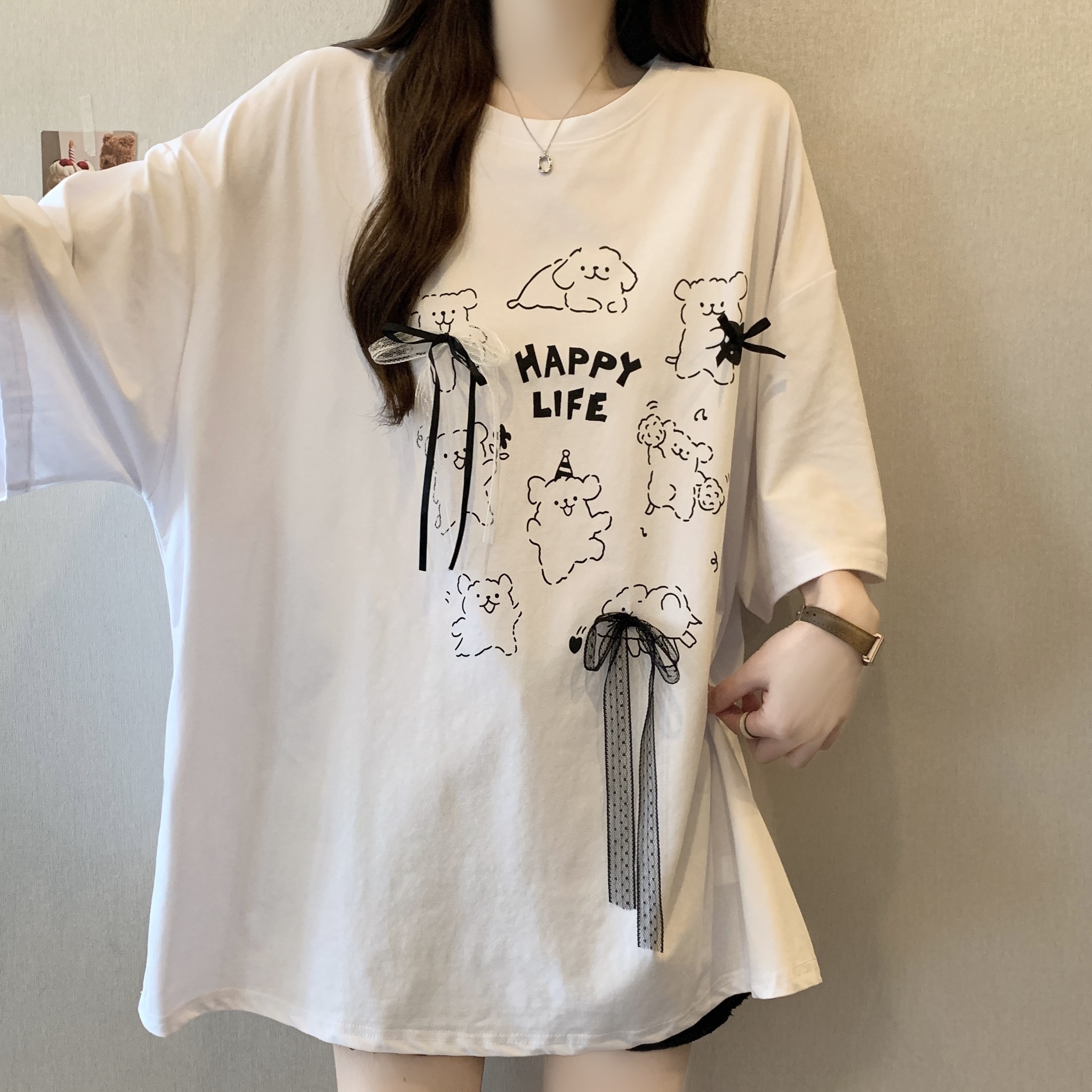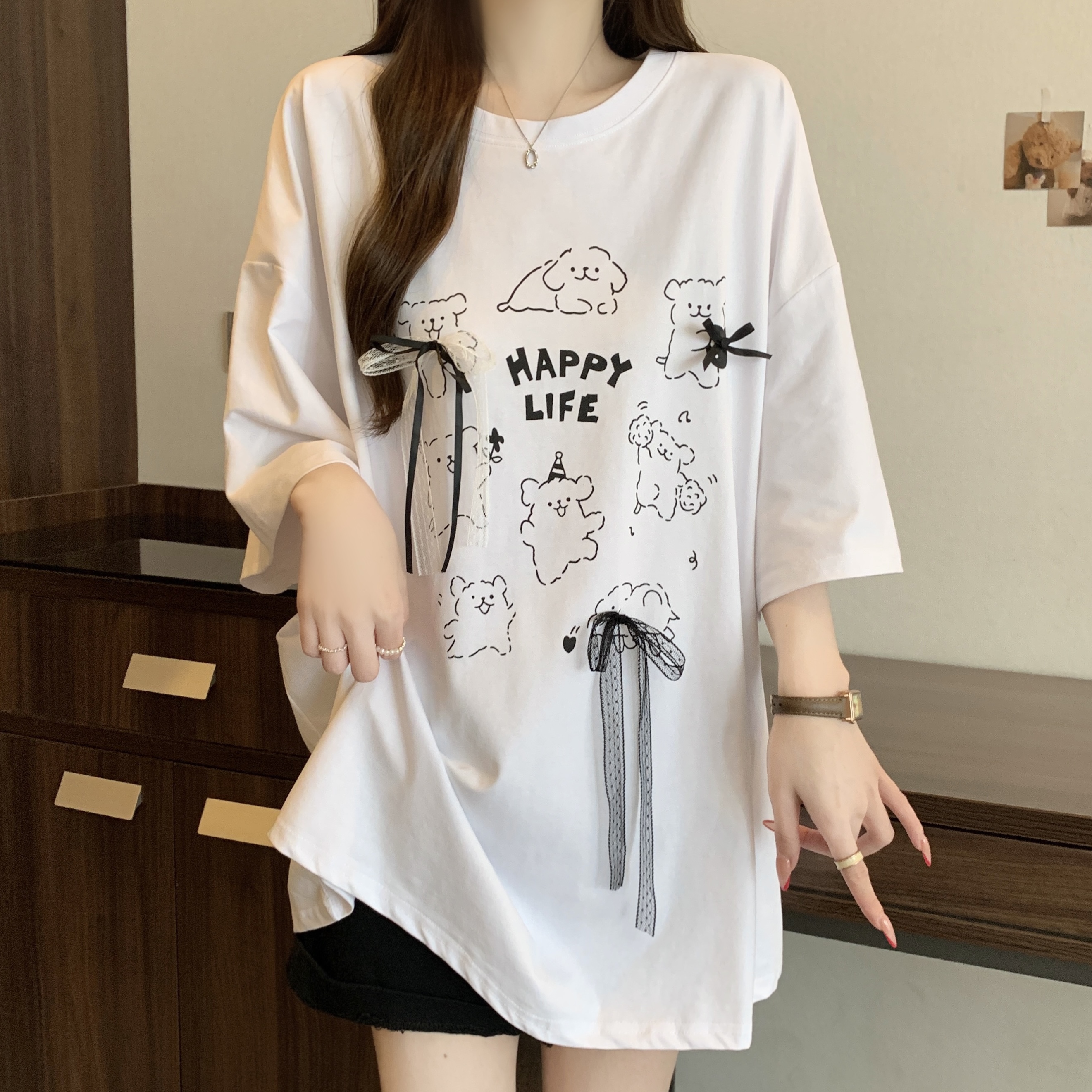 실사 2818# 빅 사이즈 마이크로 지방 캐주얼 작은 대중 화이트 패션 패치워크 레이스 레이스 티셔츠 루즈핏 외국 가스 맨위