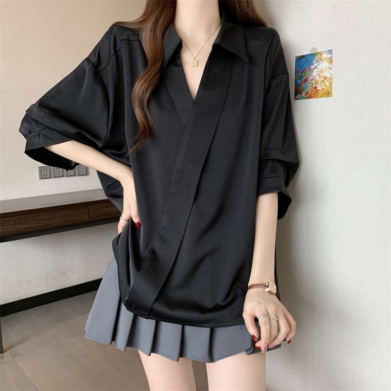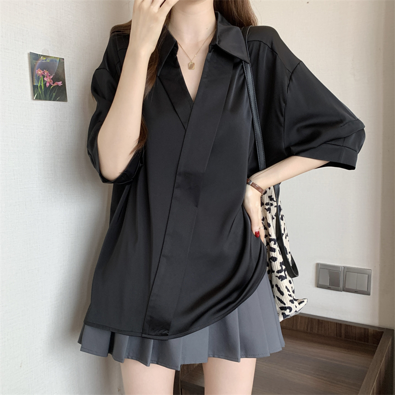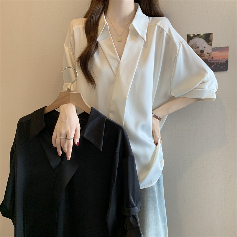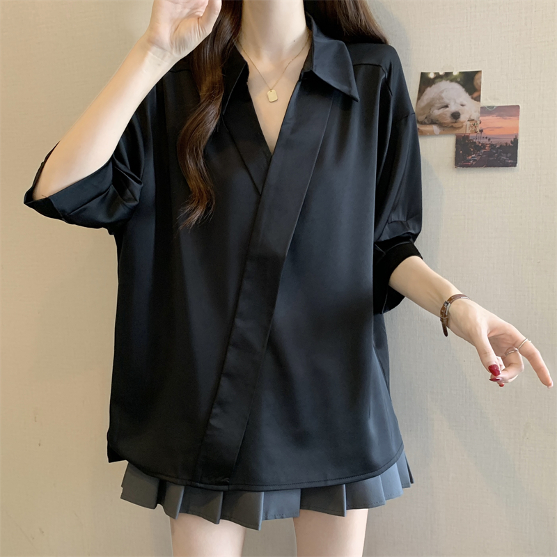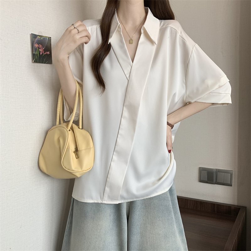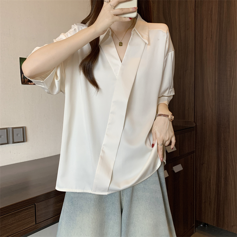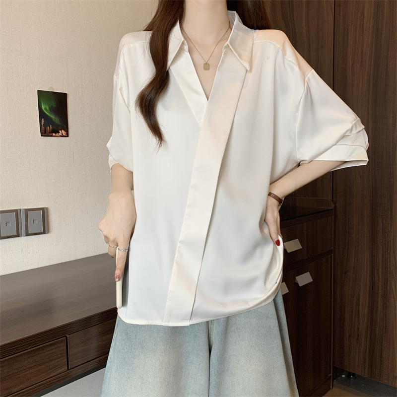 빅 사이즈 반팔 여성 셔츠 여름 새로운 지방 mm 아세트산 새틴 디자인 센스 작은 대중 불규칙 V넥 맨위