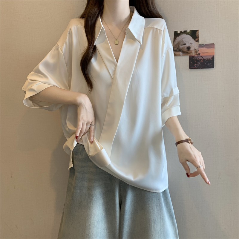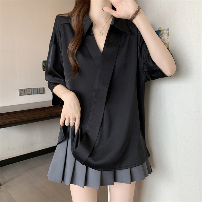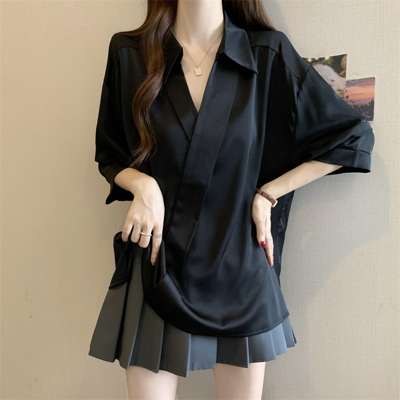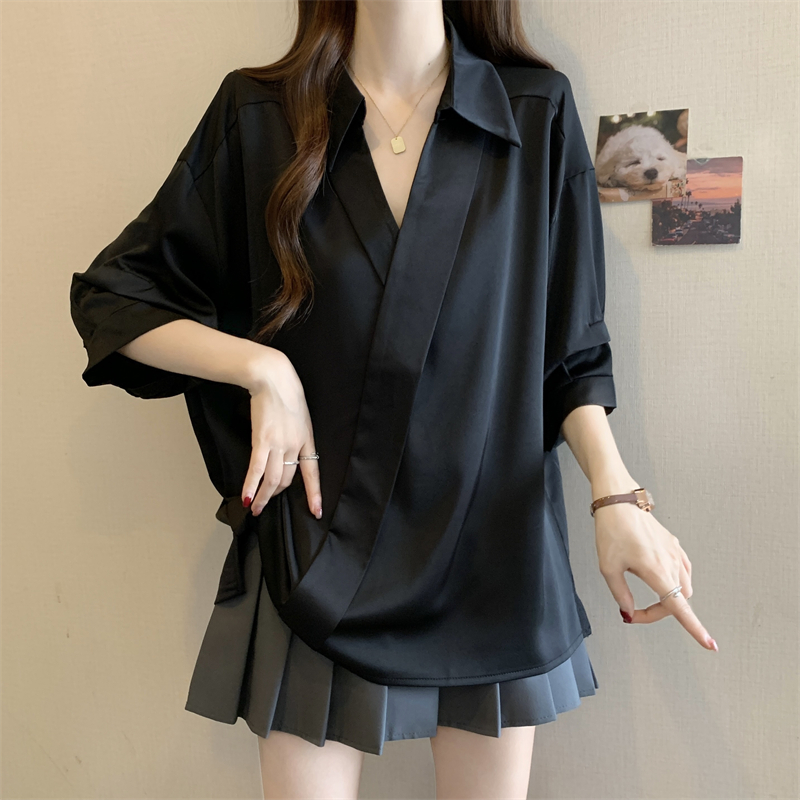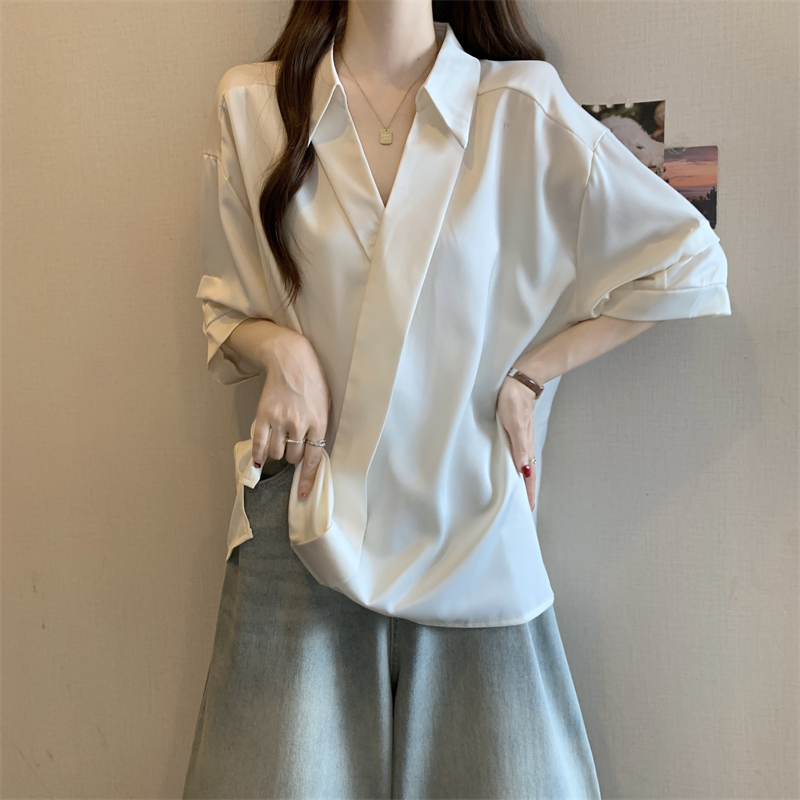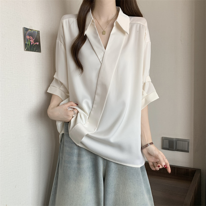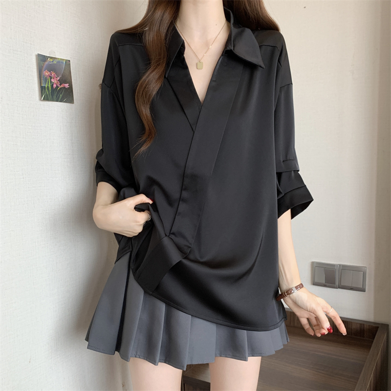 빅 사이즈 반팔 여성 셔츠 여름 새로운 지방 mm 아세트산 새틴 디자인 센스 작은 대중 불규칙 V넥 맨위