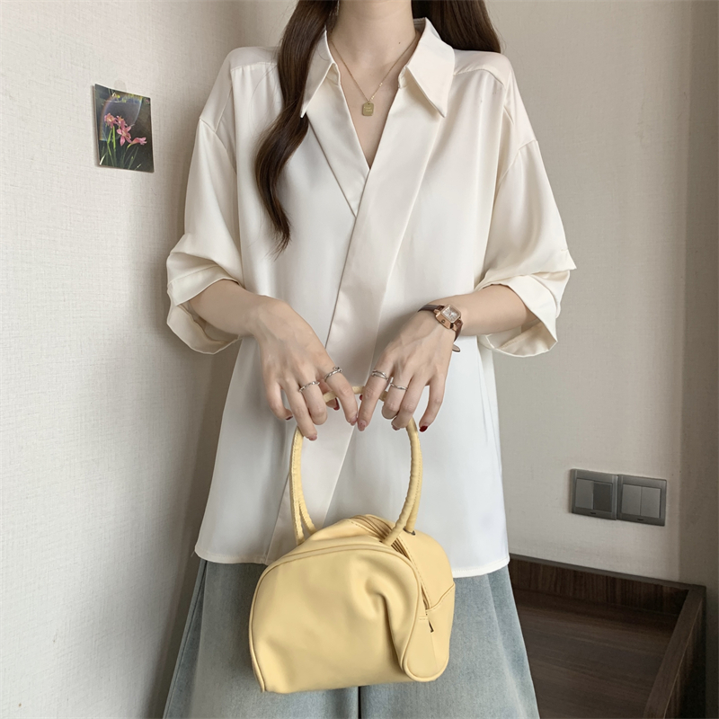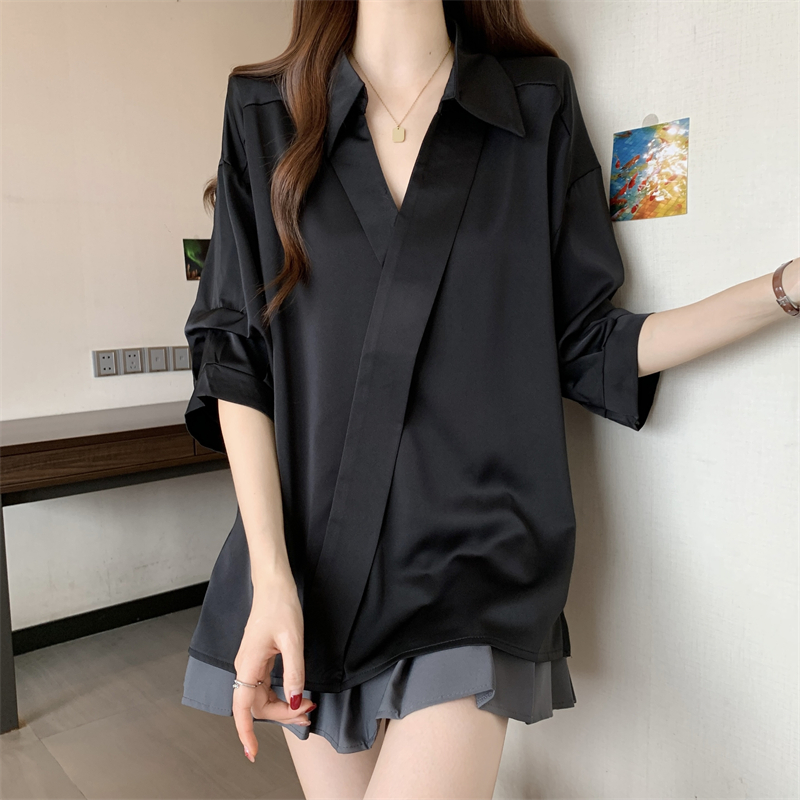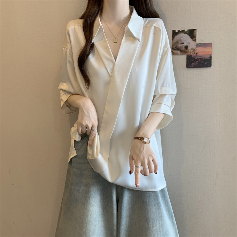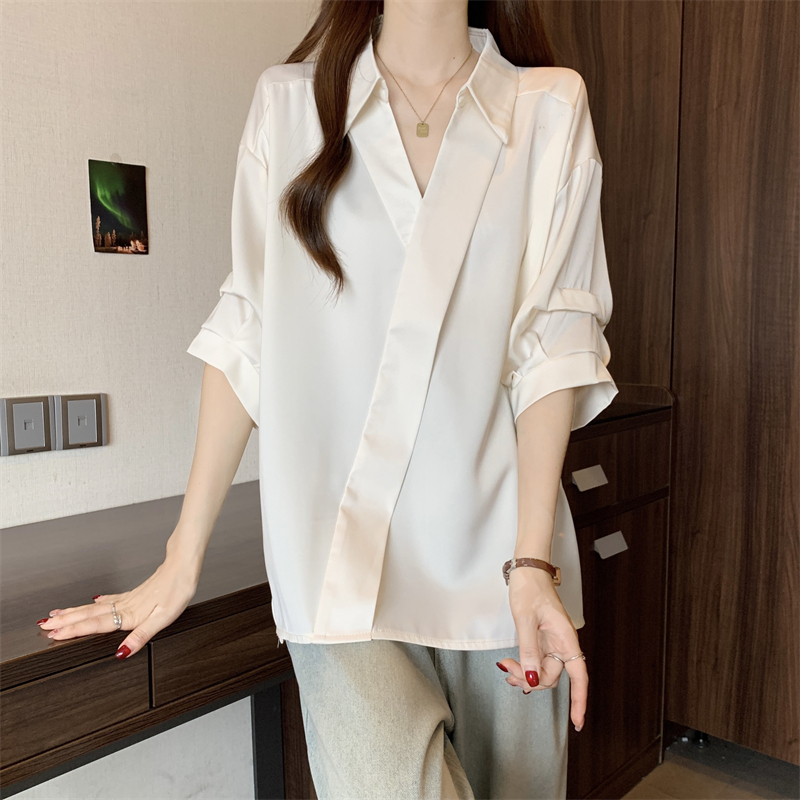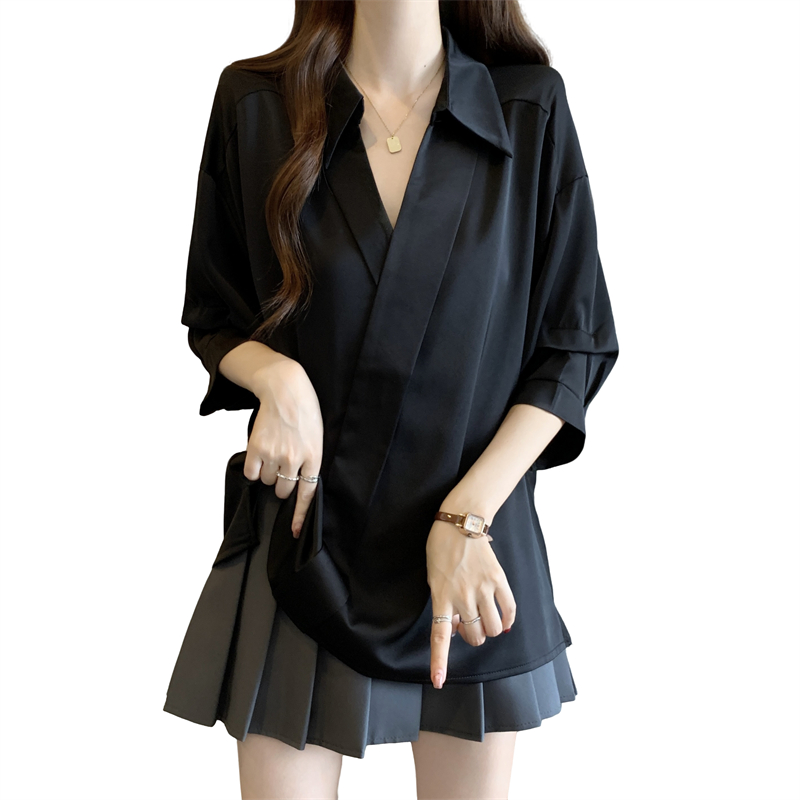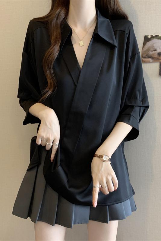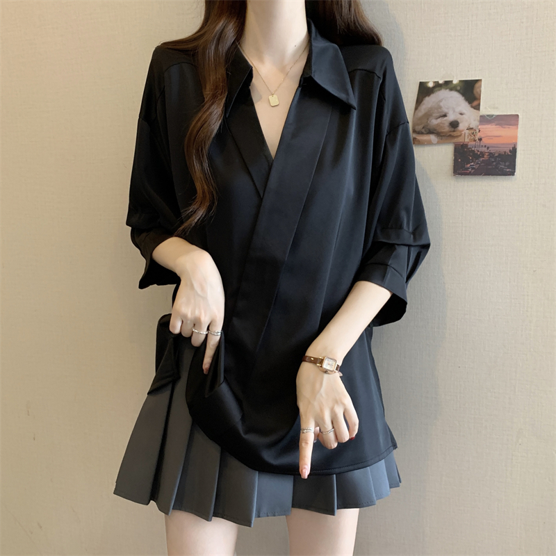 빅 사이즈 반팔 여성 셔츠 여름 새로운 지방 mm 아세트산 새틴 디자인 센스 작은 대중 불규칙 V넥 맨위
