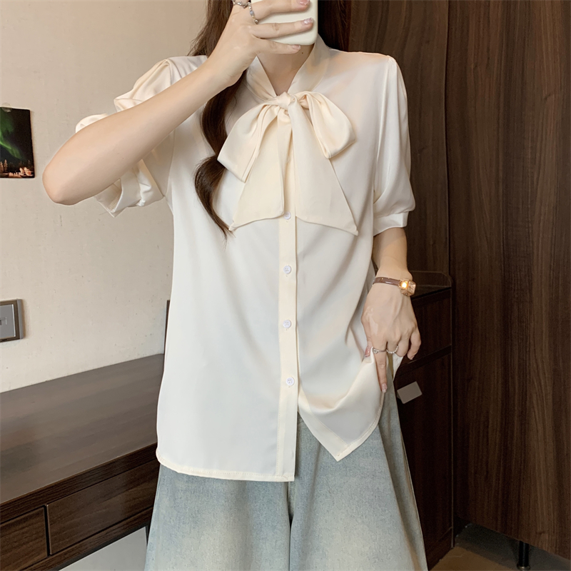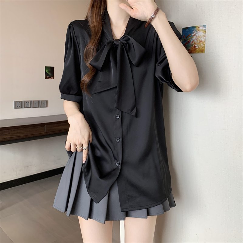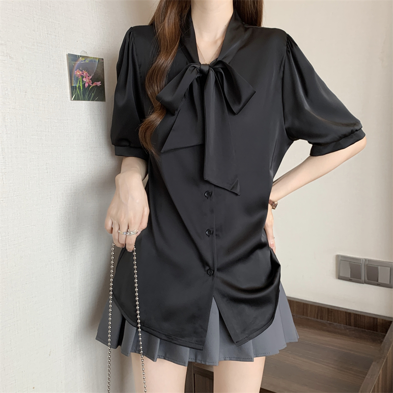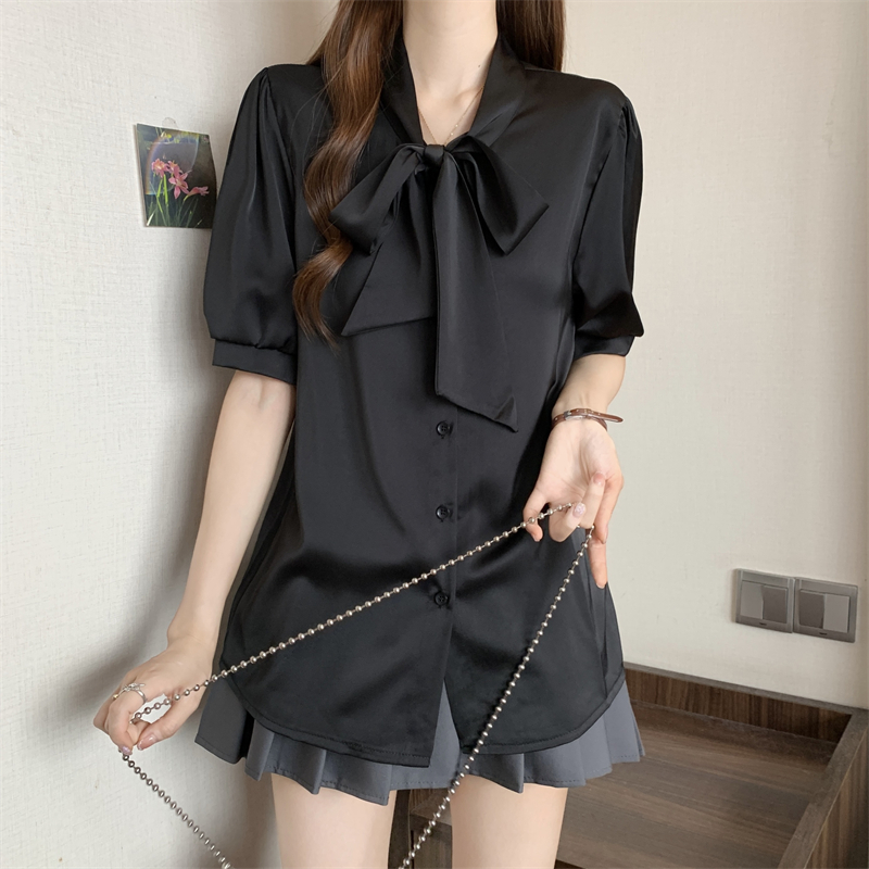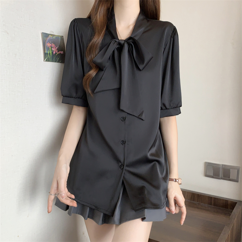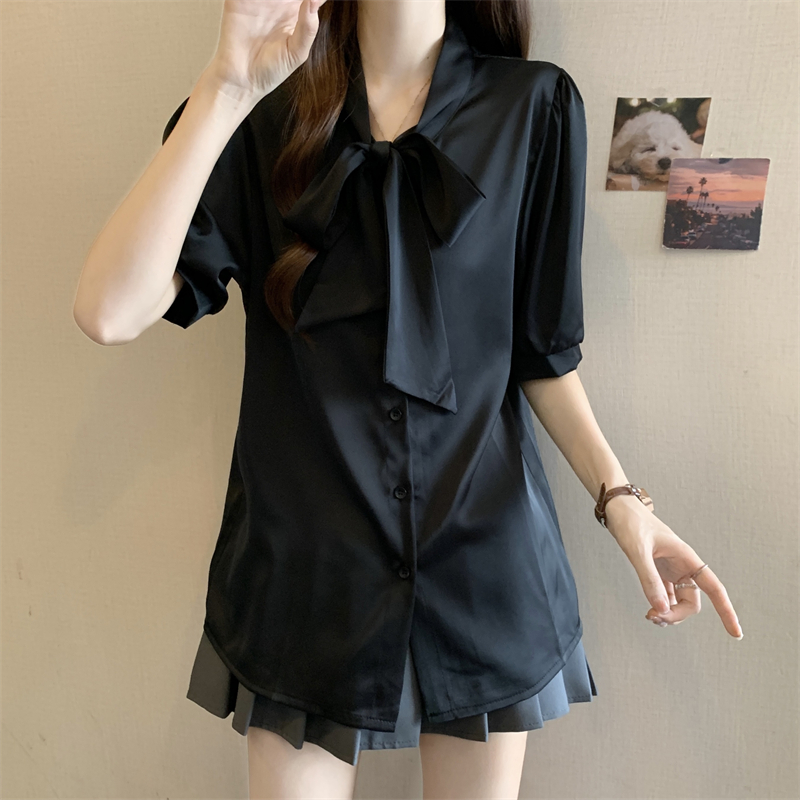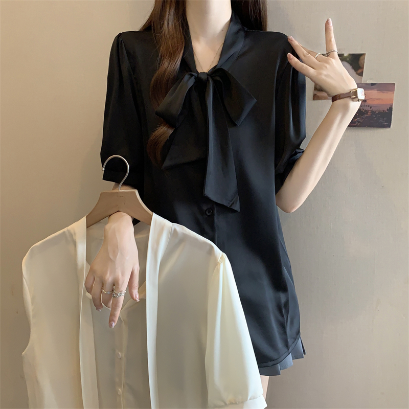 빅 사이즈 나비 매듭 여성 셔츠 여름 지방 mm 고급 센스 반팔 새틴 셔츠 쉬폰 톱